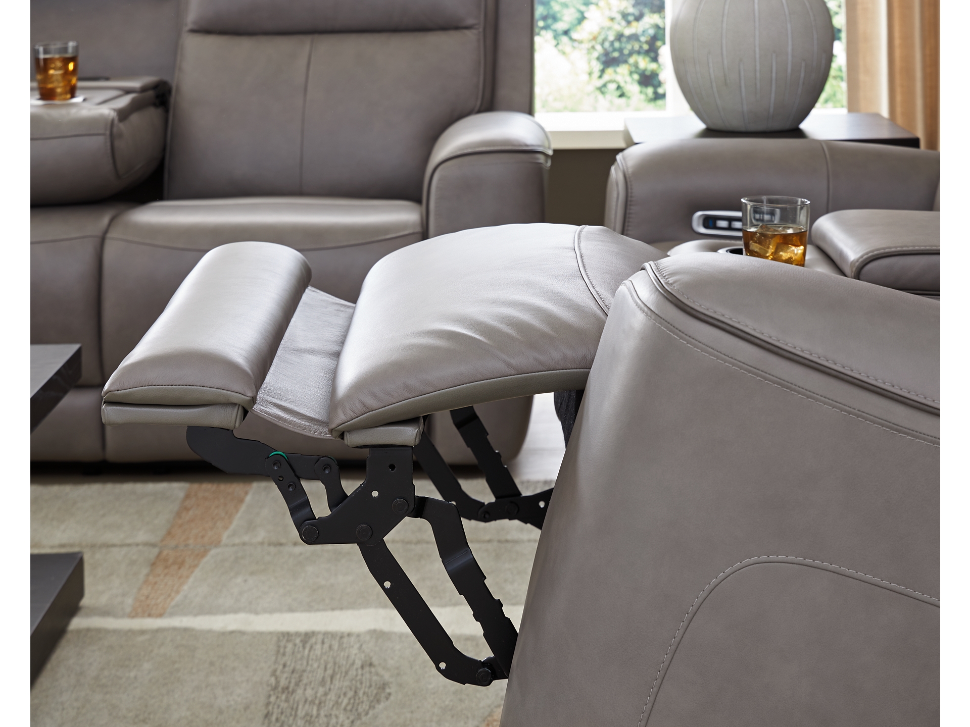 • Genuine leather covers inside areas such as the back, seat and arm cushions; skillfully matched faux leather covers the remaining areas