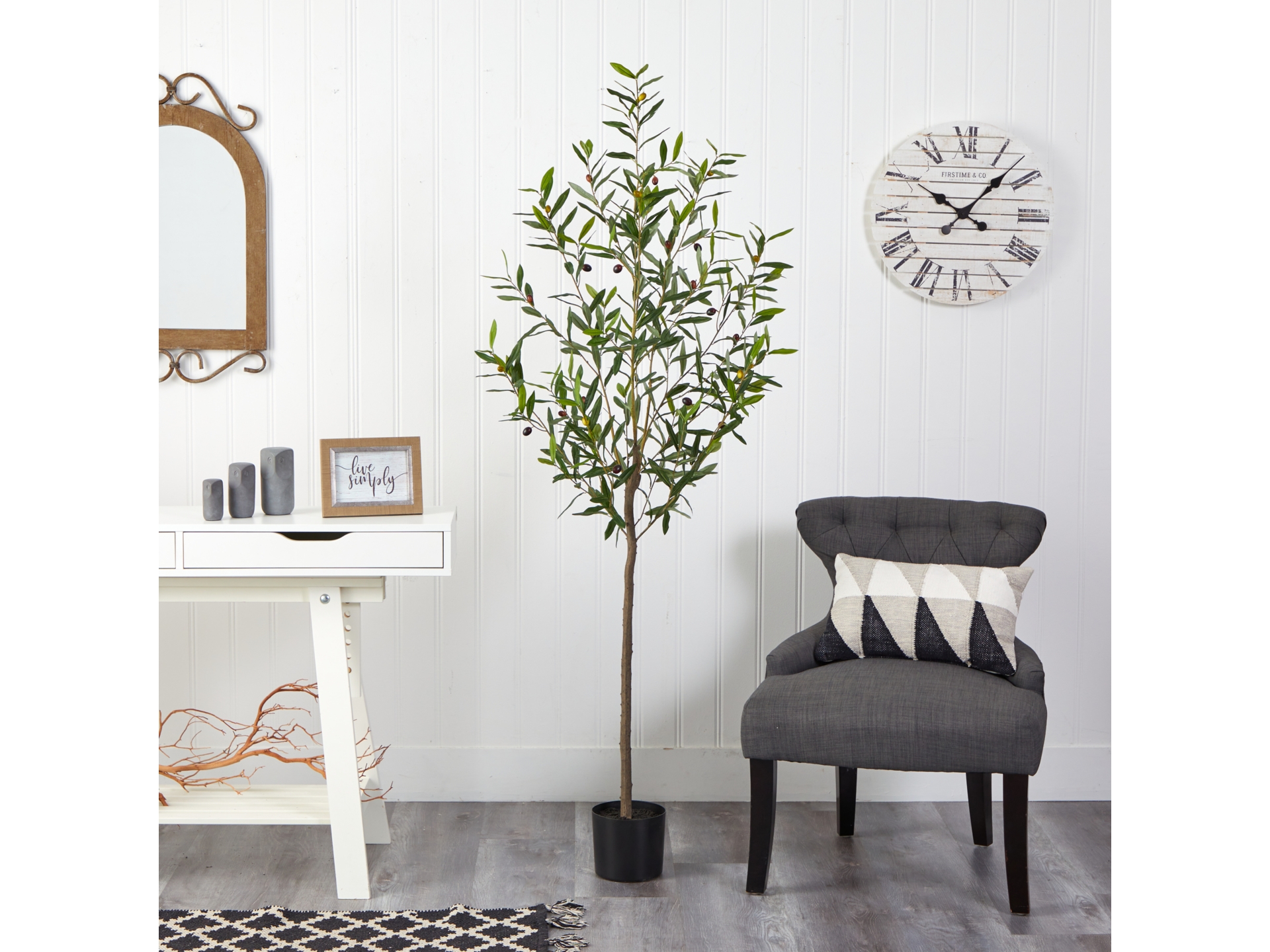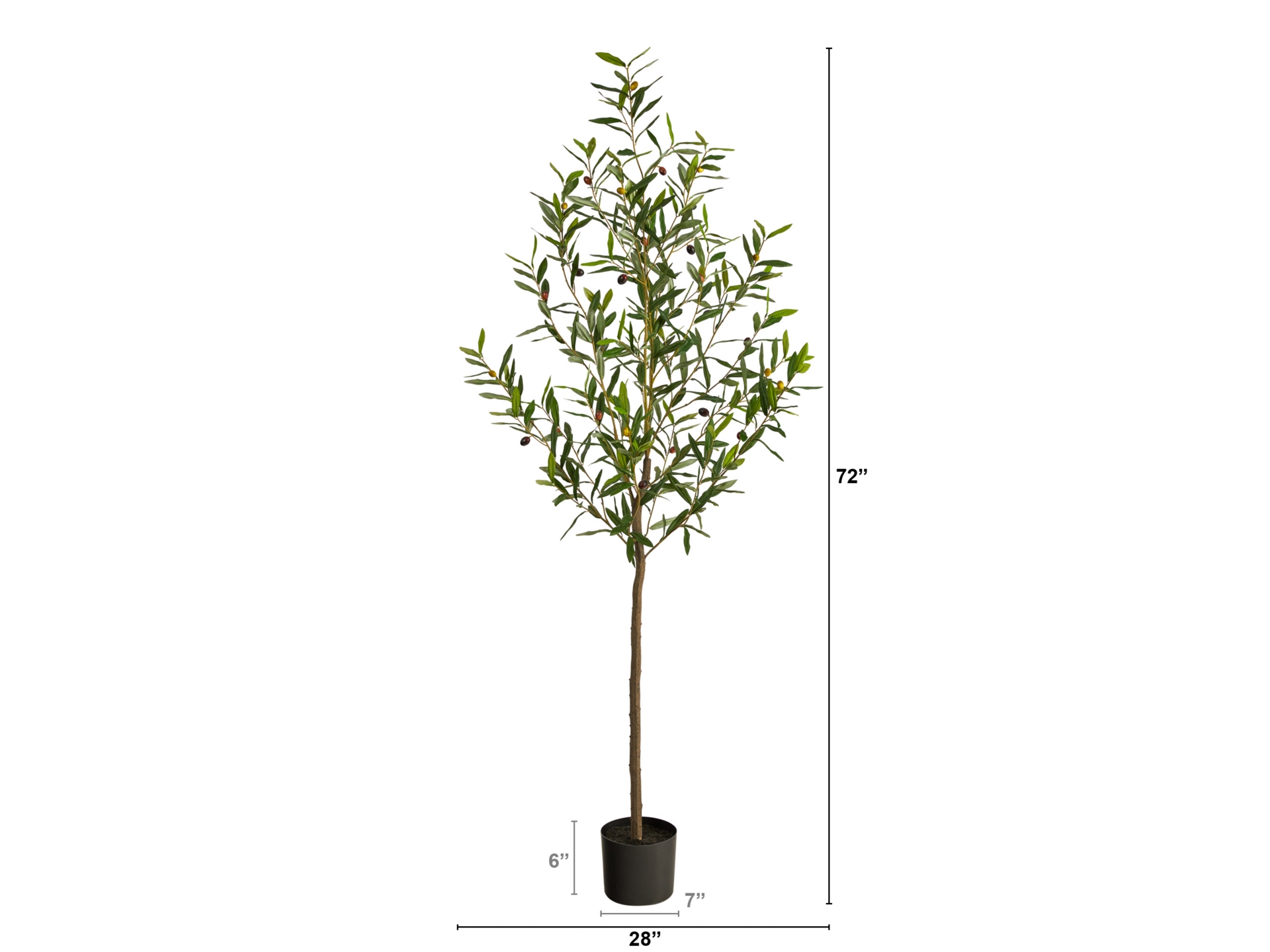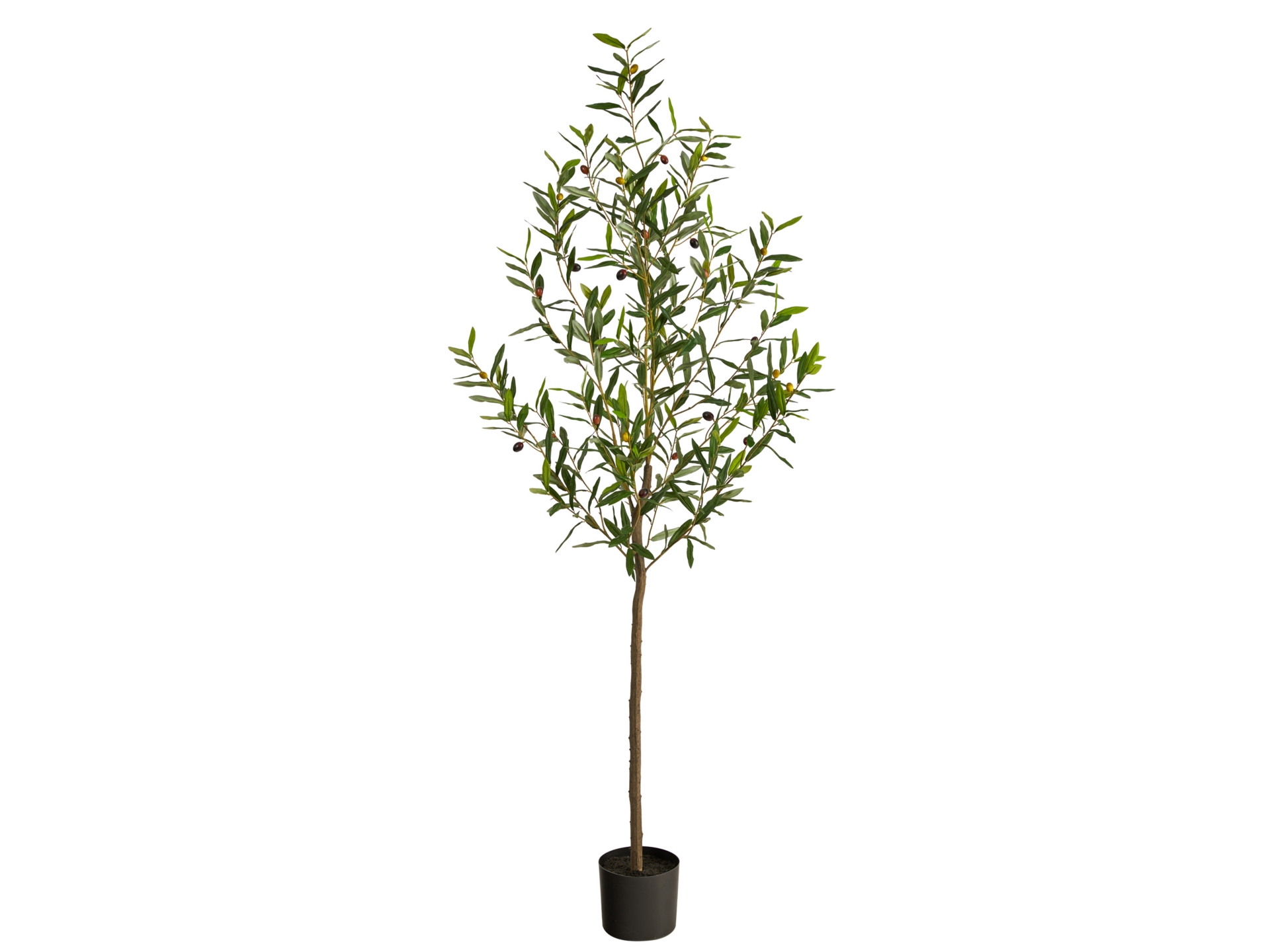 Walk through the Italian countryside with this fine and delicate Olive Artificial Tree. Featuring a thin brown trunk that splits into stems, this fake tree elegantly displays faux leaves and is accented throughout with fake olives so realistic that you’ll want to eat them. Standing 6′ from a nursery planter (included in height), curate in compact and tight spaces like apartments, awkward corners, and bathrooms. This best-seller is perfect for minimalist, mid-century modern, boho and homes that need a delicate touch.