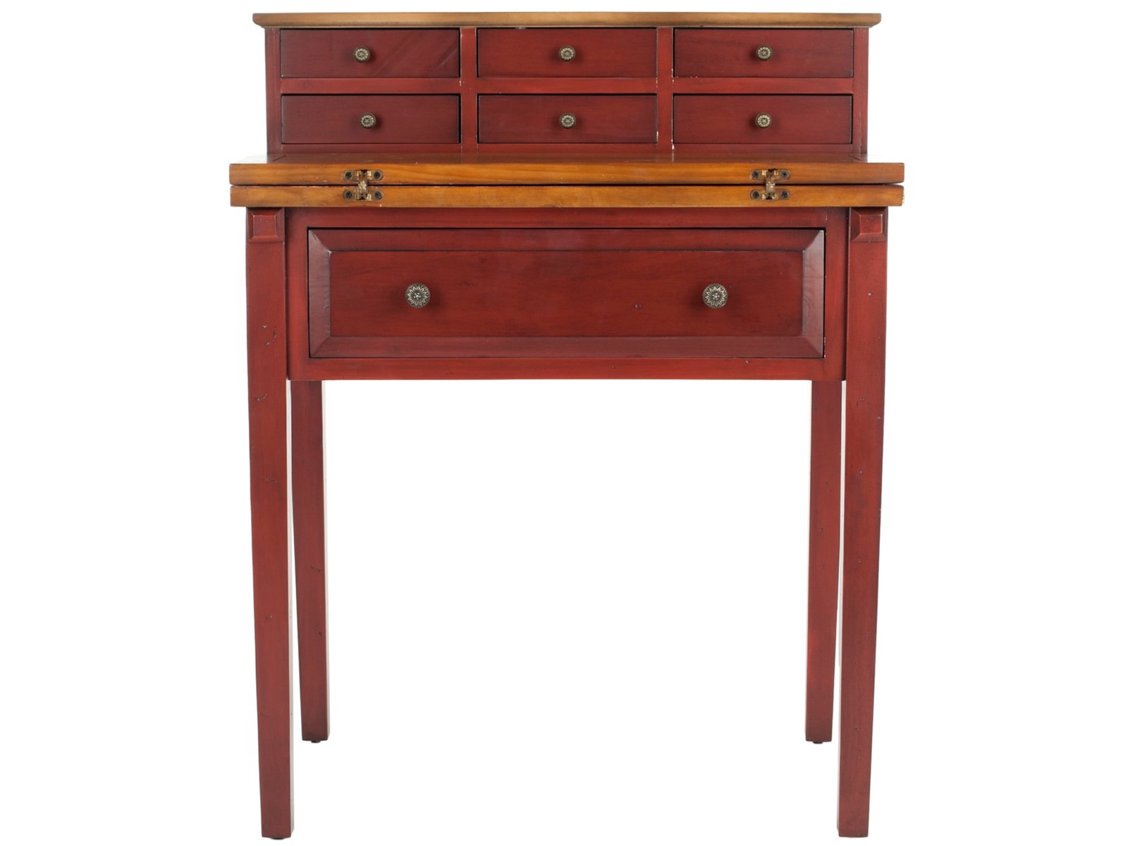 Work in style and convenience with the Abigail 7-drawer fold down desk. Modeled after an antique roll top desk, but with 21st century appeal, this desk is charming and functional. Its fold-down top gives you the option of opening up an instant workspace when needed. Six small drawers are ideal for organizing desk supplies and the large bottom drawer is handy for keeping notepads and more within reach. The honey oak writing surface beautifully contrasts with the cherry finish. Designed for small spaces, this desk is perfect for creating an instant office in the bedroom, kitchen, guest room or anywhere in between.