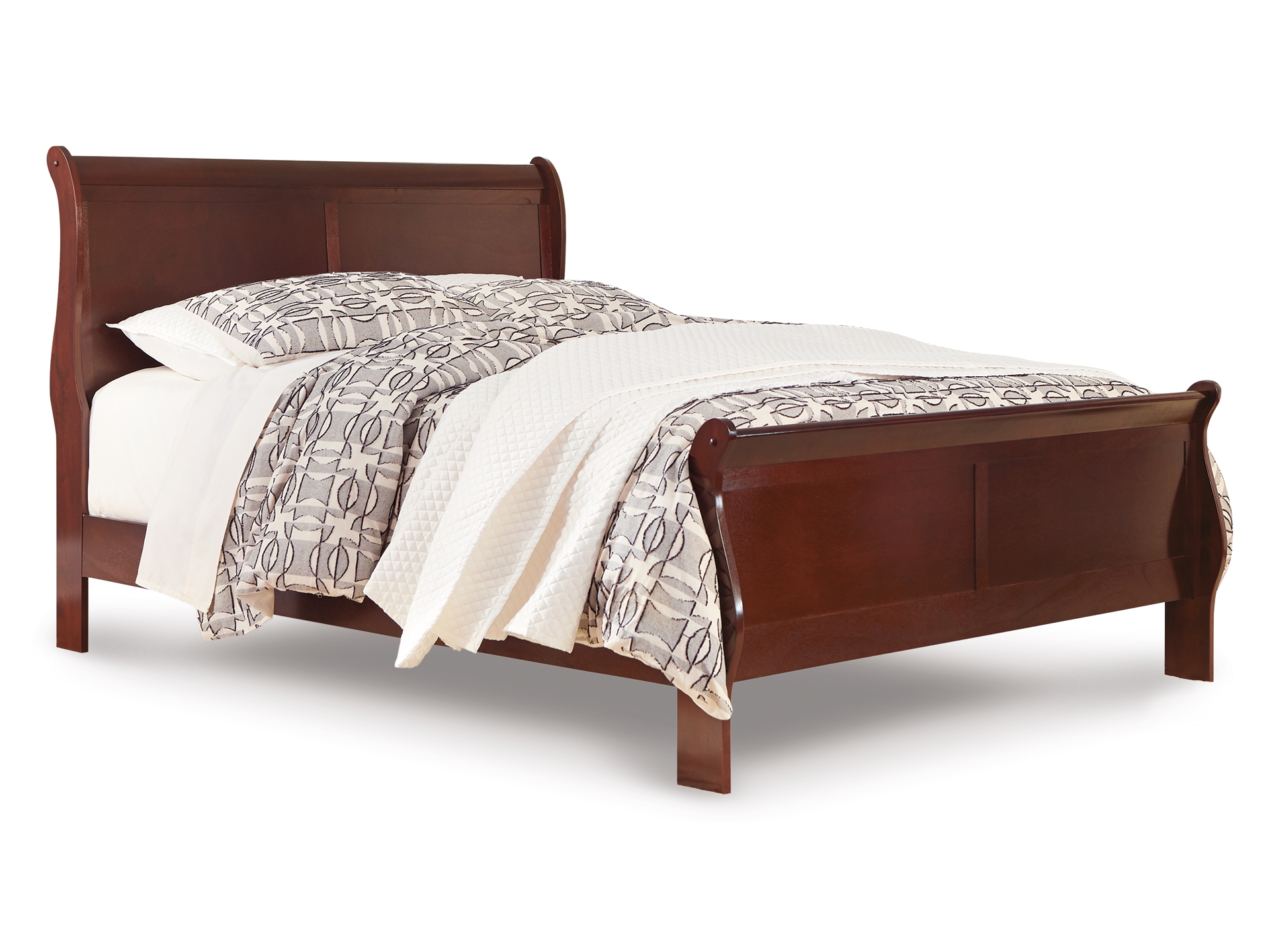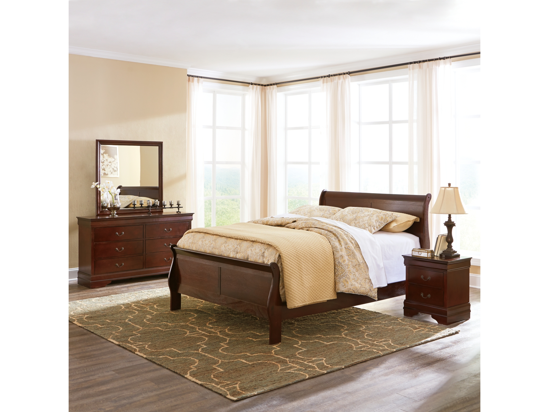 The Alisdair 5-piece bedroom set is the epitome of traditional decor. Its Louis Philippe-style moulding dates back to the mid-19th century, when furnishings were lavish yet somewhat simple. A rich, complex finish is sure to grace your space with warmth and elegance. Includes queen sleigh bed with picture frame panels and a pair of nightstands, each with two drawers and antiqued pulls. Mattress and foundation/box spring available, sold separately.