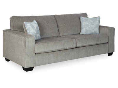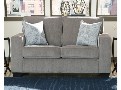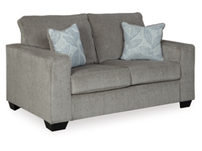 If style is the question, then the Altari sofa and loveseat set is the answer. Sporting clean lines and sleek track arms, the decidedly contemporary profile is enhanced with plump cushioning and a chenille-feel upholstery that’s so pleasing to the touch. Sure to play well with so many color schemes, this sofa and loveseat set in richly neutral alloy includes understated floral pattern pillows for fashionably fresh appeal.