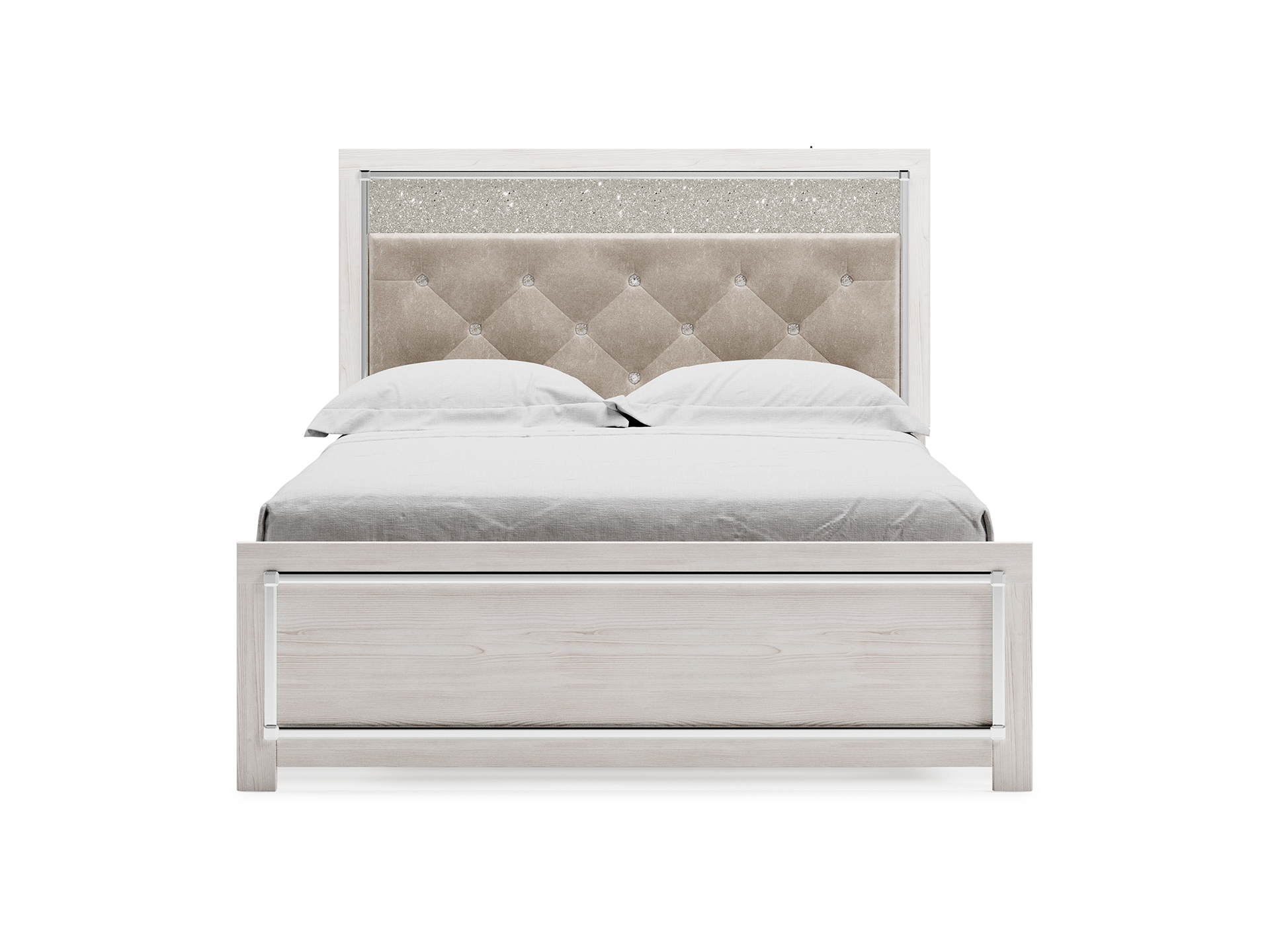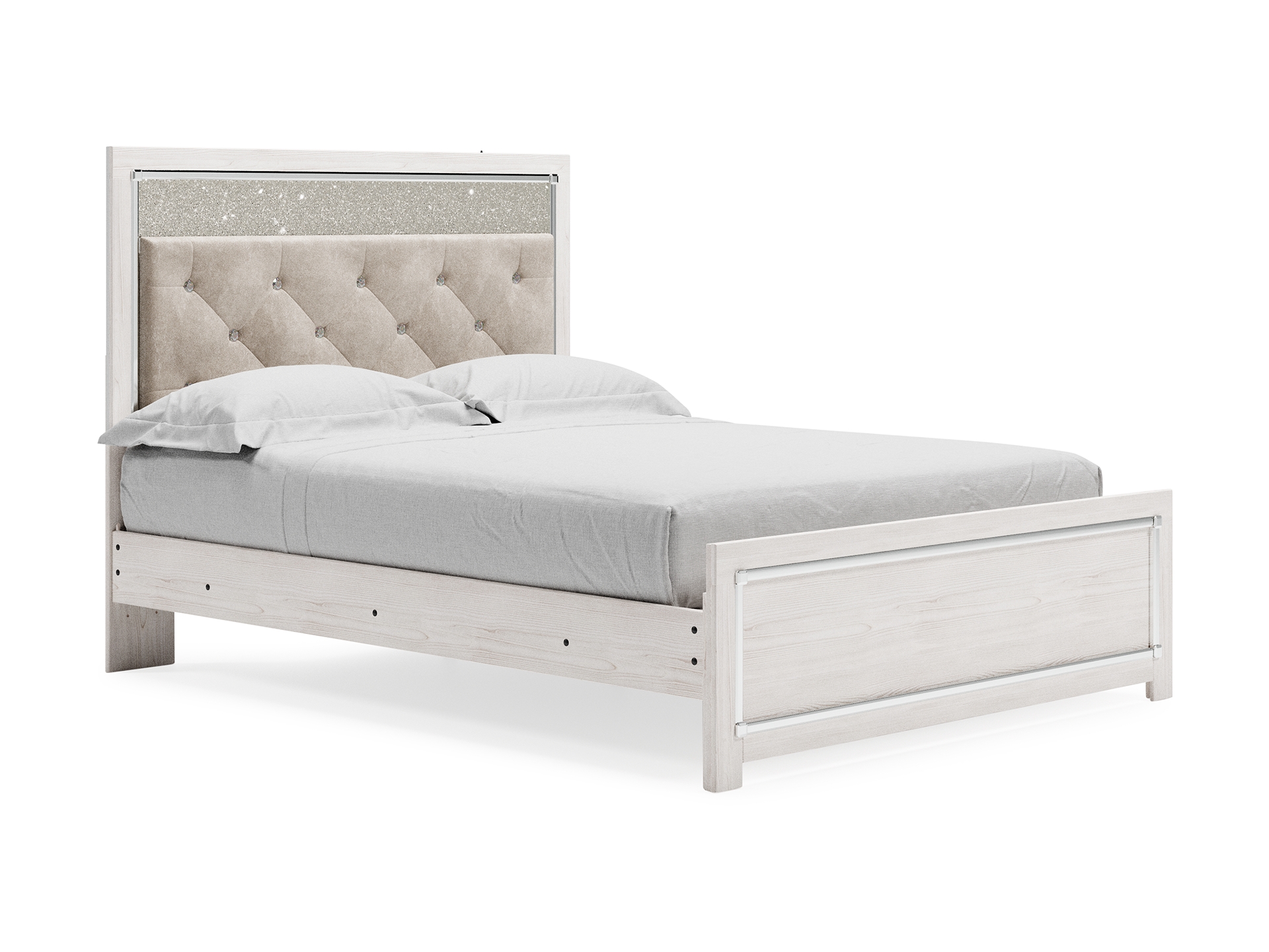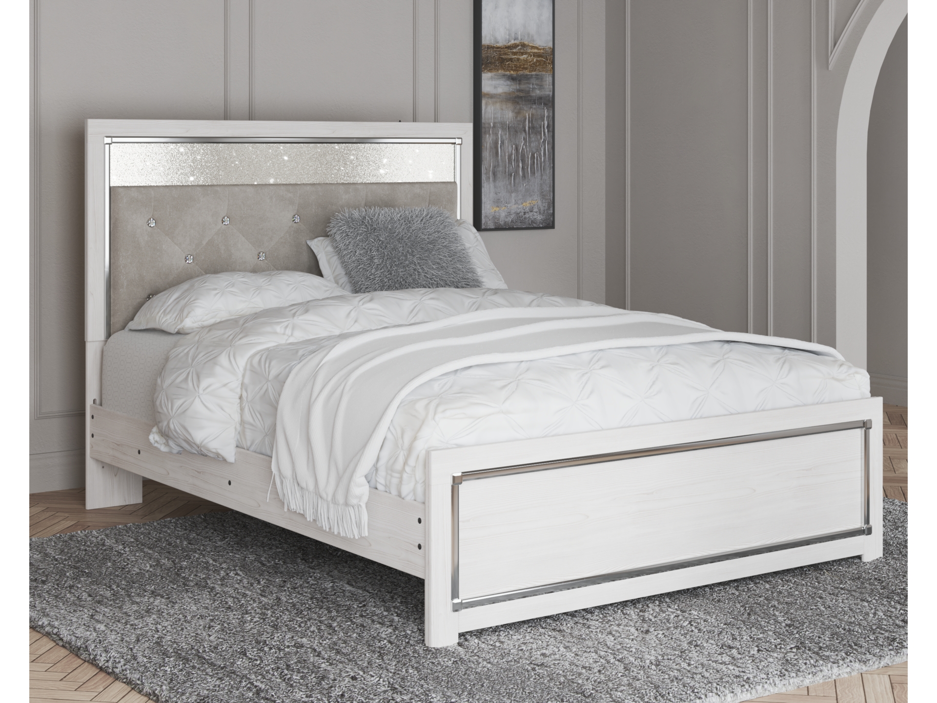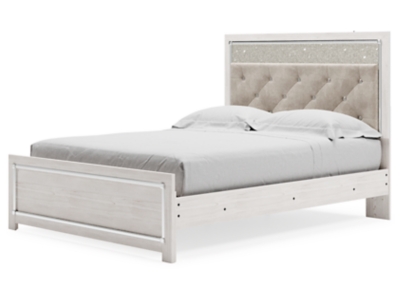 The epitome of fashion-forward design, the Altyra queen upholstered panel bed is a beautiful blend of comfort and luxury. Shiny chrome-tone accents, a pearlized finish and button-tufted upholstery bring a glam touch to the richly rustic appearance. Remote-controlled LED lighting adds style and modern conveniences to your restful retreat.