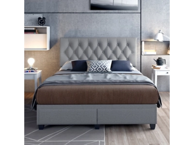 Timeless and functional, this upholstered storage platform bed provides 2 large storage drawers to help keep your space organized. Euro side glides on the drawers ensure smooth opens every time. The headboard features classic button-tufting and the bed is completely upholstered and slightly padded for a premium look and feel. The storage drawer deck comes preassembled and provides solid support at the foot of the bed. That plus the 8 cross slats provide a durable support system that easily supports up to 700 lbs. No box spring required! The top of the bed sits at just over 11′ high. Entire bed ships in 1 box for easy transport. Bed assembles in under 15 minutes and all hardware is included. Limited 1 Year Warranty.