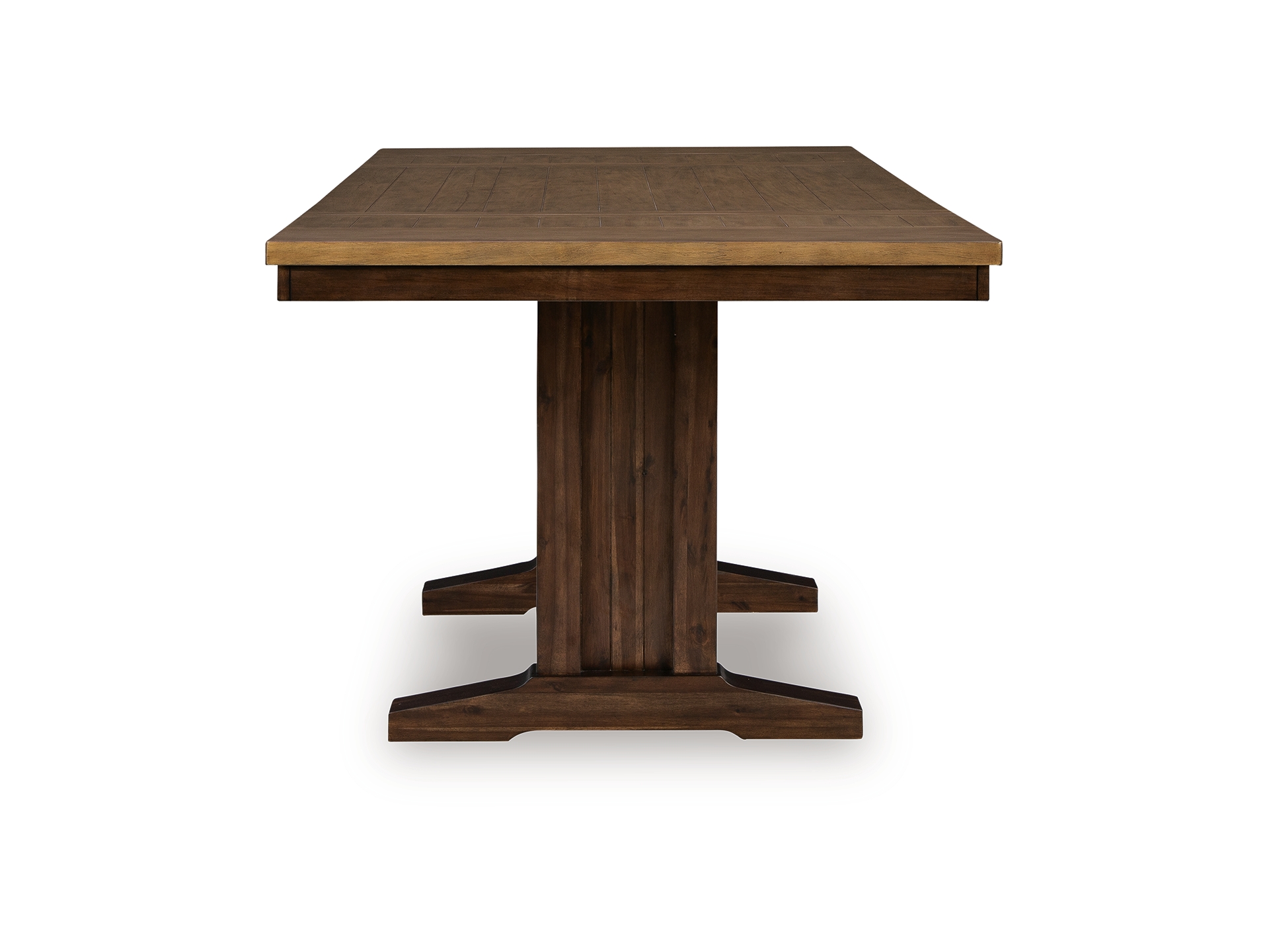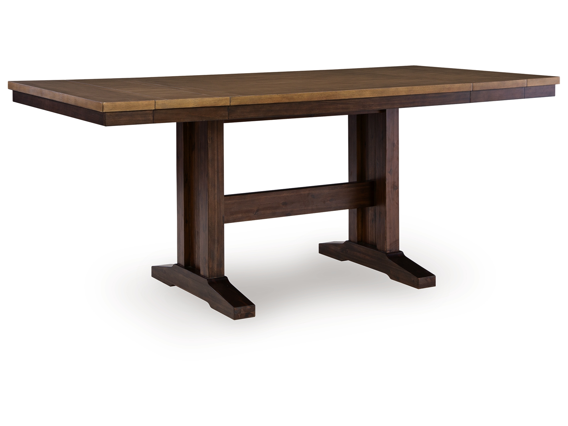 Add a dash of enduring design to your home with the Anixburg counter height dining extension table. Its two-tone look contrasts light and dark chestnut finishes for a touch of casual rustic charm that’s both current and timeless. And how about that beautiful double trestle base? A simply striking choice, this table lends a seamless blend of form and function wherever friends and family gather. Drop in the two extension leaves, and you’ll have room for absolutely everyone.