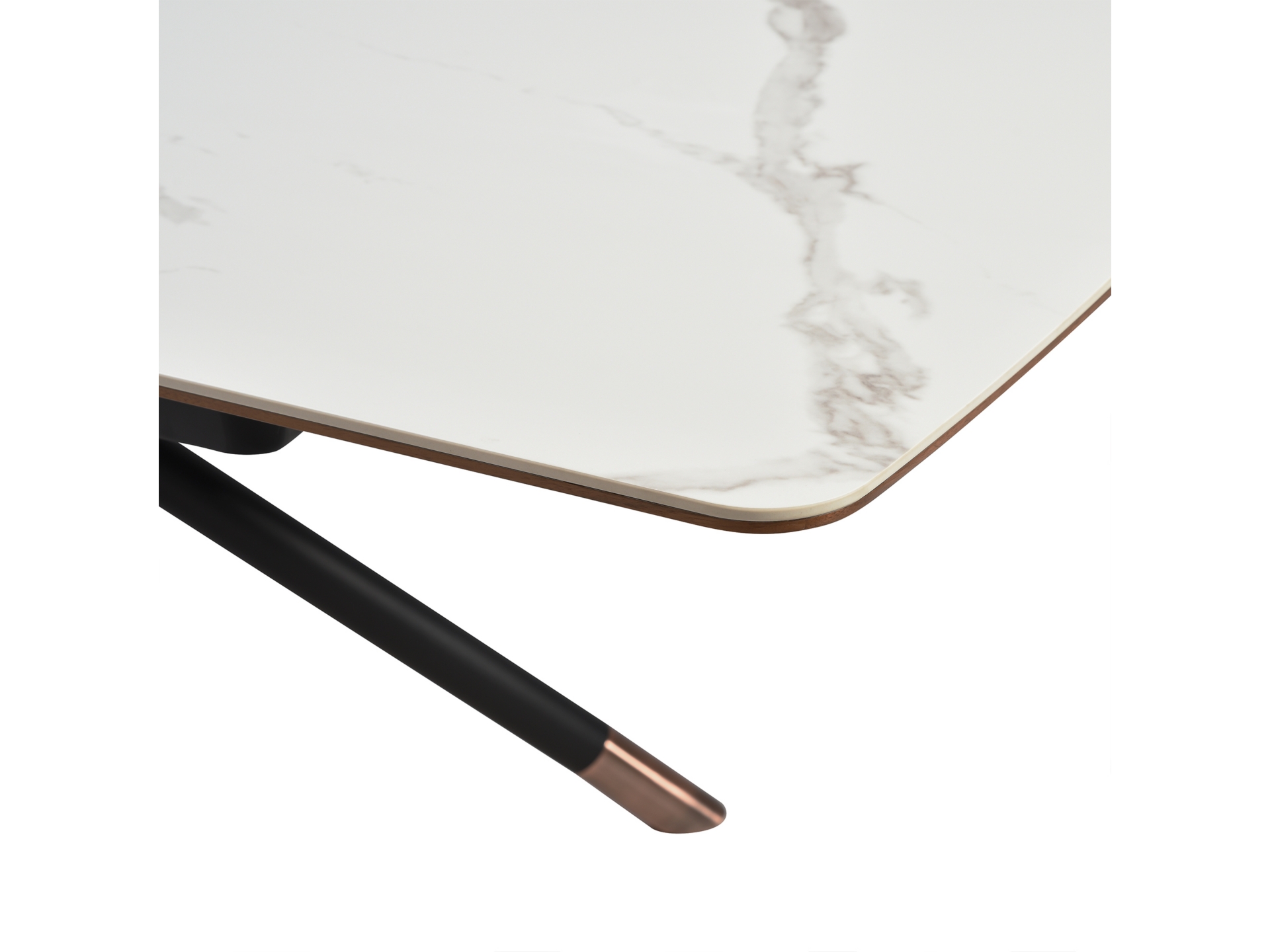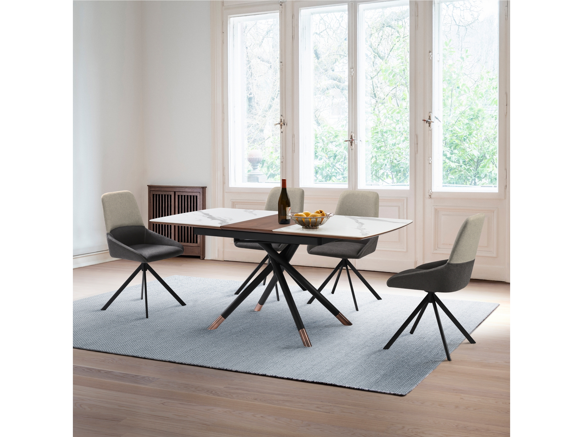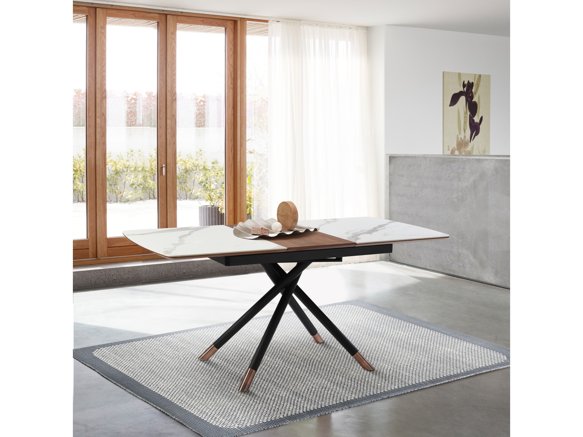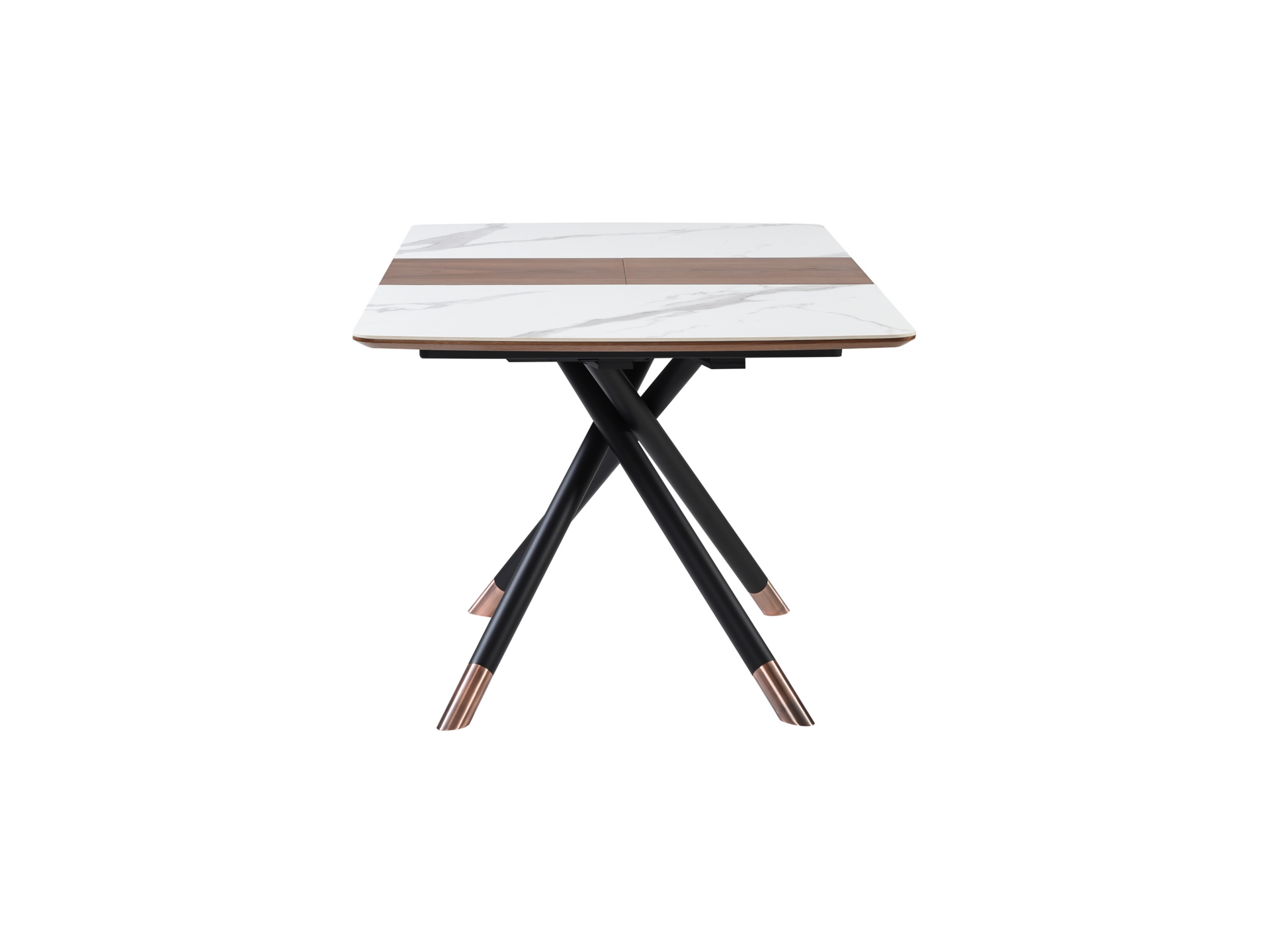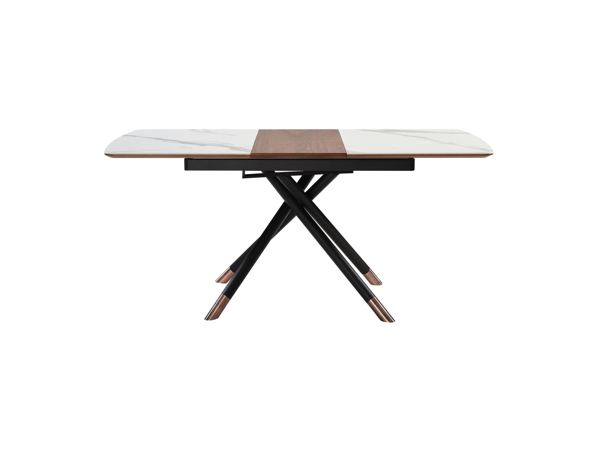 Incorporate a statement piece to your dining room or kitchen with the Alora Extendable Dining Table from Armen Living. The tabletop features a harmonious combination of light gray ceramic with a walnut finished wood accent in its center. Rounded edges attain a soft silhouette, and the metal cross leg base brings a cool touch with the copper caps. This table can easily extend from 51″ to 67″ to comfortably seat up to six of your closest friends or family members. From a perfect spot to enjoy your casual meals to a luxe place to host your formal dinners, our dining table remains a versatile and stylish addition to your home. The table is expertly crafted to offer durability and easy maintenance. The Alora extendable dining table is available with a Light Gray Ceramic and Walnut Wood Top with Black Metal Legs.