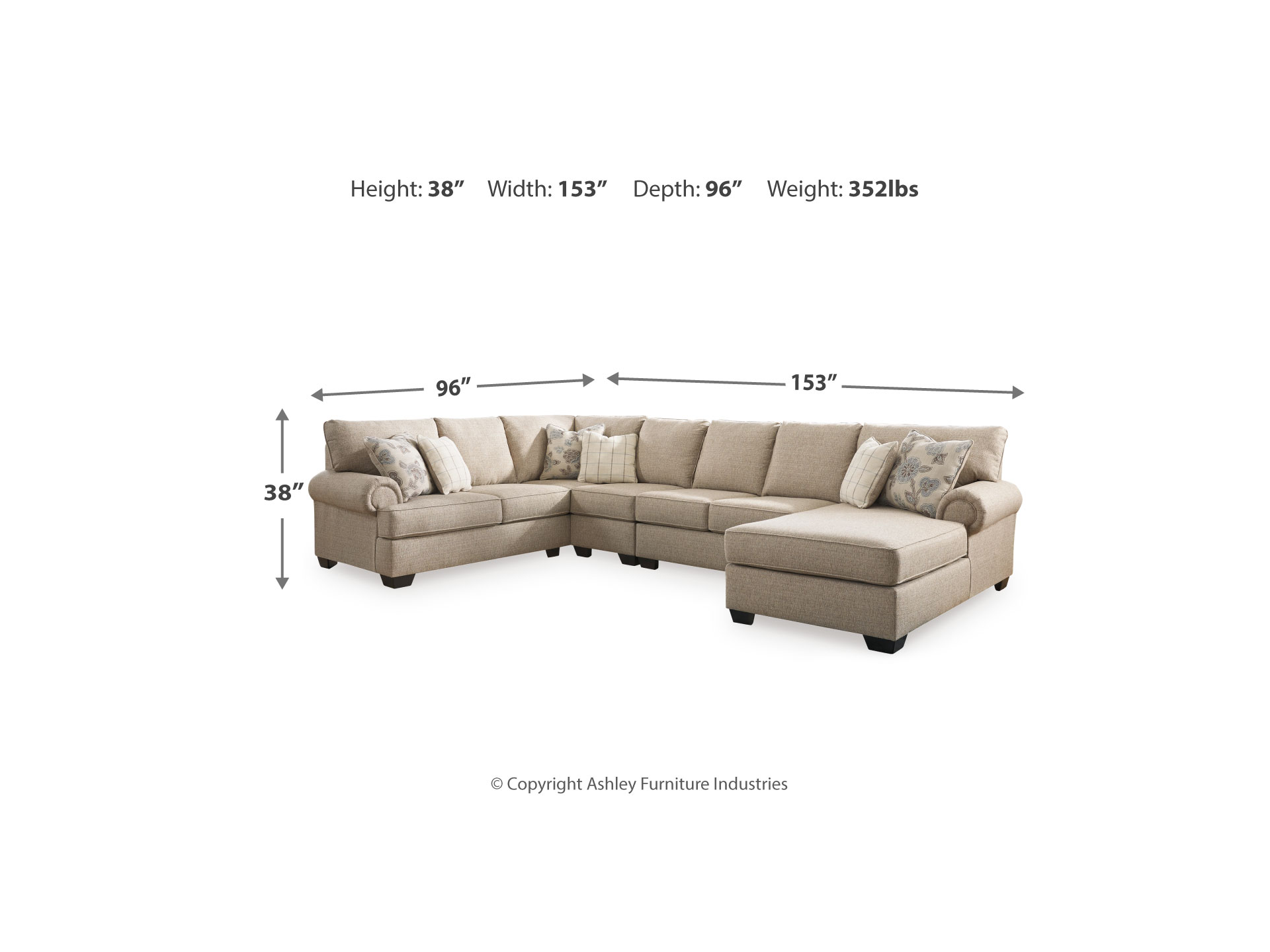 Includes 4 pieces: right-arm facing corner chaise, armless loveseat, armless chair and left-arm facing sofa with corner wedge