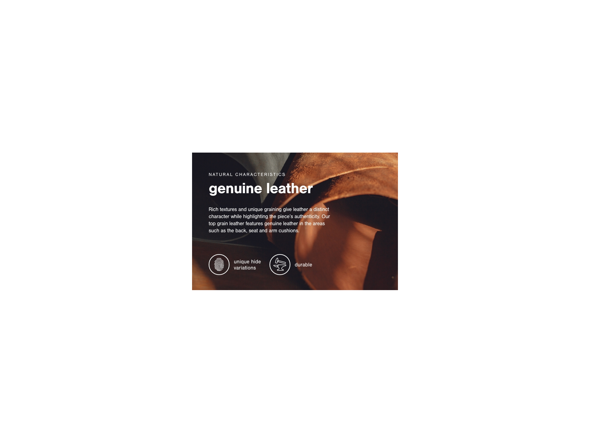100% top grain leather covers inside areas such as the back, seat and arm cushions; skillfully matched faux leather covers the remaining areas