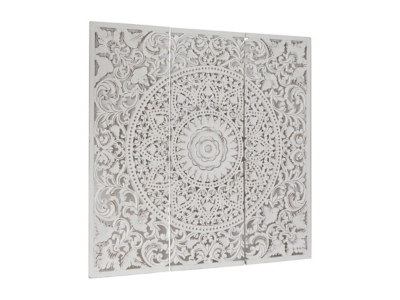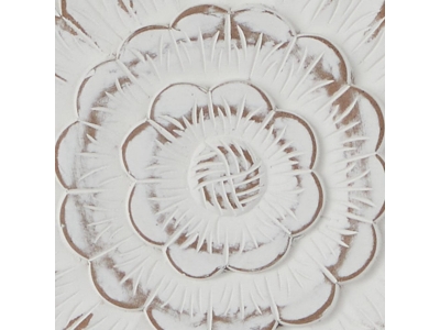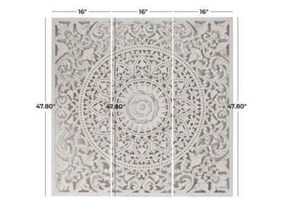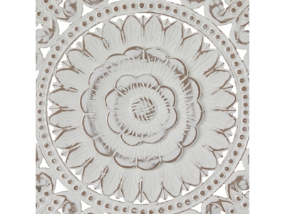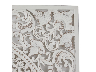 Maximize your open wall space with this eye catching floral carving wall decor. An extravagant display in a captivating design to elevate the look of your home. Whether it’s in the living room or bedroom, this floral set of 3 wall sculptures fits perfectly with various rooms and decor styles. This item ships in 1 carton. Due to the handmade nature of this item, no two will be alike, there will be slight differences in shape, size, and color. Can be hung vertically using the keyholes; nails and screws not included. Suitable for indoor use only. This item ships fully assembled in one piece. Made in India. This white colored mdf wall sculptures comes as a set of 3. Bohemian style.