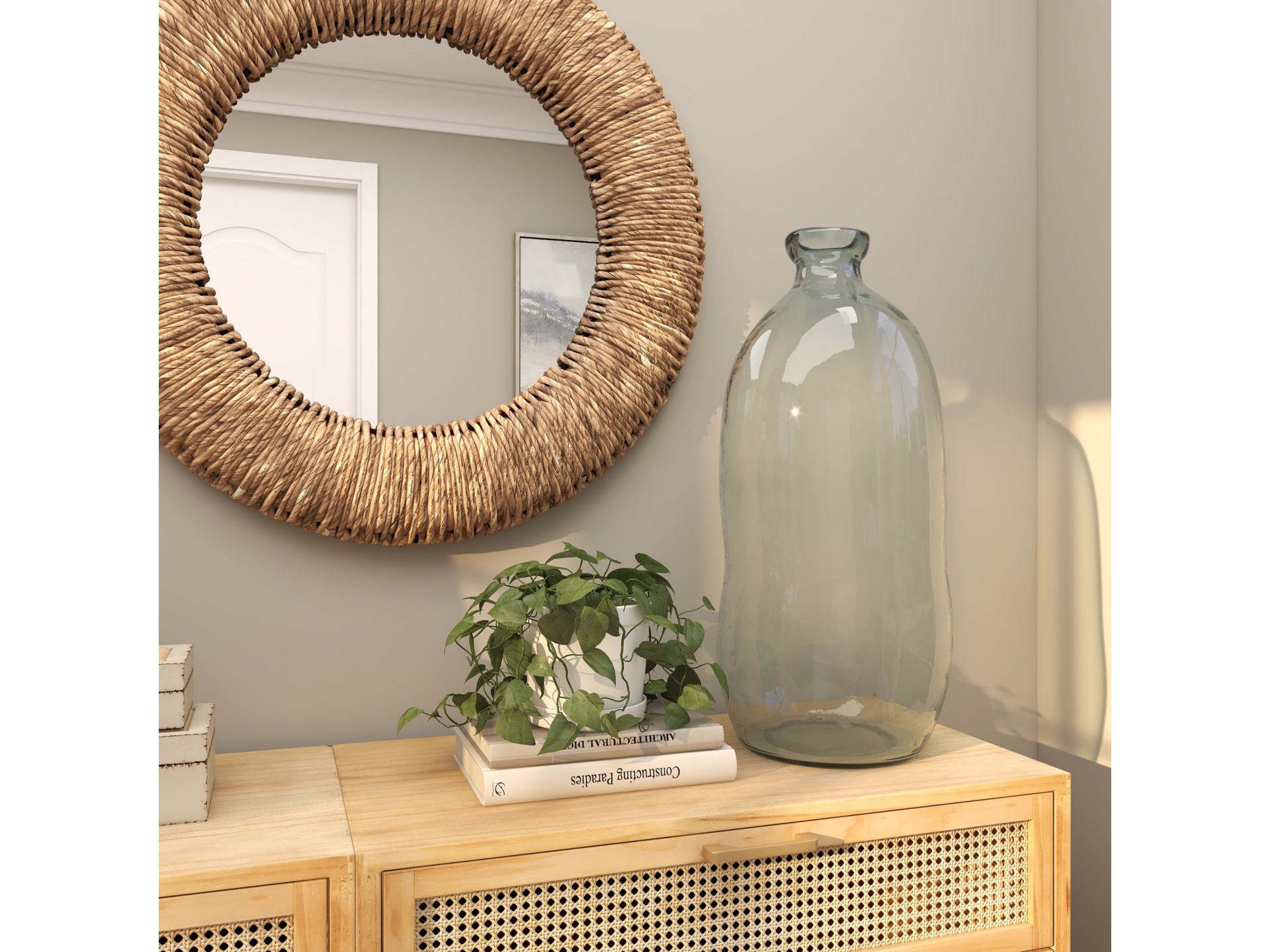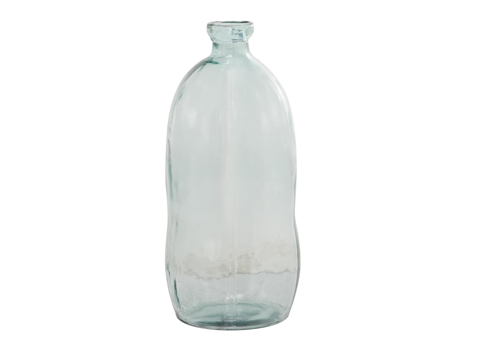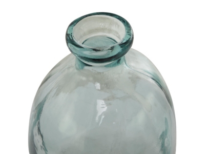 • This recycled glass vase features a cylinder bottle shape and a transparent glass exterior