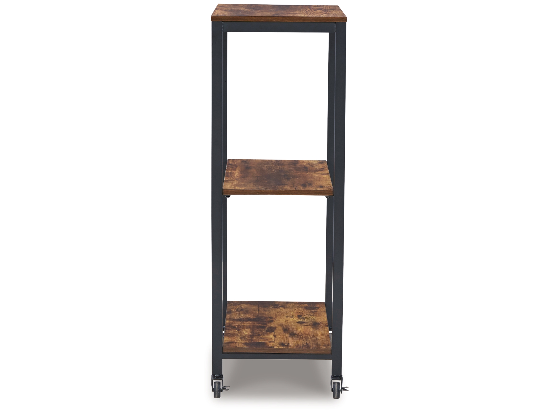 Impress your party guests in style with the Bevinfield bar cart. It features a sturdy design, with black metal rails and an antiqued brown wood finish on the three shelves for a relaxed feel. Smooth-gliding casters offer easy mobility.