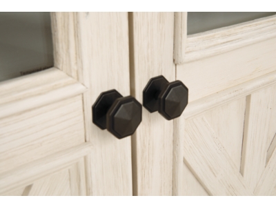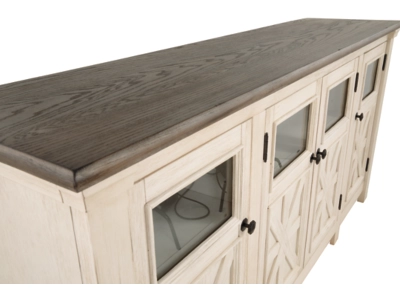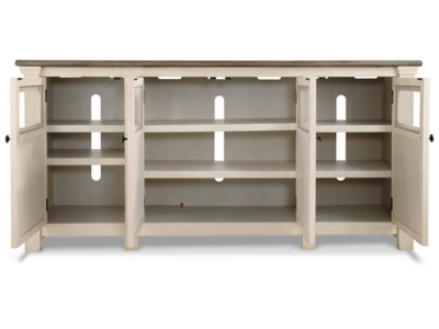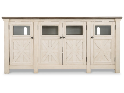 Whether your style is farmhouse fresh, shabby chic or country cottage, you’ll find the Bolanburg extra large TV stand perfectly in tune. Its two-tone, gently distressed finish pairs weathered oak with antiqued white for that much more quaint character. Charming elements include crossbuck adorned cabinets with glass inlays for peek-through flair. Ample adjustable shelving and cutouts for wire management nicely accommodate your media needs.
