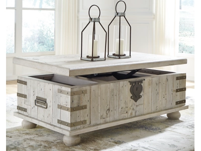 Unlock a quaint touch of farmhouse style and convenience in your living area with the Carynhurst lift top coffee table. Its design is inspired by the rugged looks of an antique storage trunk. Metal keyhole and bracket accents with rivets, a planked effect and large recessed bun feet dress up this charming piece. The distressed light gray finish enhances the reclaimed wood’s natural grain, which delivers a naturally aged feel. You’ll love its generous scale, offering a roomy top that’s ideal for displaying accents and more. Lift the top and enjoy the accommodating work or dining surface. Under the lift top, there’s a fully finished storage area—deeply spacious for organization.