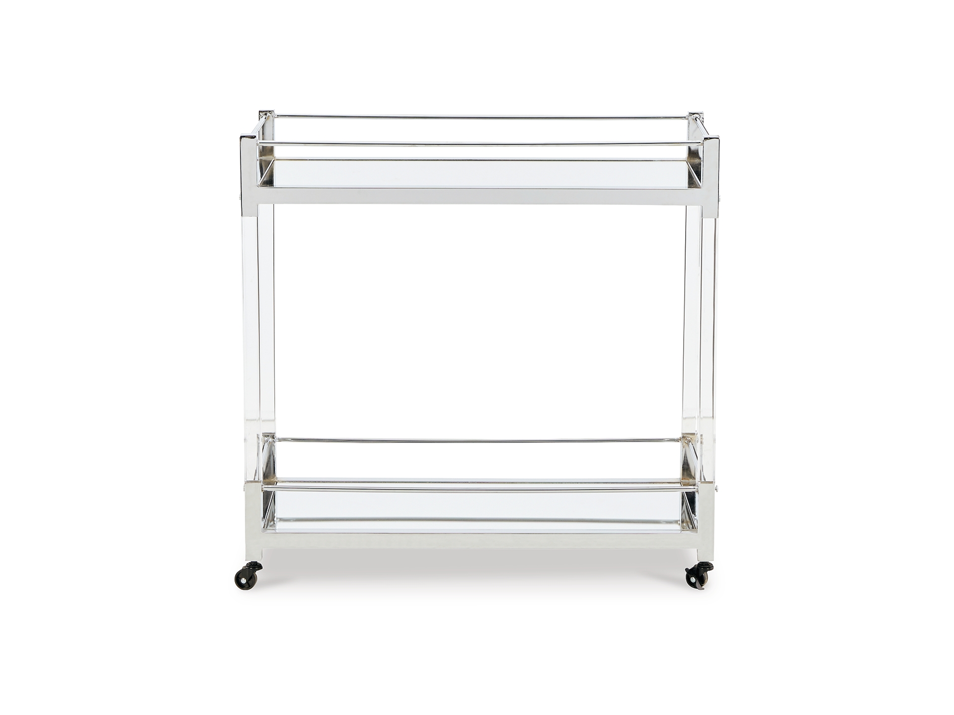 Reflect your love for contemporary style with the Chaseton bar cart. With two shelves made with mirrored glass, it adds both light and a touch of glam to your space. A clear acrylic and chrome-tone frame is a modern take on understated elegance. And thanks to rolling casters, serving your guests has never been easier.