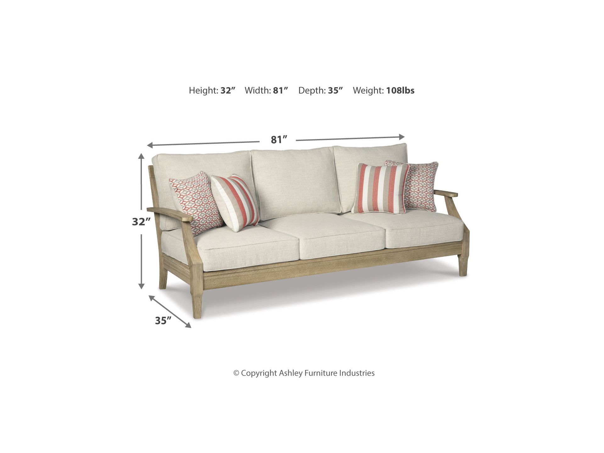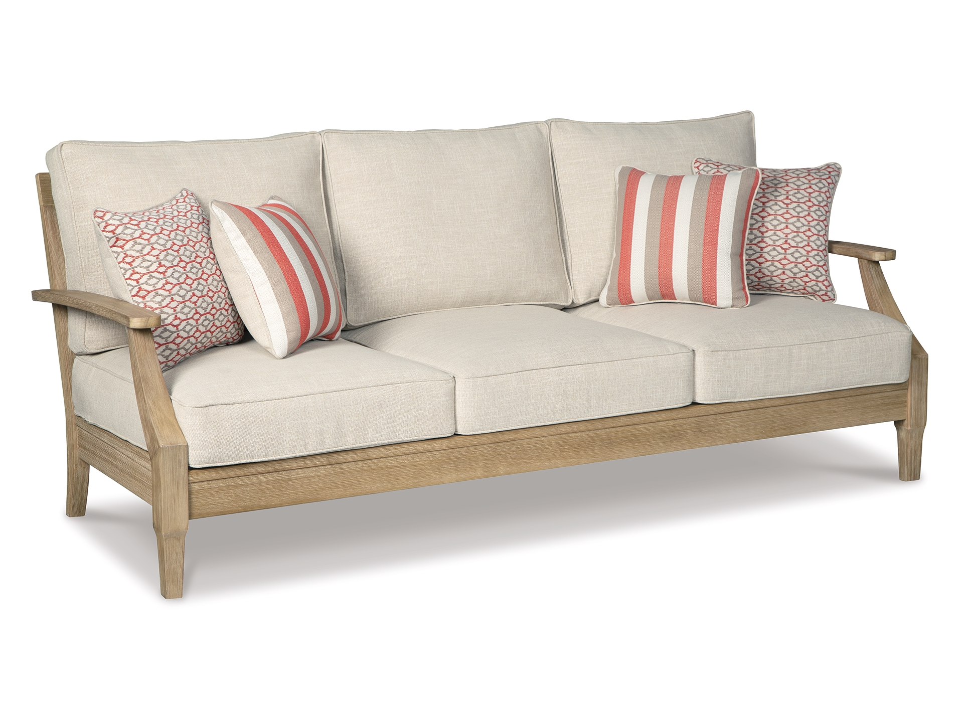 An effortlessly elegant choice in outdoor furniture, the Clare View seating set marries sturdiness and style in such a delightful way. The sofa and lounge chairs are sumptuously soft yet remarkably durable, with cushions and colorful throw pillows wrapped in a high-performing, low-maintenance Nuvella® fabric you’re sure to love. The eucalyptus wood frames have tapered touches, slat styling and a finish that lasts from season to season.