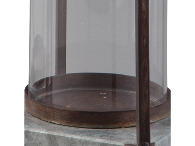 Made of galvanized metal with antiqued finish and glass hurricane shade