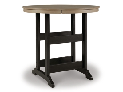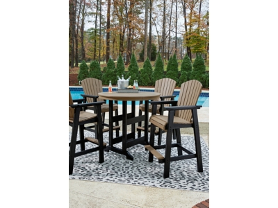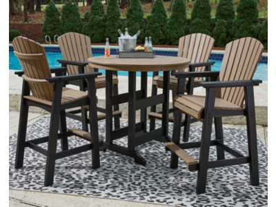 Raise the bar on outdoor living with the Fairen round bar table and bar stool set. Crafted for style, comfort and durability, the set impresses with a standout two-tone finish that pairs a light driftwood-look and black finish for twice the interest. Round table design keeps everyone in the flow of conversation, while the stools cater with sturdy armrests, an ample footrest, high shell back and waterfall wrapped seat for curvaceous comfort.