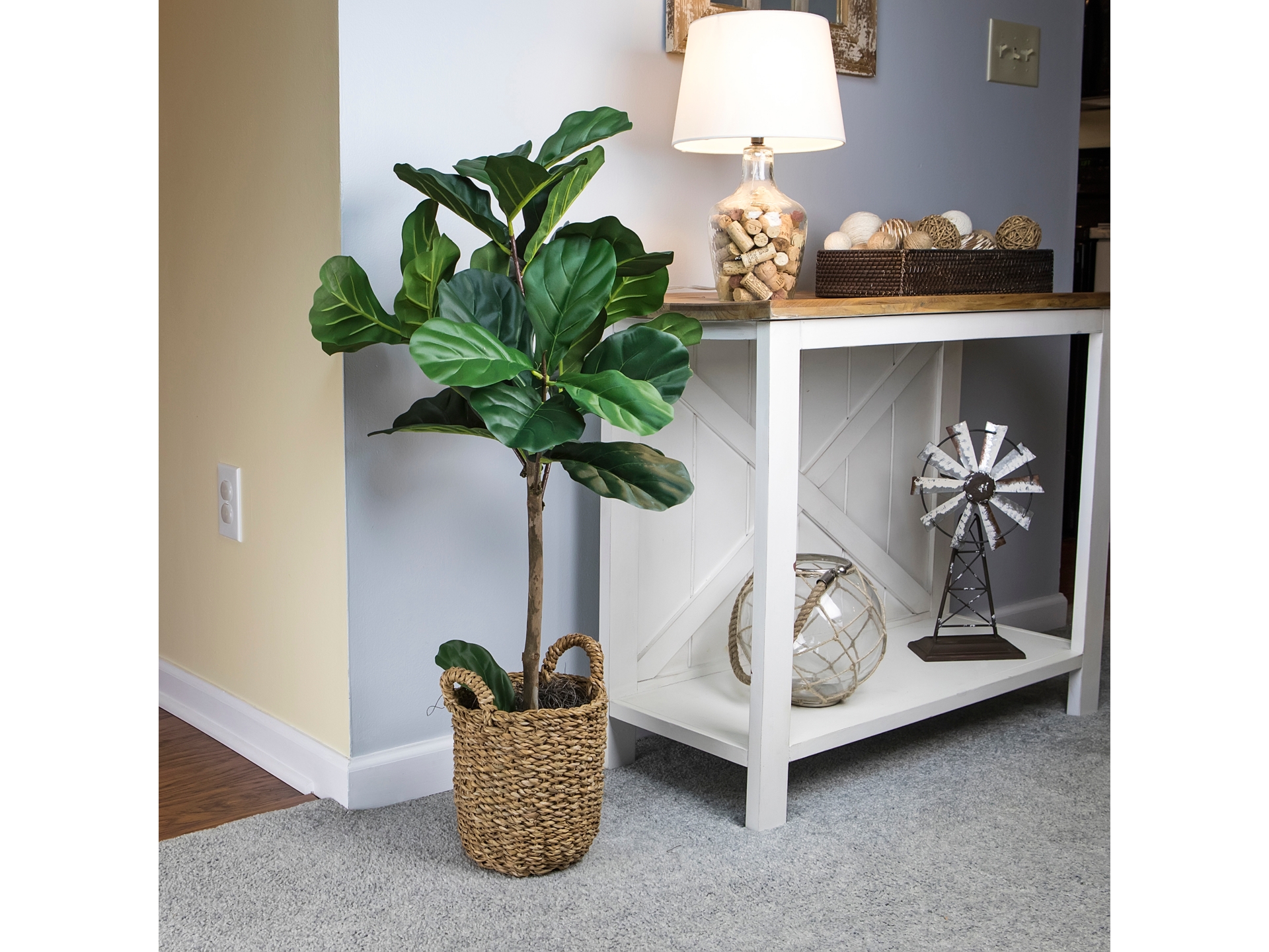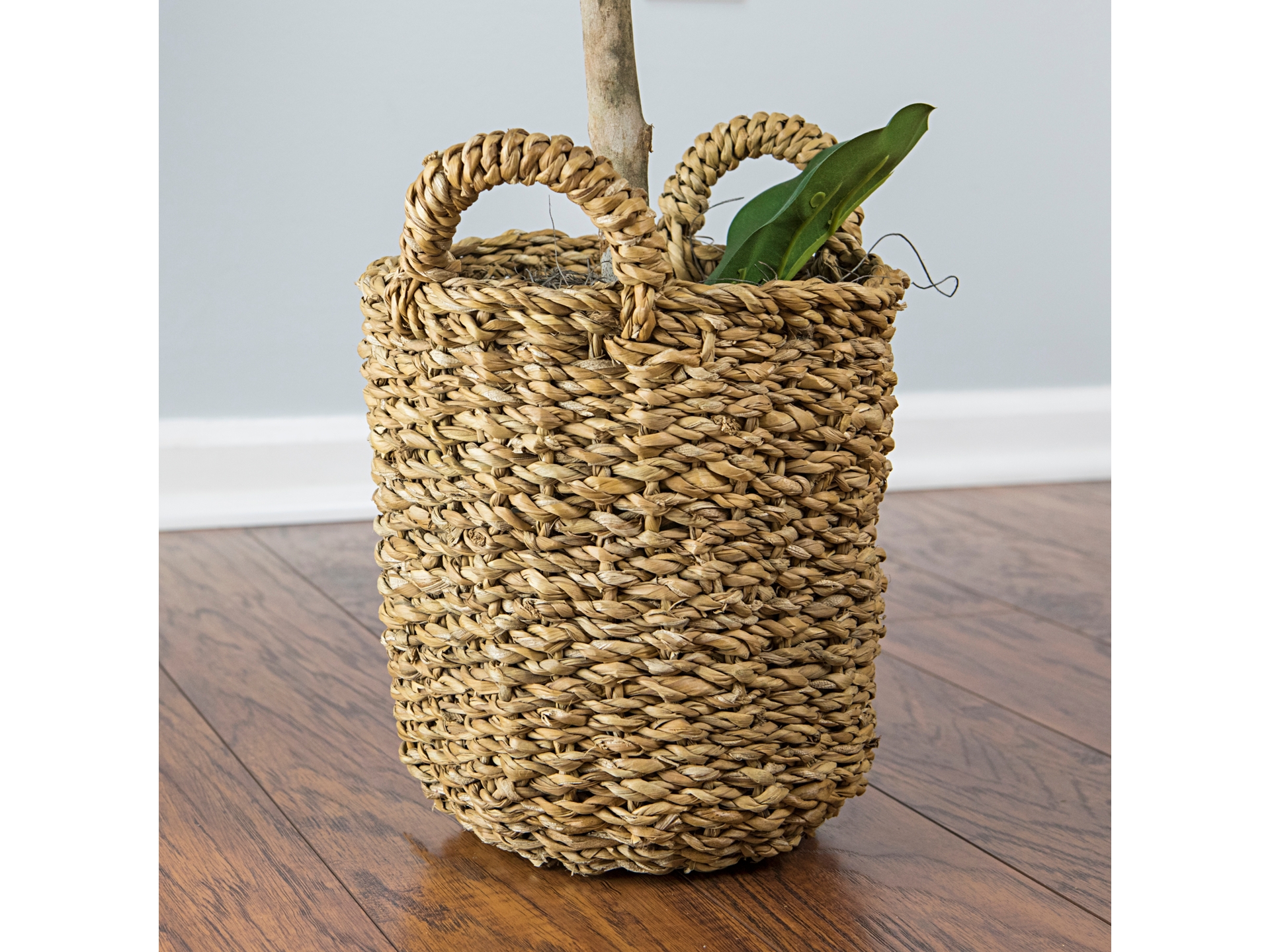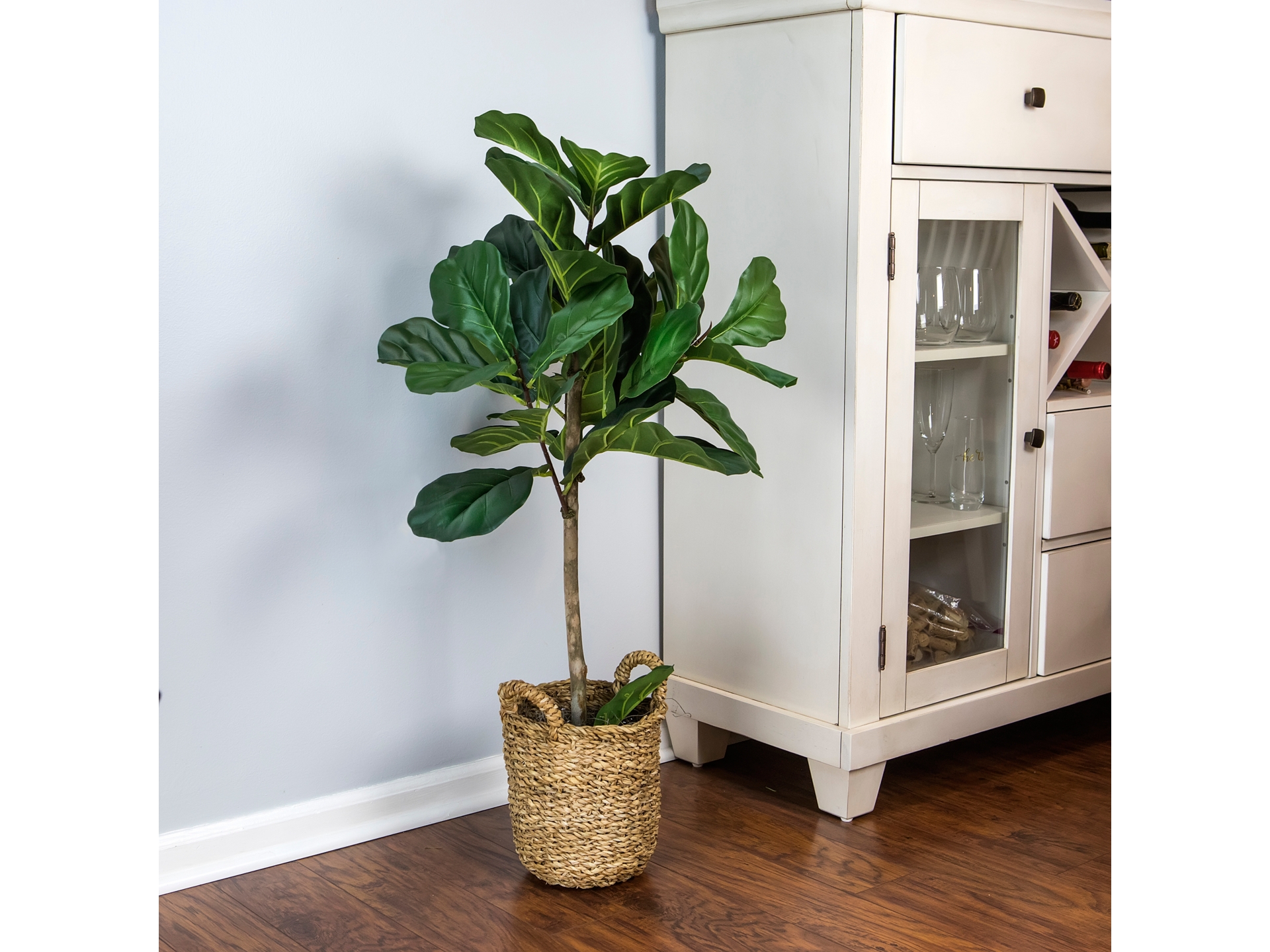 Our Fiddle Leaf Fig Tree takes the plant of the millennium to new heights. Undeniably, the lush but sometimes finicky Fiddle Leaf Fig Tree has become the darling of social media during the past few years. This 30-inch faux plant not only channels the adored features of Mother Nature’s finest examples, but it does so with greater predictability and the need for much less care. The tree rises out of a richly detailed woven handle adorned basket from which its green leaves cast a 16-inch wingspread.