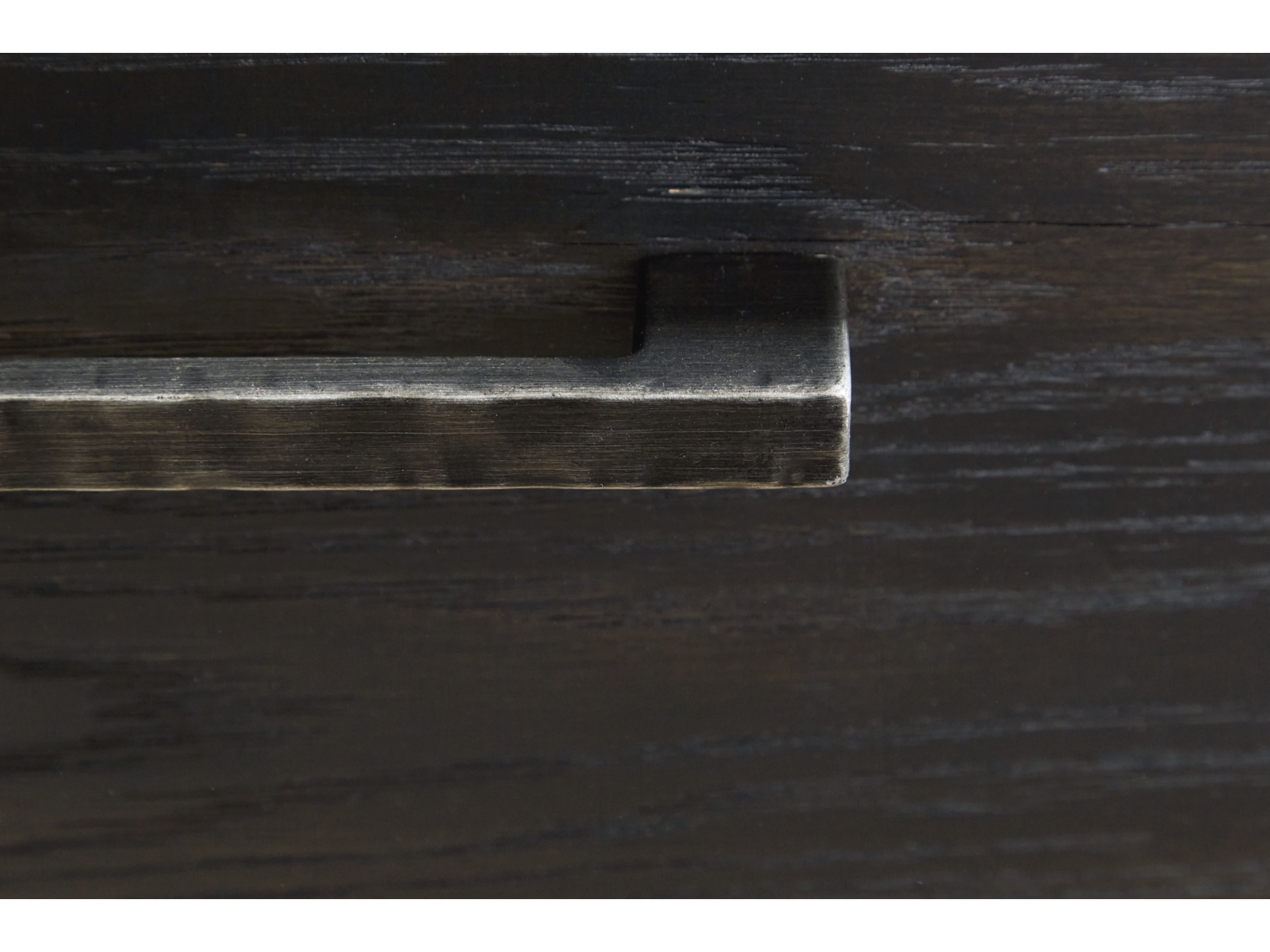 Metal bar pulls with rustic texture in a dark pewter-tone finish