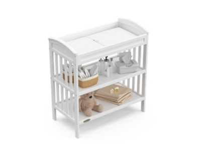 Discover the timeless elegance and ample storage of the Graco Benton Changing Table, a must-have for maintaining a beautifully organized nursery. Designed for convenience and style, this essential piece offers a dedicated space for changing your baby, paired with the practicality of keeping nursery essentials neatly arranged. Included with the Benton Changing Table is a water-resistant changing pad and a safety strap, providing both convenience and peace of mind. Boasting graceful curves and a sophisticated aesthetic, its design effortlessly complements any nursery décor. The table features two open shelves, perfect for storing bottles, diapers, lotions, and more, ensuring everything you need is within arm’s reach. Complete your Graco Benton Collection by pairing the changing table with the matching Graco Benton 6 Drawer Dresser. For a complete nursery setup, select the perfect crib to match, choosing from the Graco Benton 5-in-1 Convertible Crib, the Graco Benton 5-in-1 Convertible Crib with Drawer, or the Graco Benton 4-in-1 Convertible Crib and Changer. Each option is designed to create a cohesive and dreamy nursery environment. The Graco® Benton Changing Table is GREENGUARD Gold Certified – certified products are screened for more than 10,000 chemicals and VOCs known to pollute indoor air. The Benton Changing Table is crafted with pine wood, pine wood slats, and wood composites, and its applied finish has been tested to meet or exceed the applicable ASTM and CPSIA safety standards. Also, like all Graco® changing tables, the Bentonis JPMA Certified — meaning it’s been expert tested to meet or exceed all applicable category voluntary and mandatory safety standards. Graco® is the proud recipient of the Parent Tested Parent Approved (PTPA) Seal of Approval for nursery and children’s bedroom furniture. Backed by a 1-year limited manufacturer’s warranty. Assembly required. Changing pad included and safety strap included.