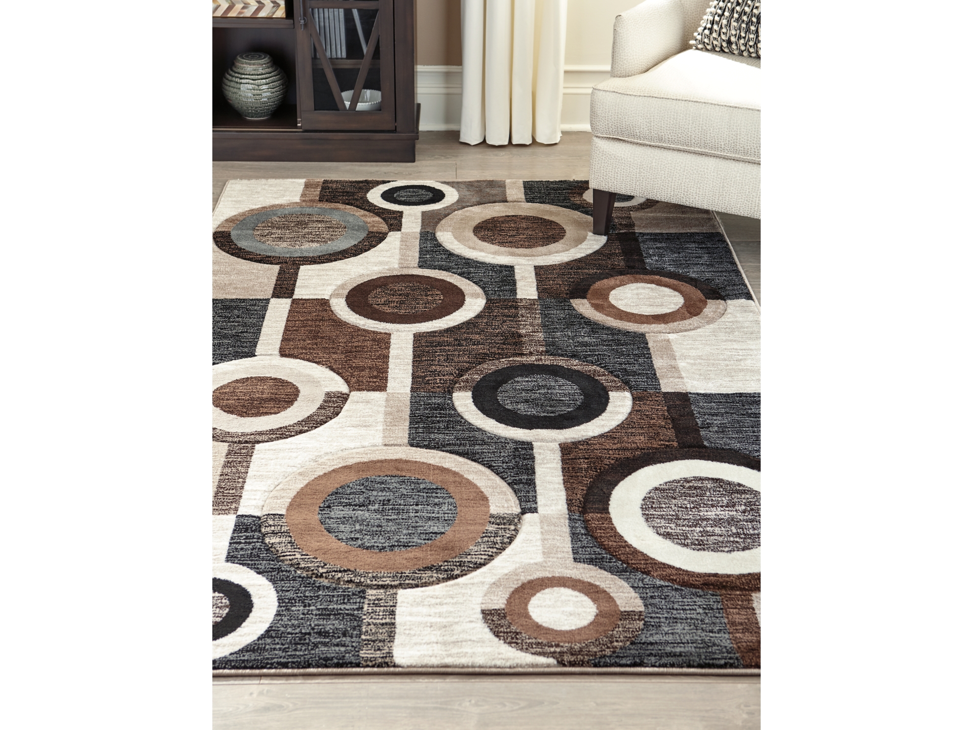 Talk about bringing modern pop to a space. With its multilayered geometric design and pleasing palette of black, brown and cream tones, the Guintte area rug is decidedly bold without coming on too strong.