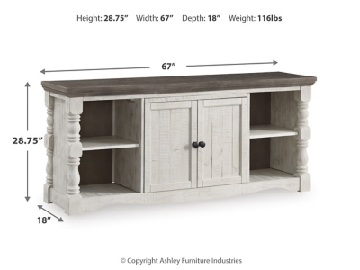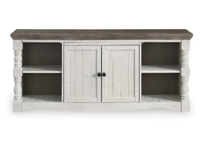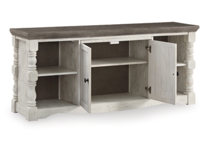 Set your sights on modern farmhouse style with the Havalance XL TV stand. Distressed two-tone treatment blends a weathered gray with vintage white for an utterly charming effect. Turned posts lend a hearty, substantial look that feels right at home, while plenty of open shelving makes the aesthetic anything but heavy.