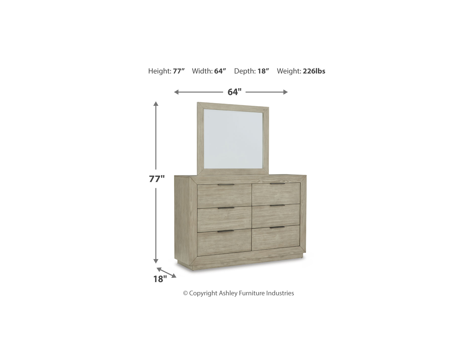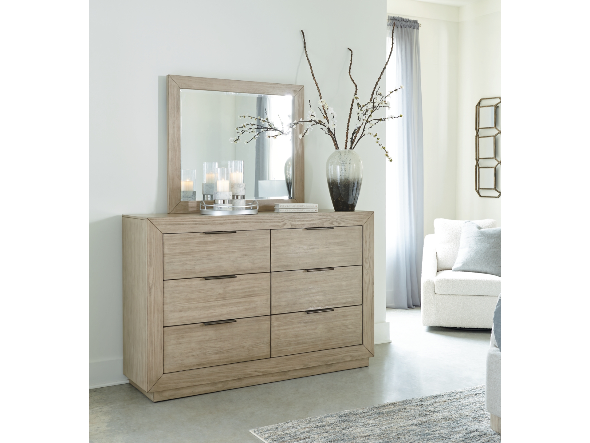 Get the luxe modern look you love at a price you can afford. The Hennington dresser with mirror features a structured silhouette on a plinth base that elevates the piece to a modern masterpiece. The six soft-closing drawers have fully finished drawer boxes for a sleek look inside and out. Its textural surface has a complex bisque coloration for a refined, yet versatile, appeal. Slim nickel-tone bar pulls add a finishing touch to the clean-lined design.