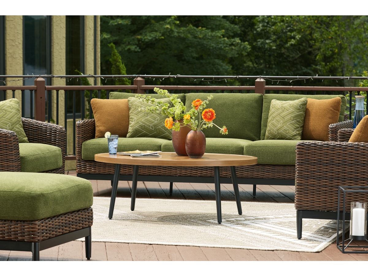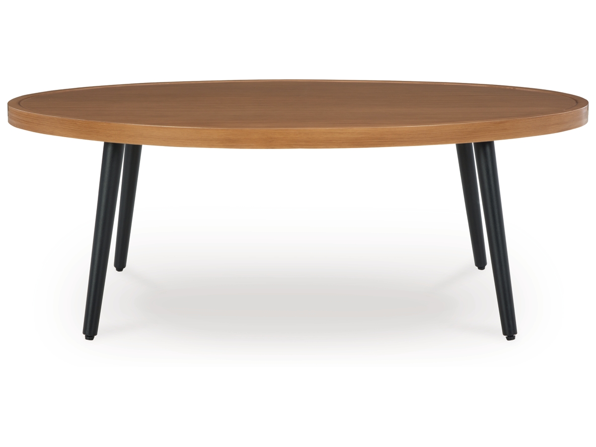 he Horizon Hall outdoor coffee table recalls the aesthetics of nature to bring an inviting, high-style feel to your patio or lanai. Made of aluminum with a wood look tabletop, it combines beauty and longevity. Worried about the weather? Don’t sweat it—the durable design is made to withstand the elements from season to season.