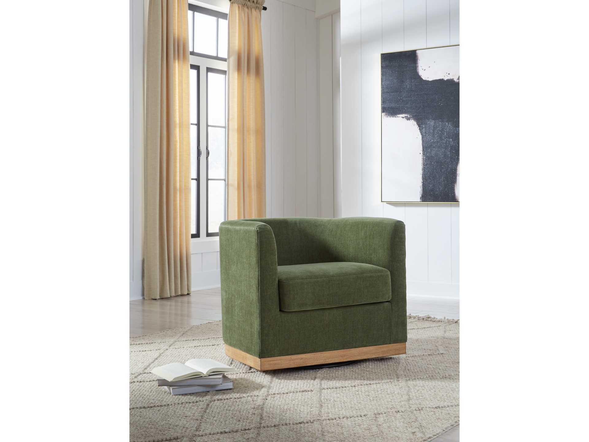 Take contemporary style for a spin with the Jersonlow accent chair. Handsome in a deep forest green, it adds a splash of sophistication to a reading nook or living room. The chair’s handy swivel base ensures you can always find your perfect angle, while wood accent trim perfectly punctuates the look.