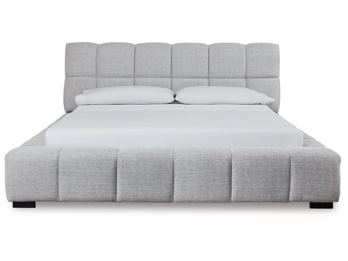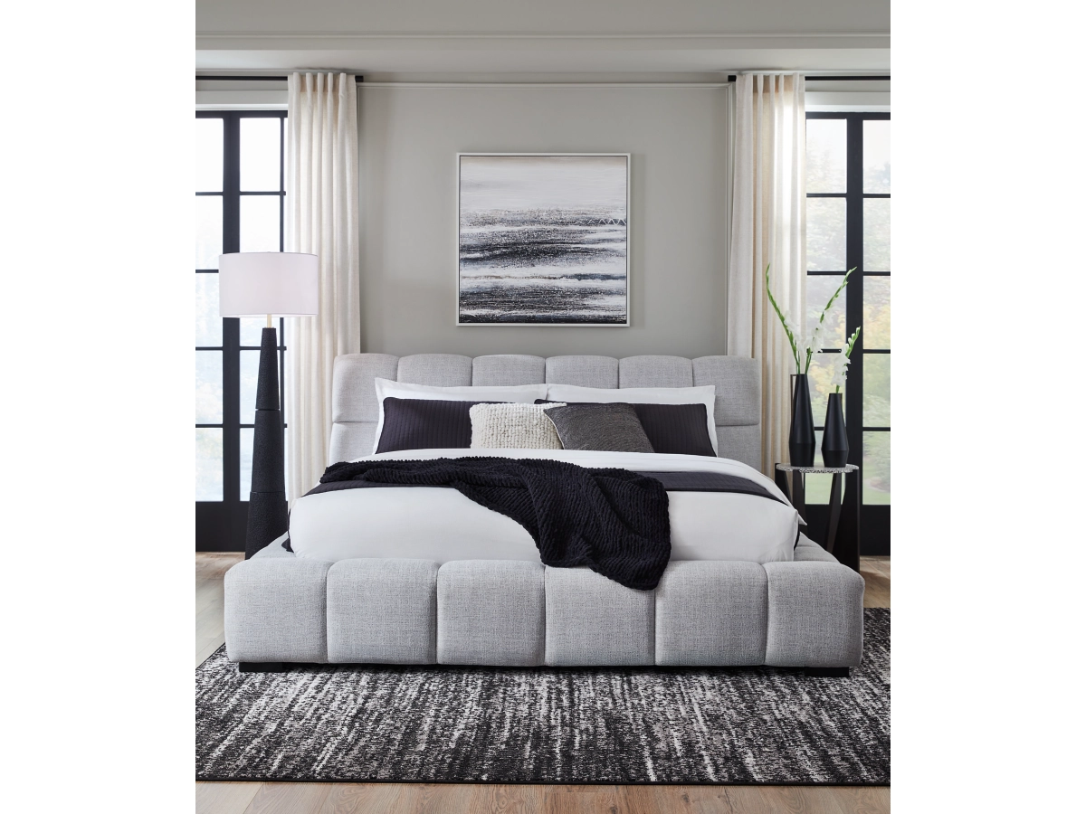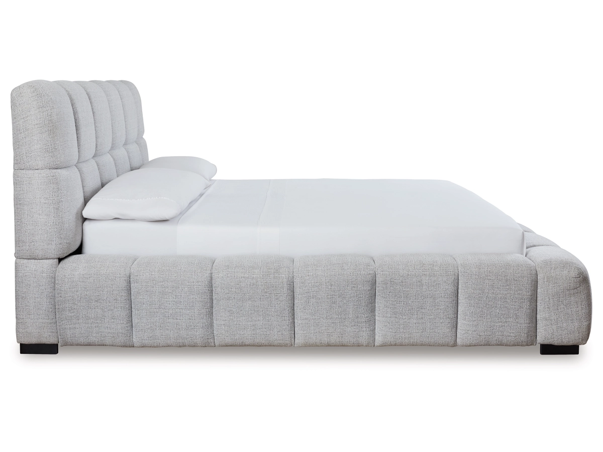 The Jesstean King Upholstered Bed combines casual and contemporary design for a stylish yet comfortable upgrade. It features plush, deep pillowed tufting for an elegant silhouette and is upholstered in light gray Next-Gen Nuvella™ performance fabric, which is soft, stain-resistant, durable, and easy to clean.
