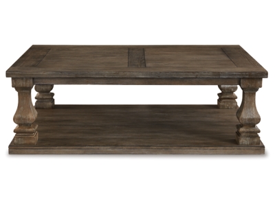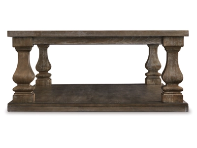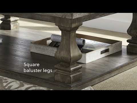 Homey. Hearty. Heavenly hued. Luring with a distressed weathered gray finish and square baluster legs set on a broad lower shelf for great presence, the Johnelle coffee table is sure to make your homestead feel that much more like home. The look is beautified with elm veneers and a framed and plank-effect tabletop for a richly crafted masterpiece made for years of satisfaction.