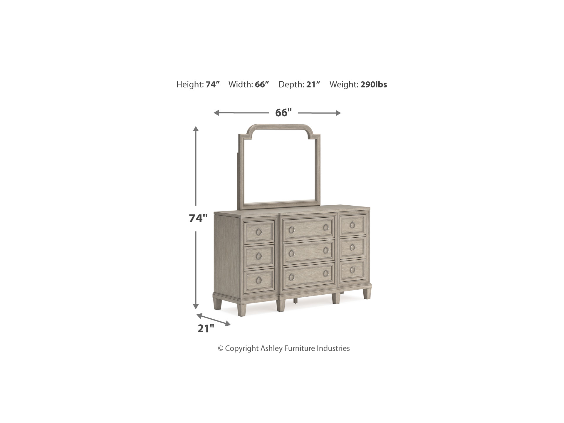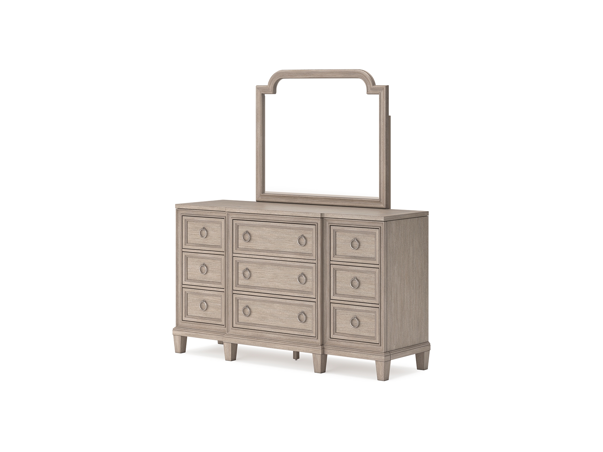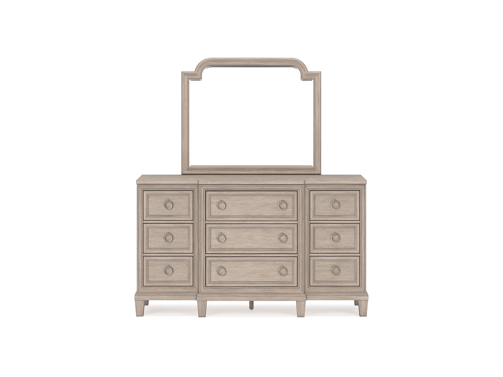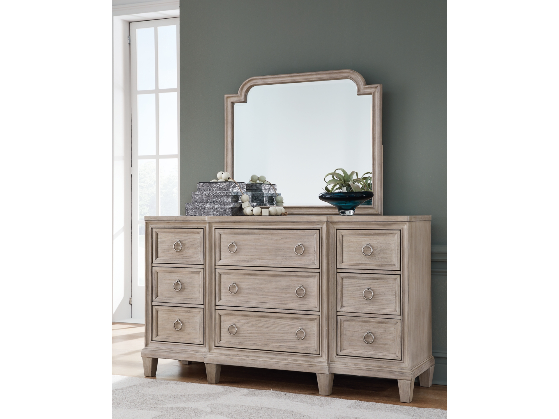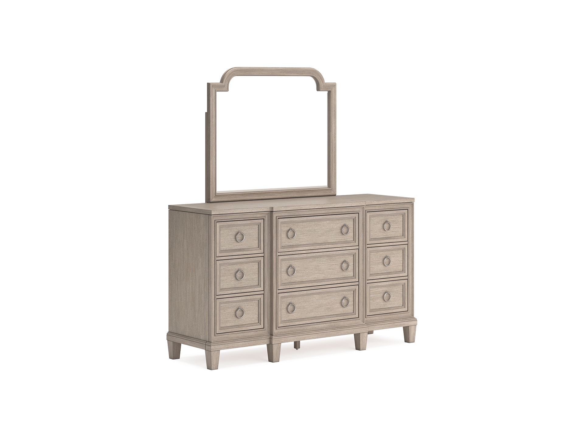The striking Jorlaina dresser with mirror looks equally at home in traditional or modern settings. A fresh light gray finish offers a casual modern look. Spacious drawers incorporate picture frame moulding and satin nickel-tone pulls for a clean yet sophisticated design. Combined with the stylishly shaped beveled mirror, it’s a wonderful style awakening in the bedroom.