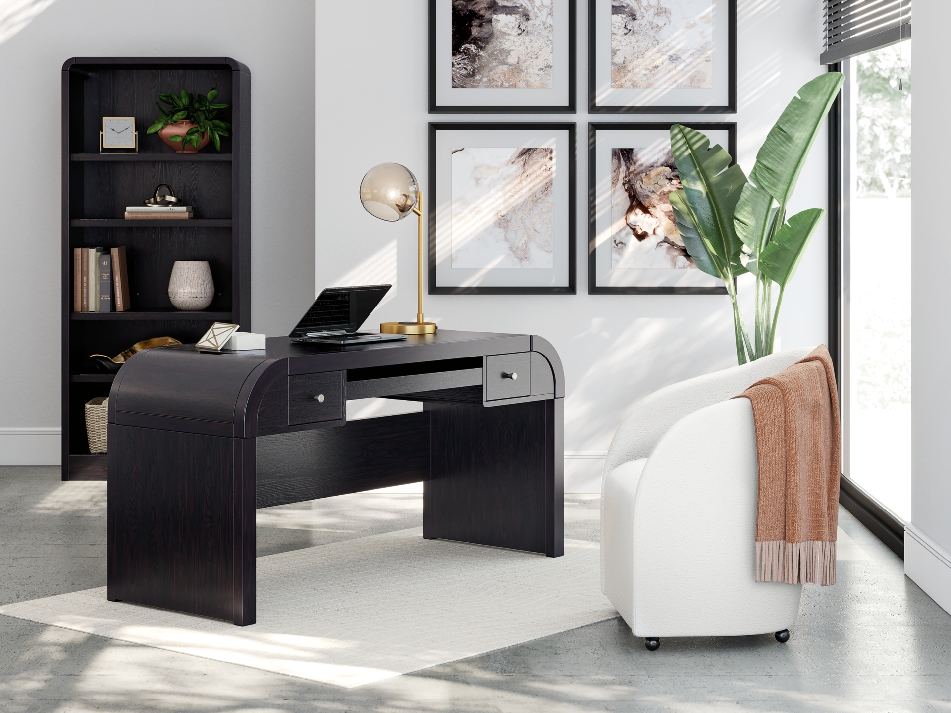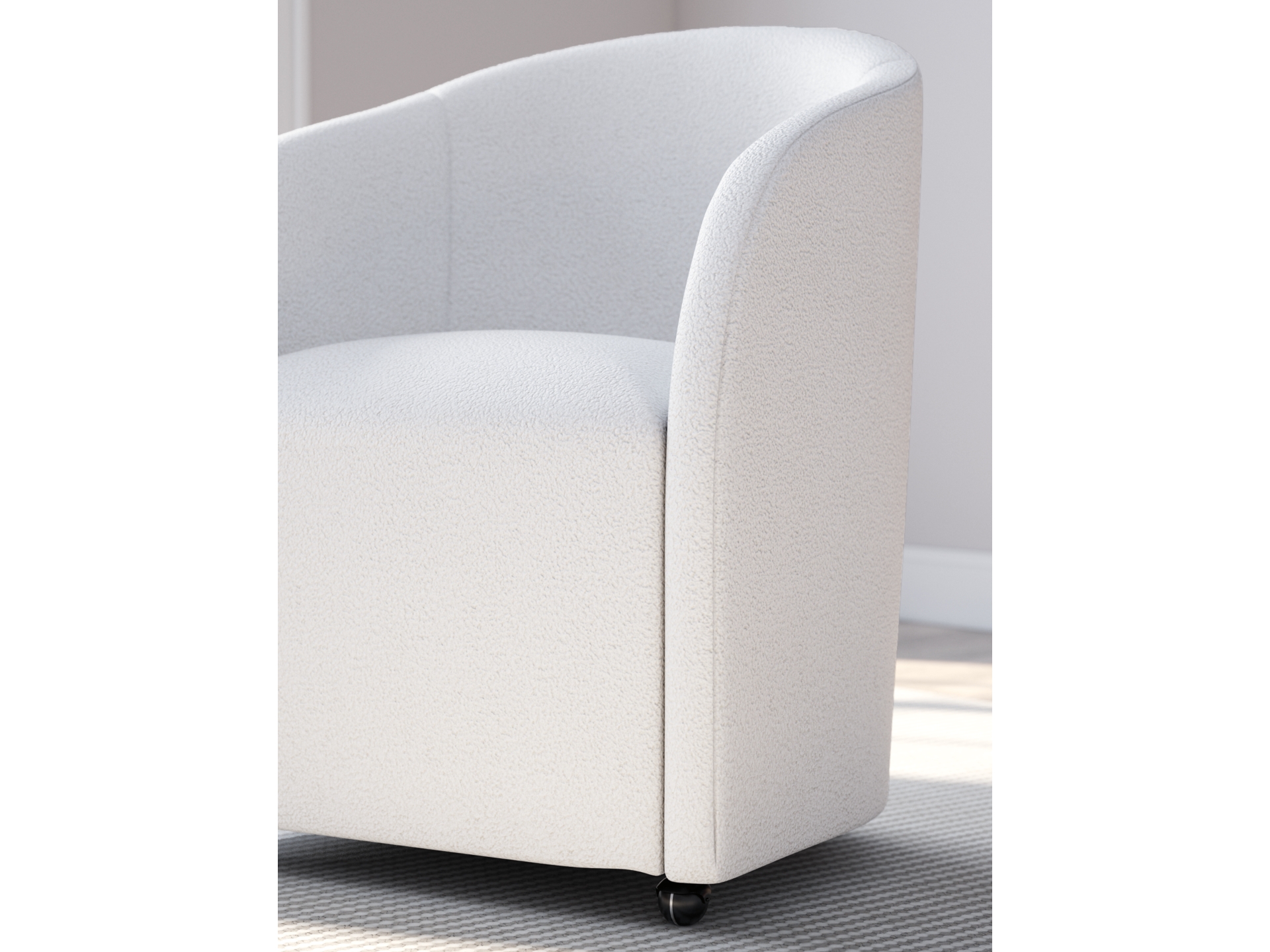 The fully upholstered Korestone desk chair makes a lasting impression in a simply stunning way. Its magnificent curves are enhanced with a neutral boucle upholstery that’s so pleasing to the eye. This bucket chair is the piece you’ve been looking for to elevate your contemporary home office. Plus, it’s set on casters so it’s easy to move around.