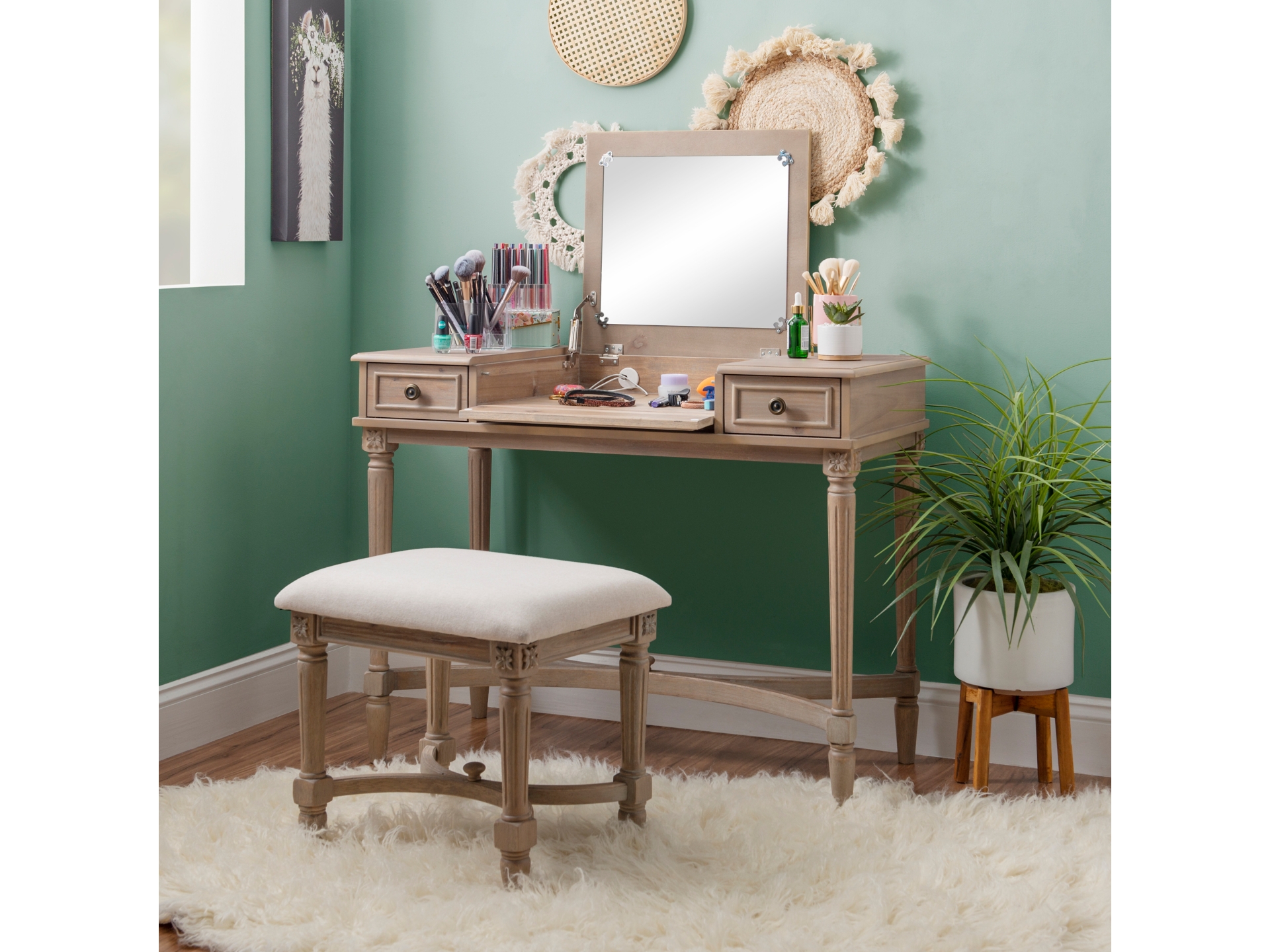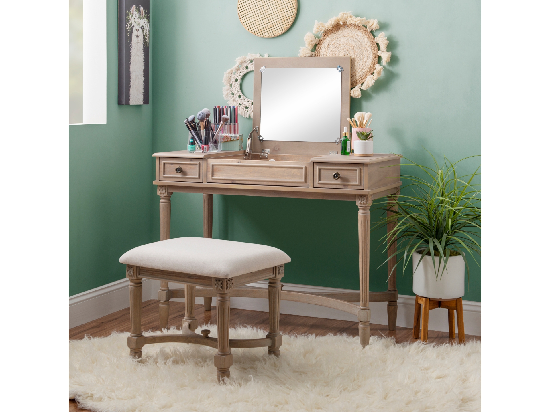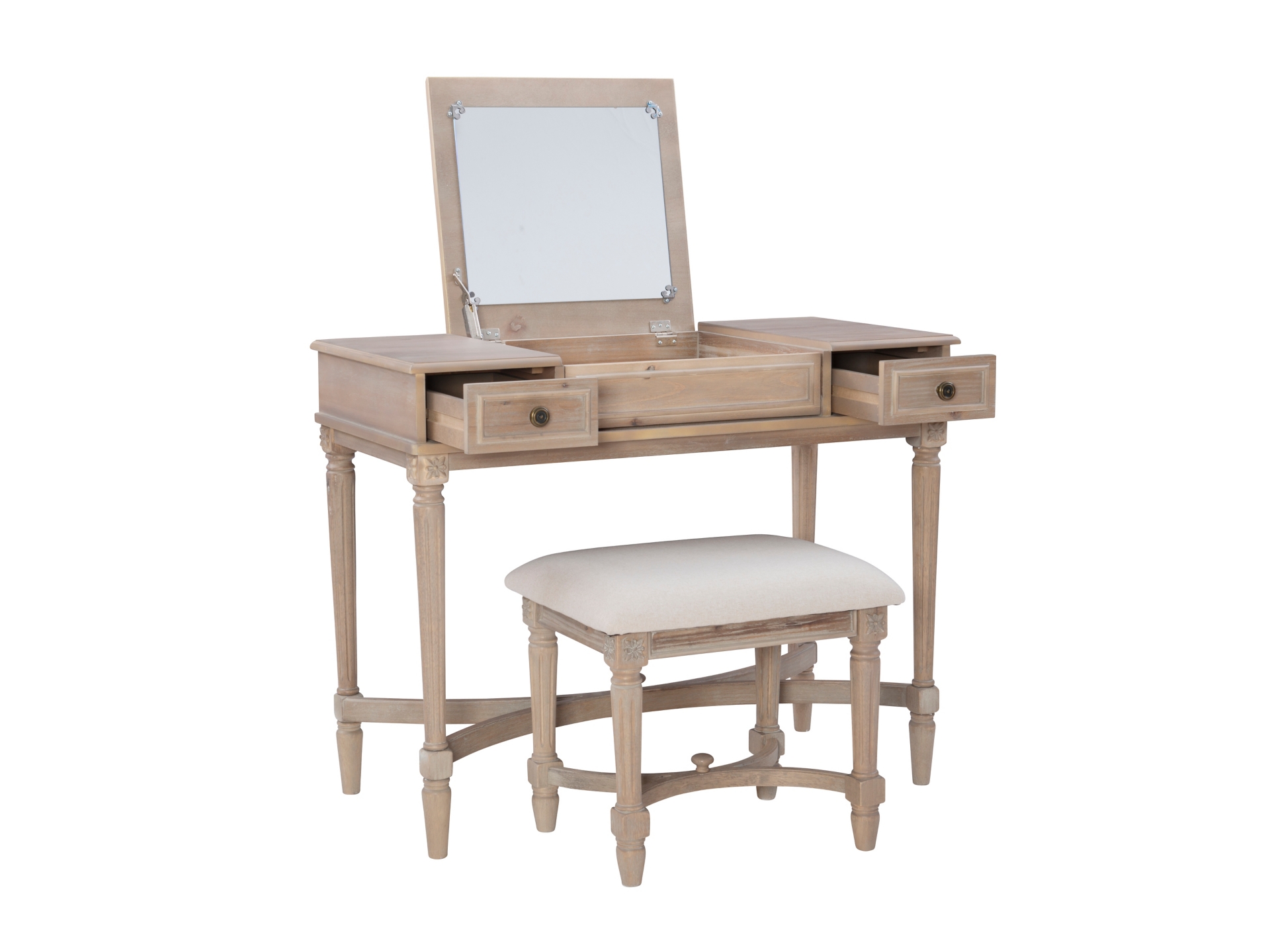 Dressed to impress with fluted legs, curved X stretchers and framed drawer fronts, this vanity set is such a delightful choice for a teen’s room, master bedroom or dressing area. Its soothing gray washed finish gives the classic styling a fresh sensibility that feels here and now. Given its clever flip-top design with hidden mirror and storage space, this vanity set works equally well as a compact desk. The matching upholstered seat completes the picture-perfect look.