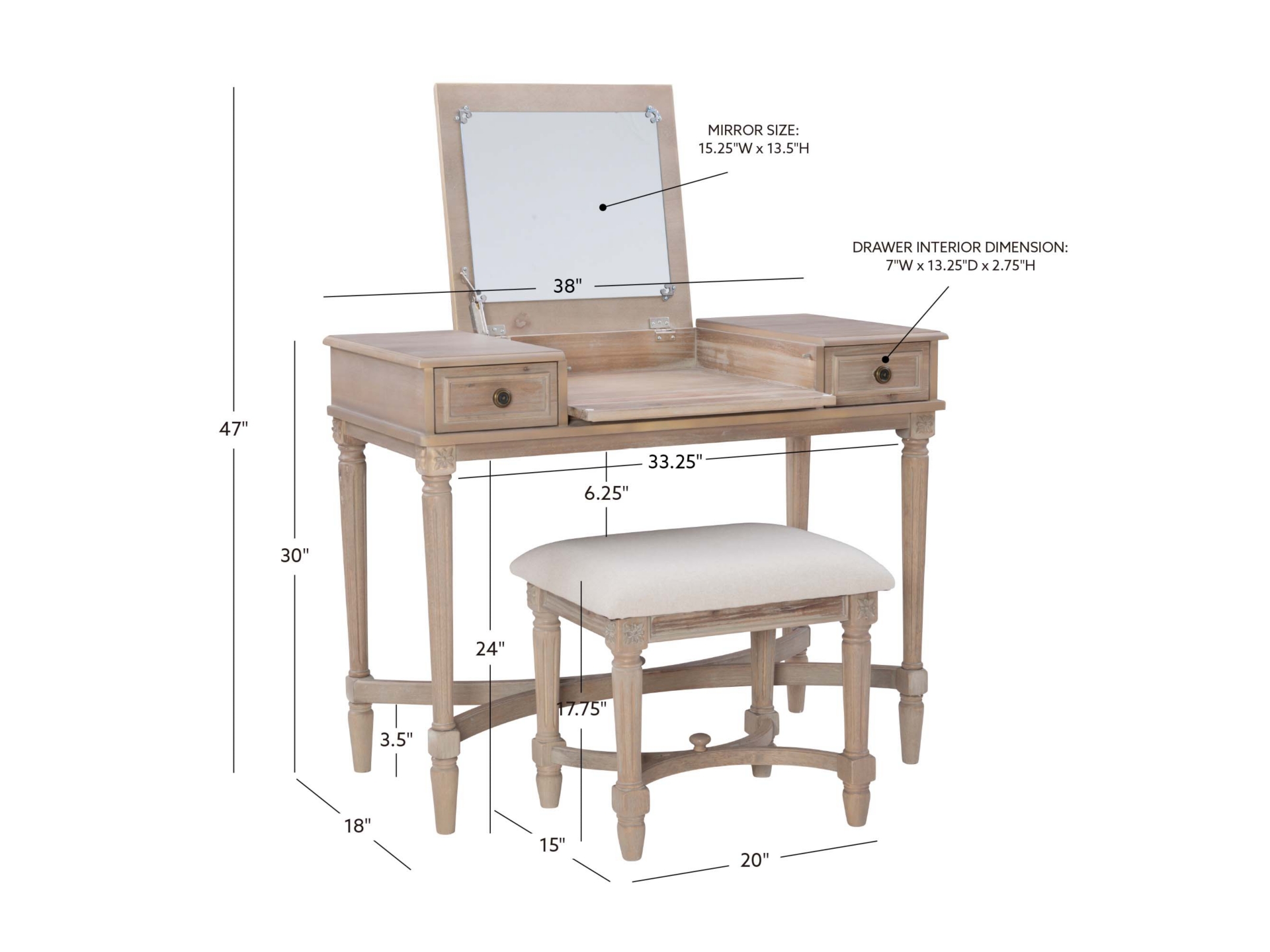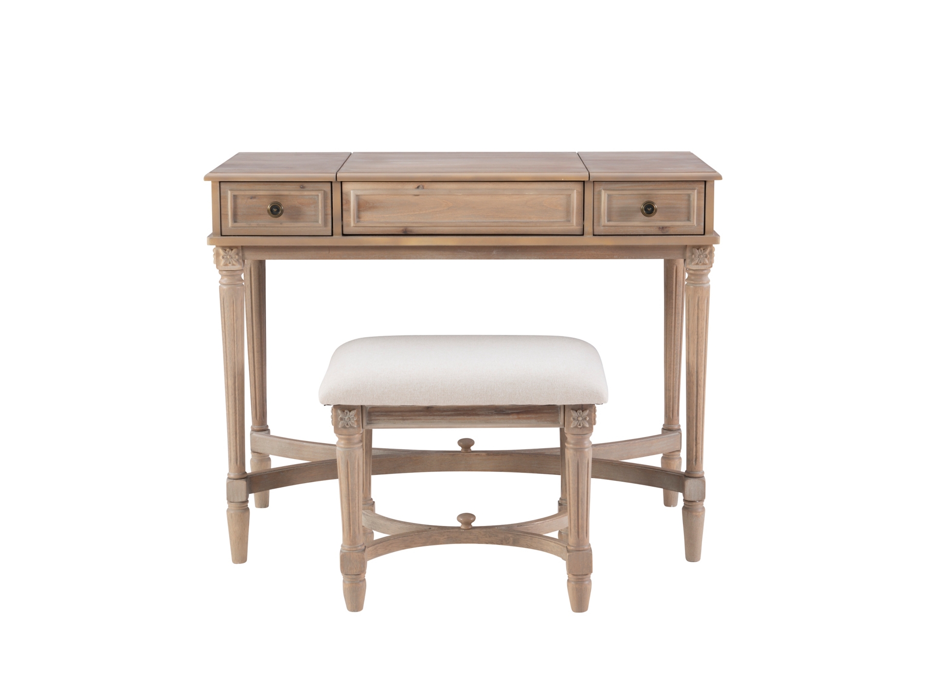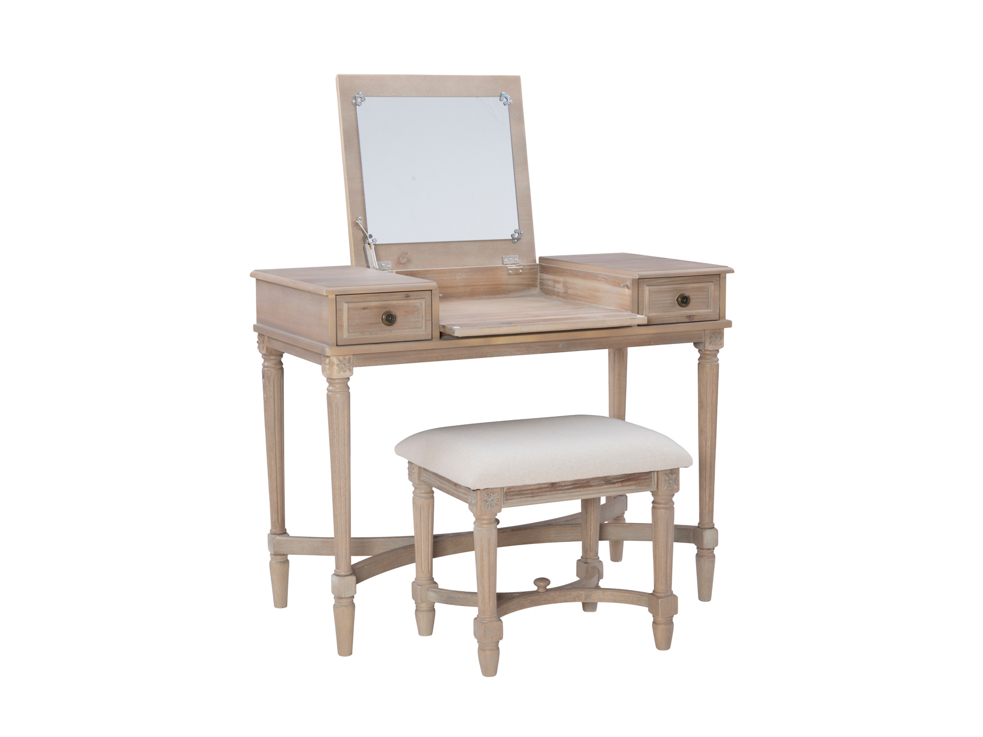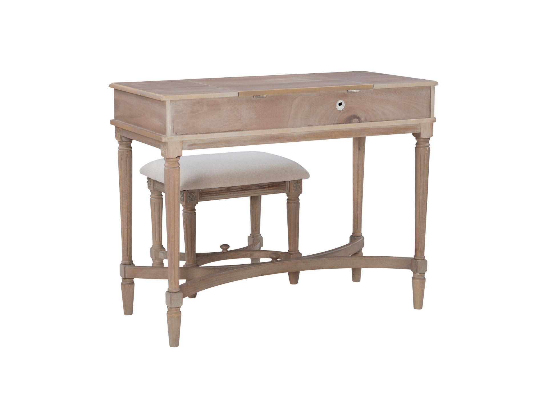 Dressed to impress with fluted legs, curved X stretchers and framed drawer fronts, this vanity set is such a delightful choice for a teen’s room, master bedroom or dressing area. Its soothing gray washed finish gives the classic styling a fresh sensibility that feels here and now. Given its clever flip-top design with hidden mirror and storage space, this vanity set works equally well as a compact desk. The matching upholstered seat completes the picture-perfect look.
