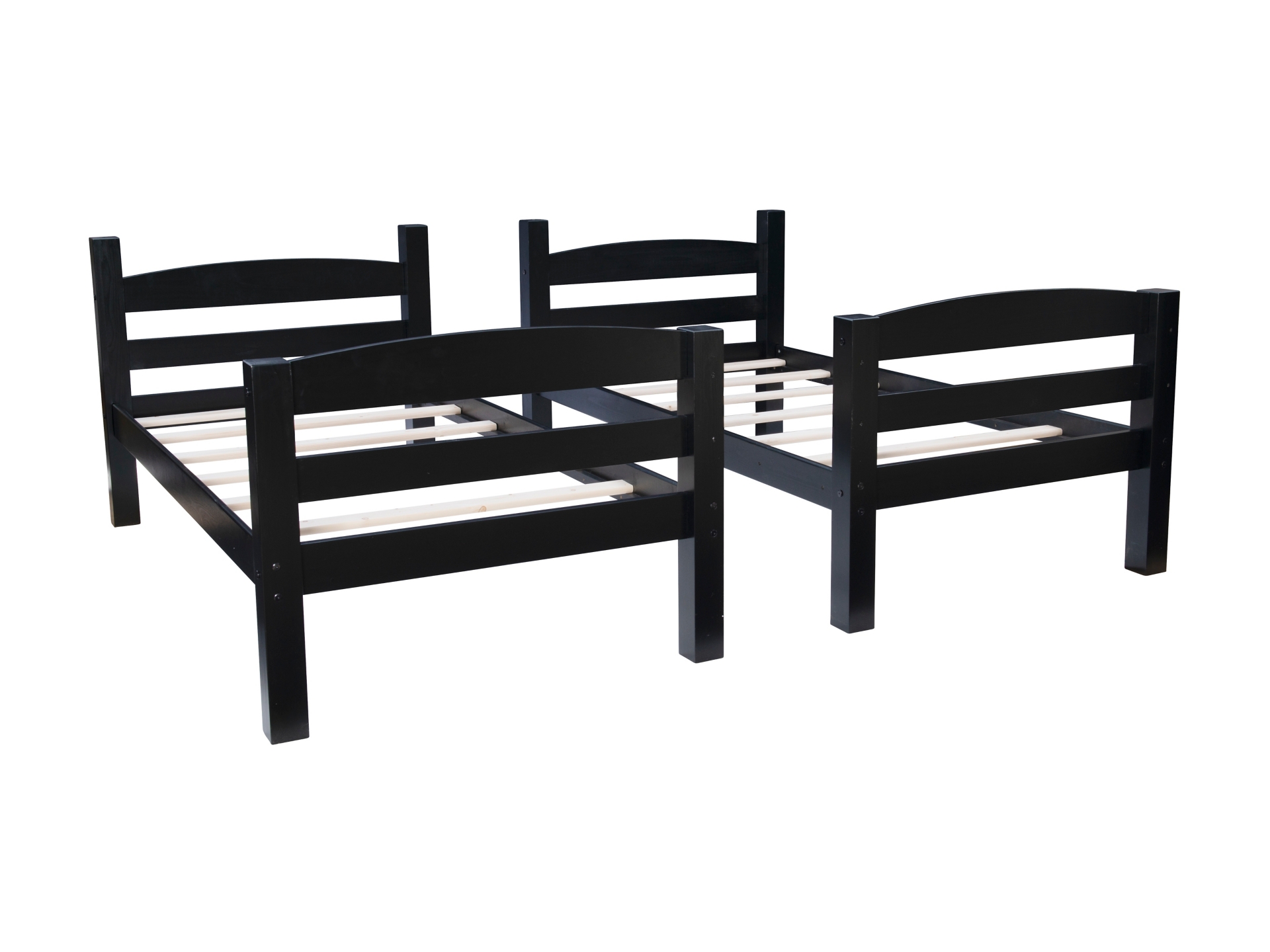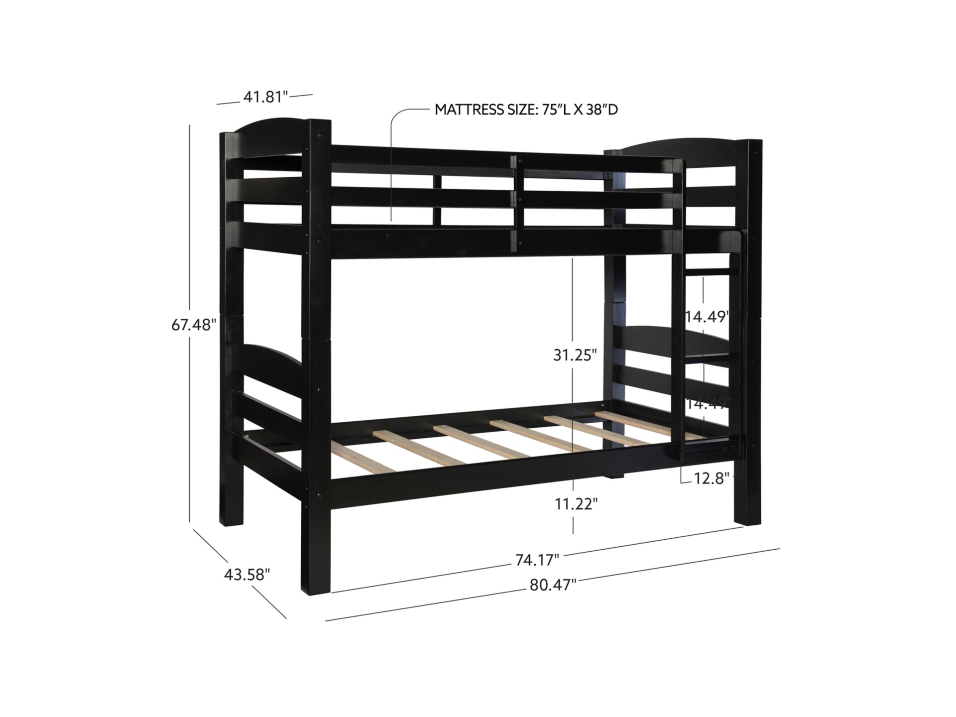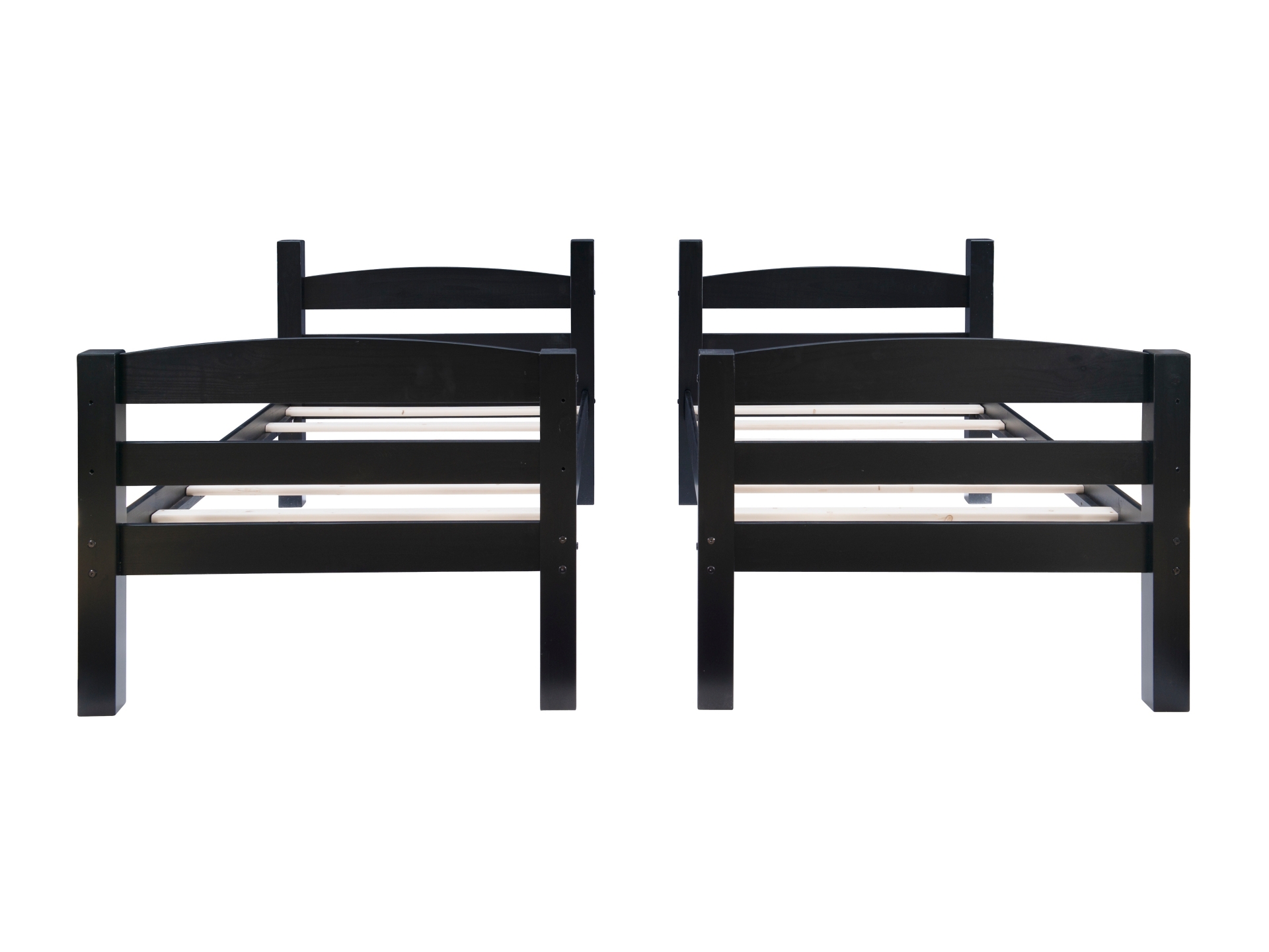 Combining classic style with a sleek modern look, this bunk bed is made for today’s youth. The bunk bed is made of pine wood and offers extra room for guests or siblings, featuring a twin bed over a twin bed. The headboard and footboard have a curved slat detail with sturdy square posts. The ladder is built-in and the heavy, duty slats will support a mattress without needing a bunkie board. Beds can be detached to convert into separate twin beds for versatility. Made to withstand, the beds have a 400 lb static weight limit for each bunk surface. Black finish. Mattresses not included