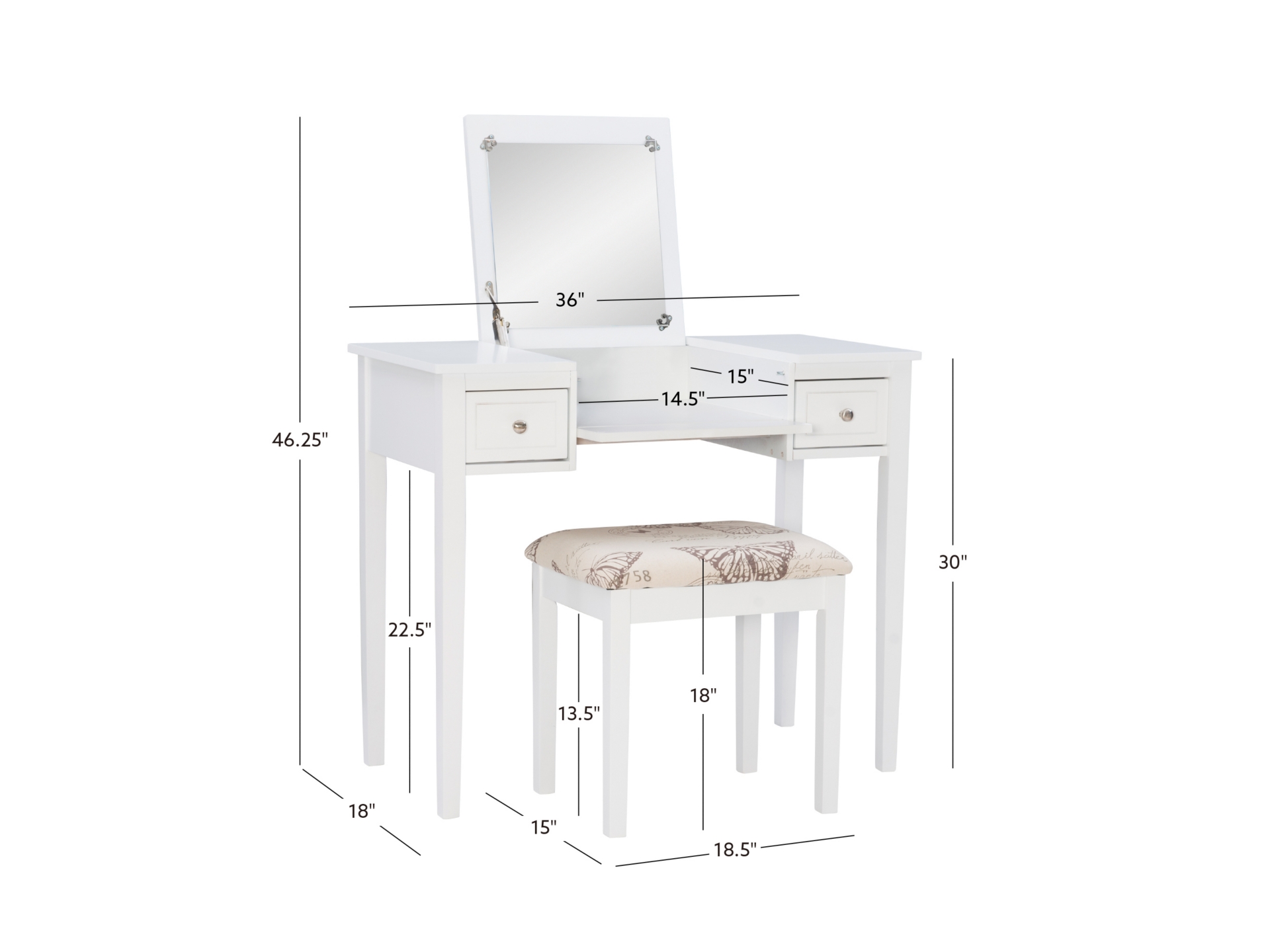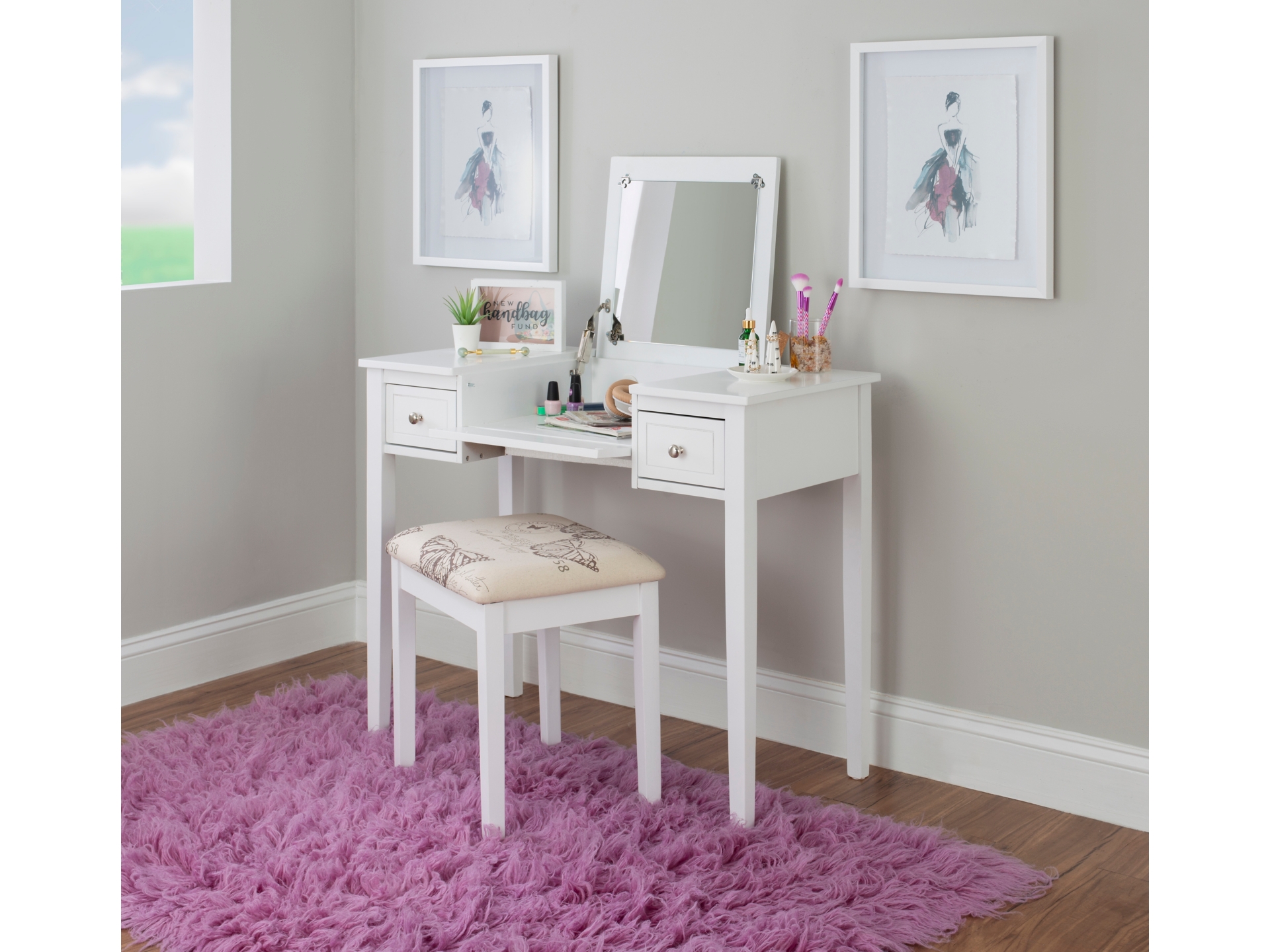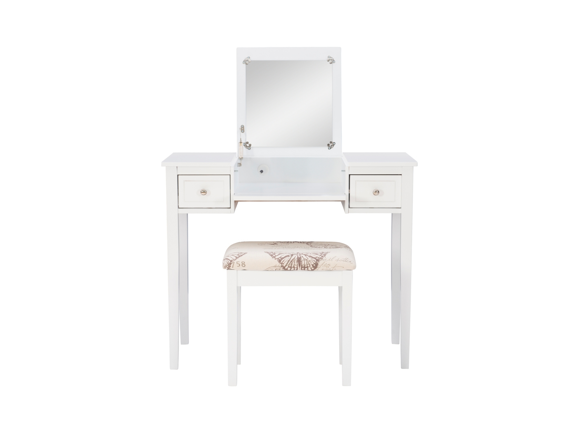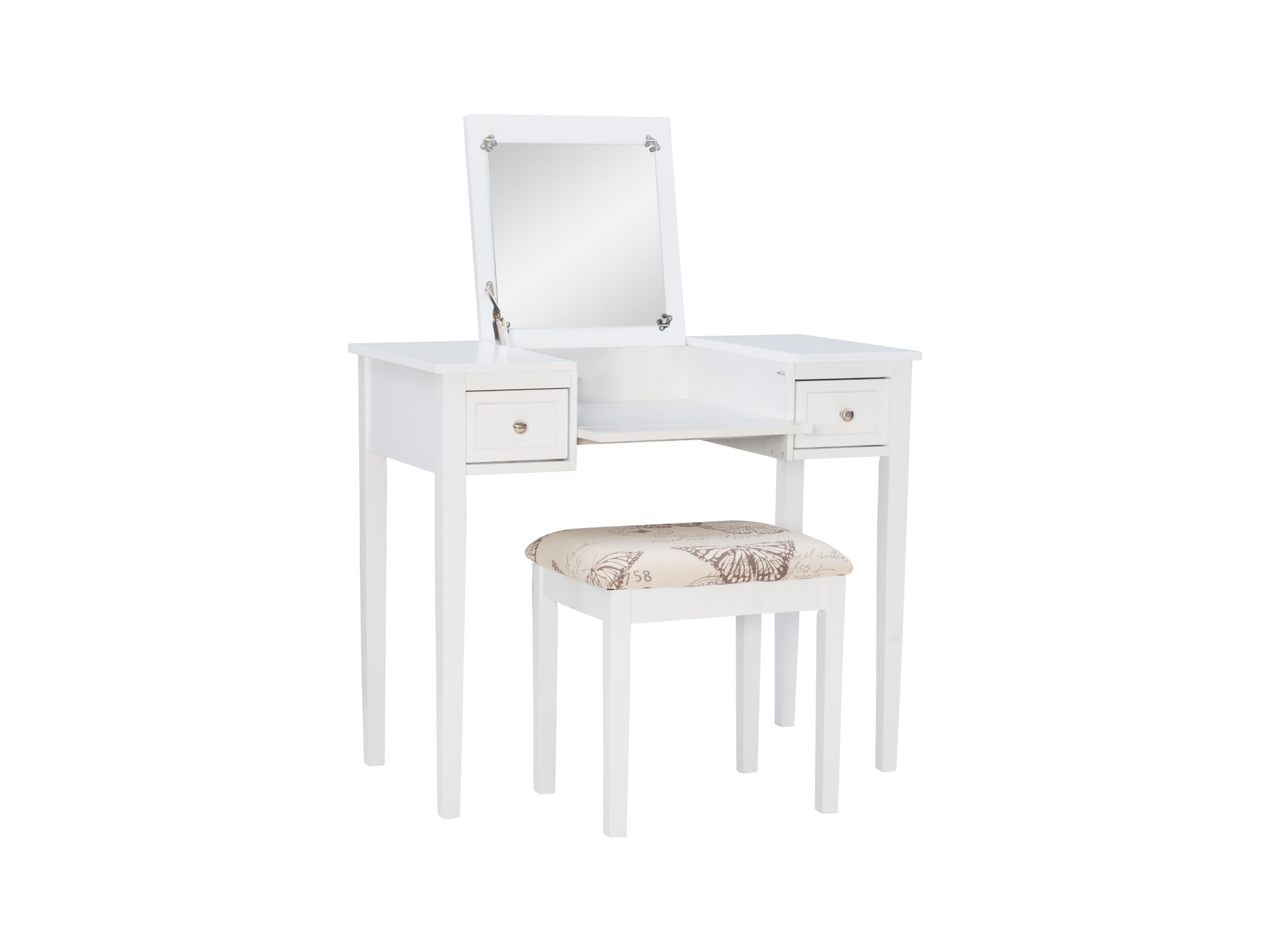 Create a beautiful space that’s personal, stylish and full of function with the White Butterfly vanity set. Its flip top mirror with safety-stay hinge offers lots of versatility. Simply flip the mirror down when not in use and enjoy a handy flat surface. The two drawers are generously sized and the table top is spacious—perfect for storing an array of cosmetics, jewelry and beauty supplies. A flip down front panel opens for easy access to your possessions. A thickly padded upholstered stool is included. Ideal for teens and adults, set up in a bedroom or dressing area.