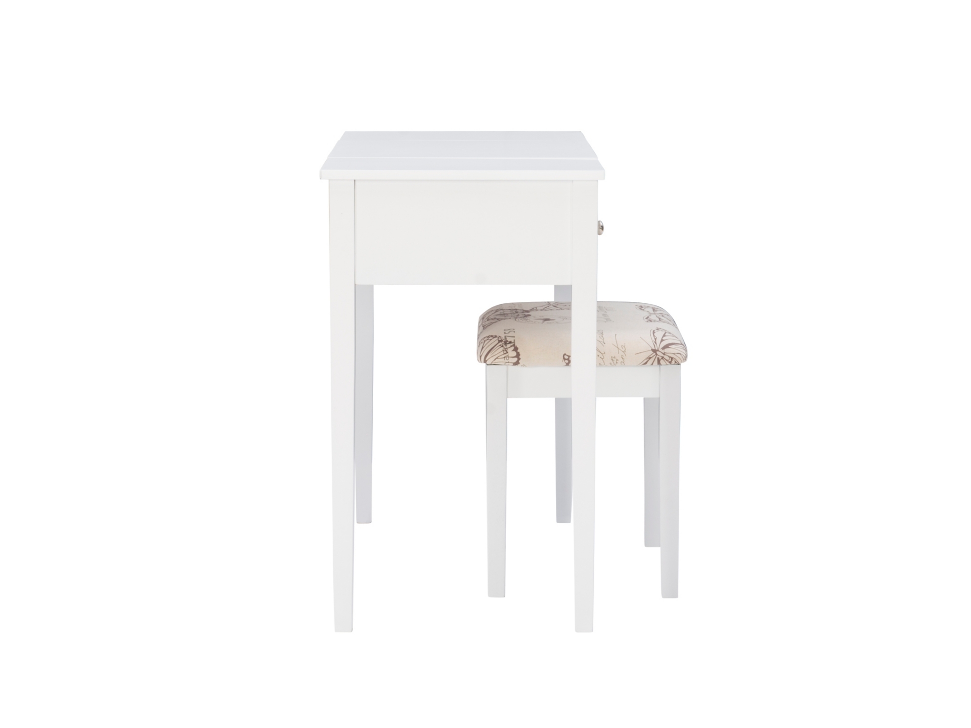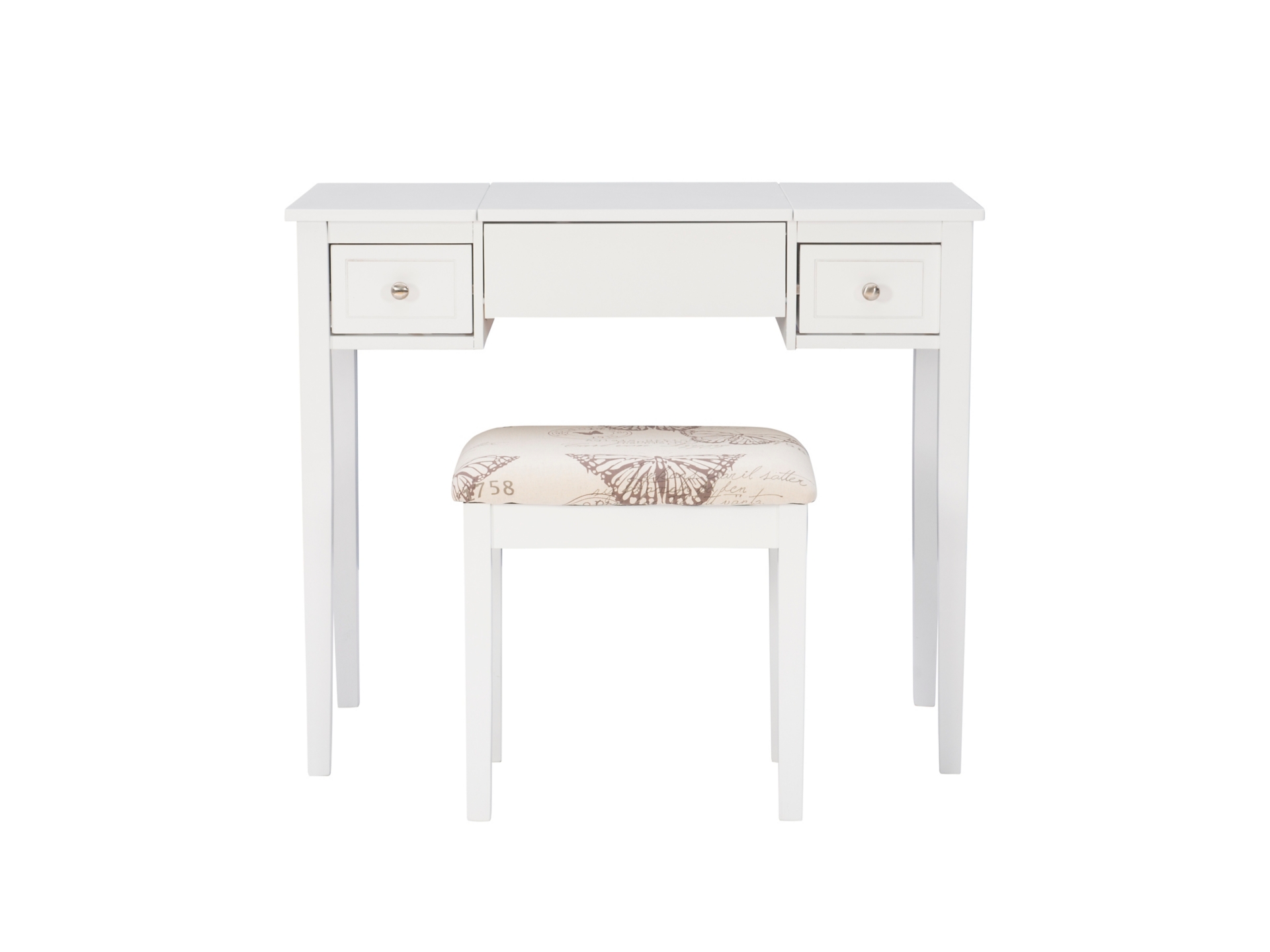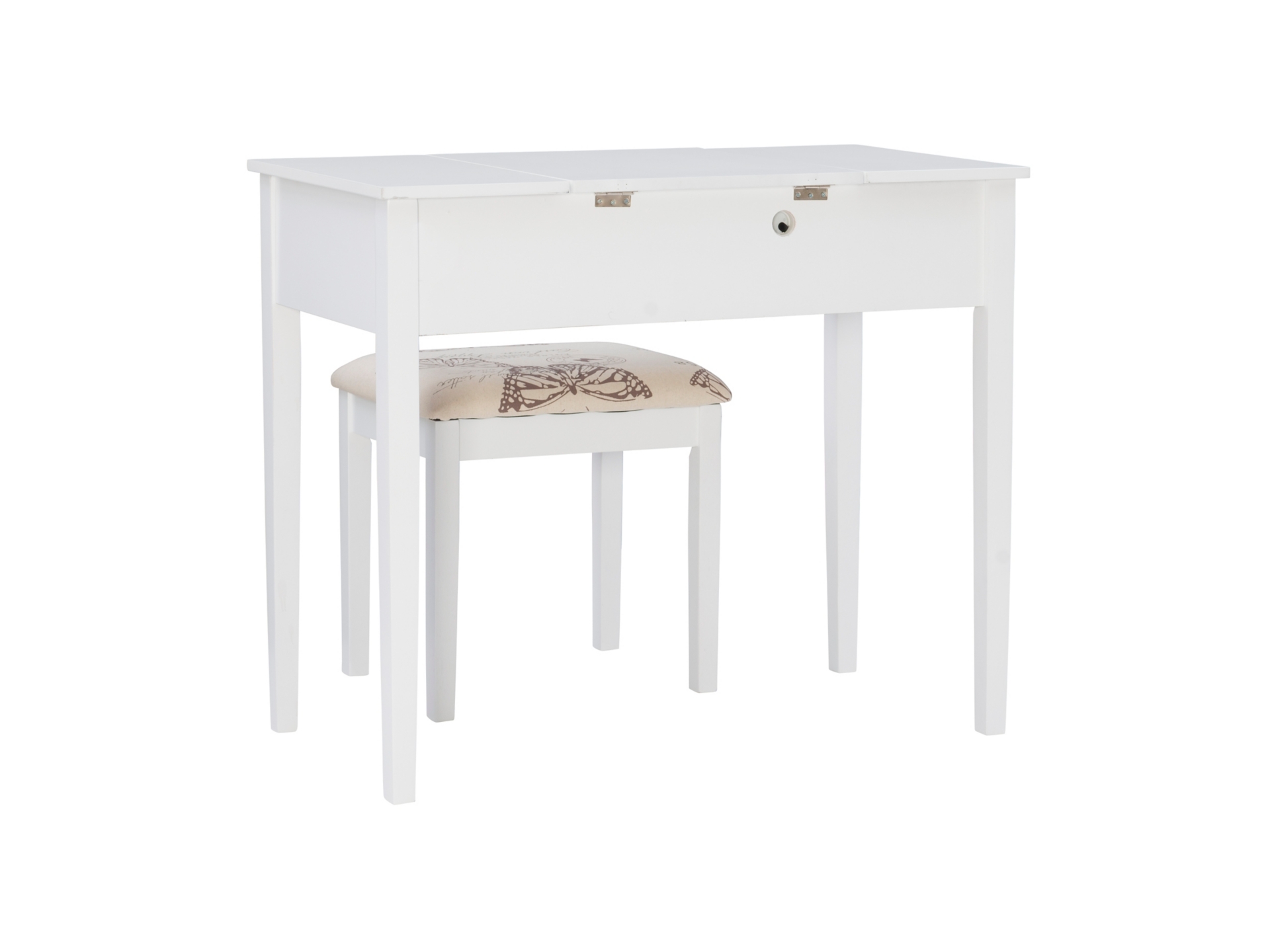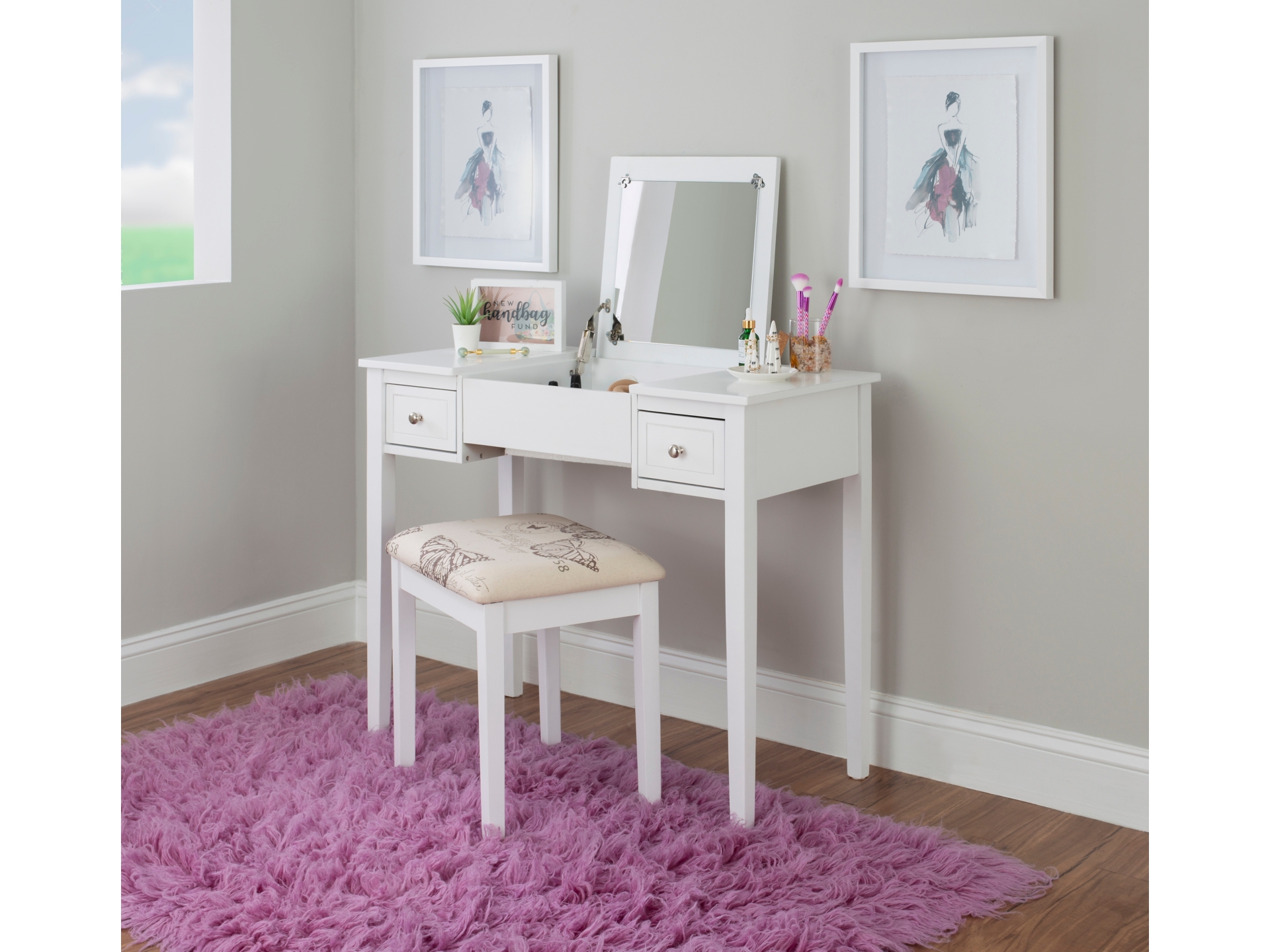 Create a beautiful space that’s personal, stylish and full of function with the White Butterfly vanity set. Its flip top mirror with safety-stay hinge offers lots of versatility. Simply flip the mirror down when not in use and enjoy a handy flat surface. The two drawers are generously sized and the table top is spacious—perfect for storing an array of cosmetics, jewelry and beauty supplies. A flip down front panel opens for easy access to your possessions. A thickly padded upholstered stool is included. Ideal for teens and adults, set up in a bedroom or dressing area.