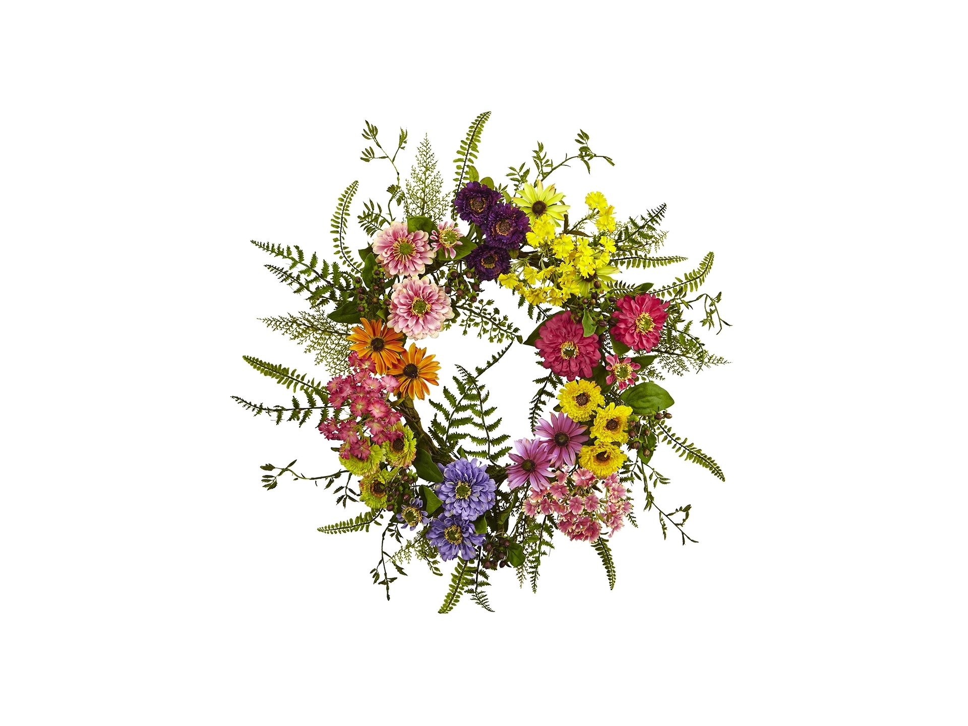 Frame the entryway with summertime florals that never wilt. Bursting with color, this faux floral wreath charms with handcrafted garden flowers meticulously placed for a lifelike appearance. What a cheerful way to welcome guests at your front door.