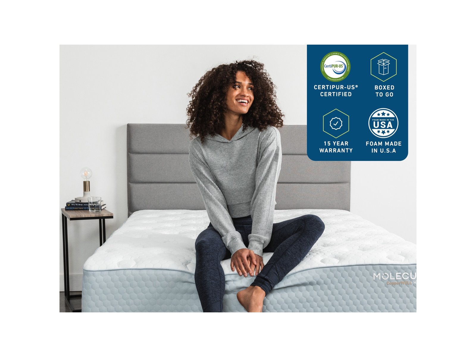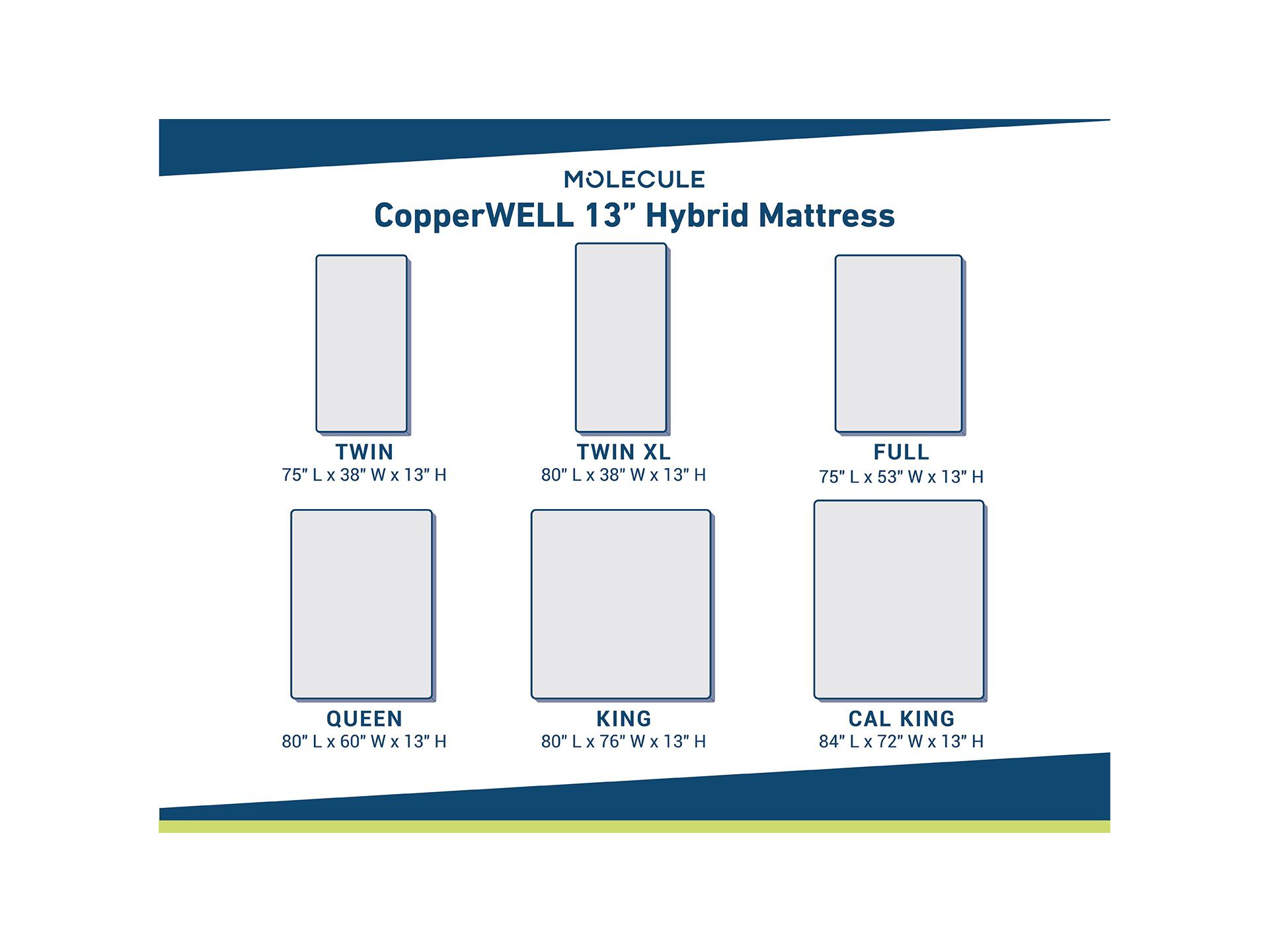 The MOLECULE CopperWELL Hybrid 13-inch mattress helps you achieve your best night’s sleep with MOLECULEedge foam encased coils for advanced edge support. The innerspring system absorbs movement to deliver a consistent sleep surface regardless of height or weight. The CopperWELL copper-infused gel memory foam provides the perfect blend of pressure relief and support with active heat transfer. A cool-touch cover features antimicrobial mattress protection for lasting fresh comfort. Ultra-targeted support helps keep your body in optimal alignment for deeply restorative sleep. MOLECULE is tested and approved by the world’s elite athletes, including Alex Morgan and Michael Phelps, helping them rest and recover while they sleep so they can maximize their performance during the day. Sleep like a Champion. Sleep on MOLECULE.