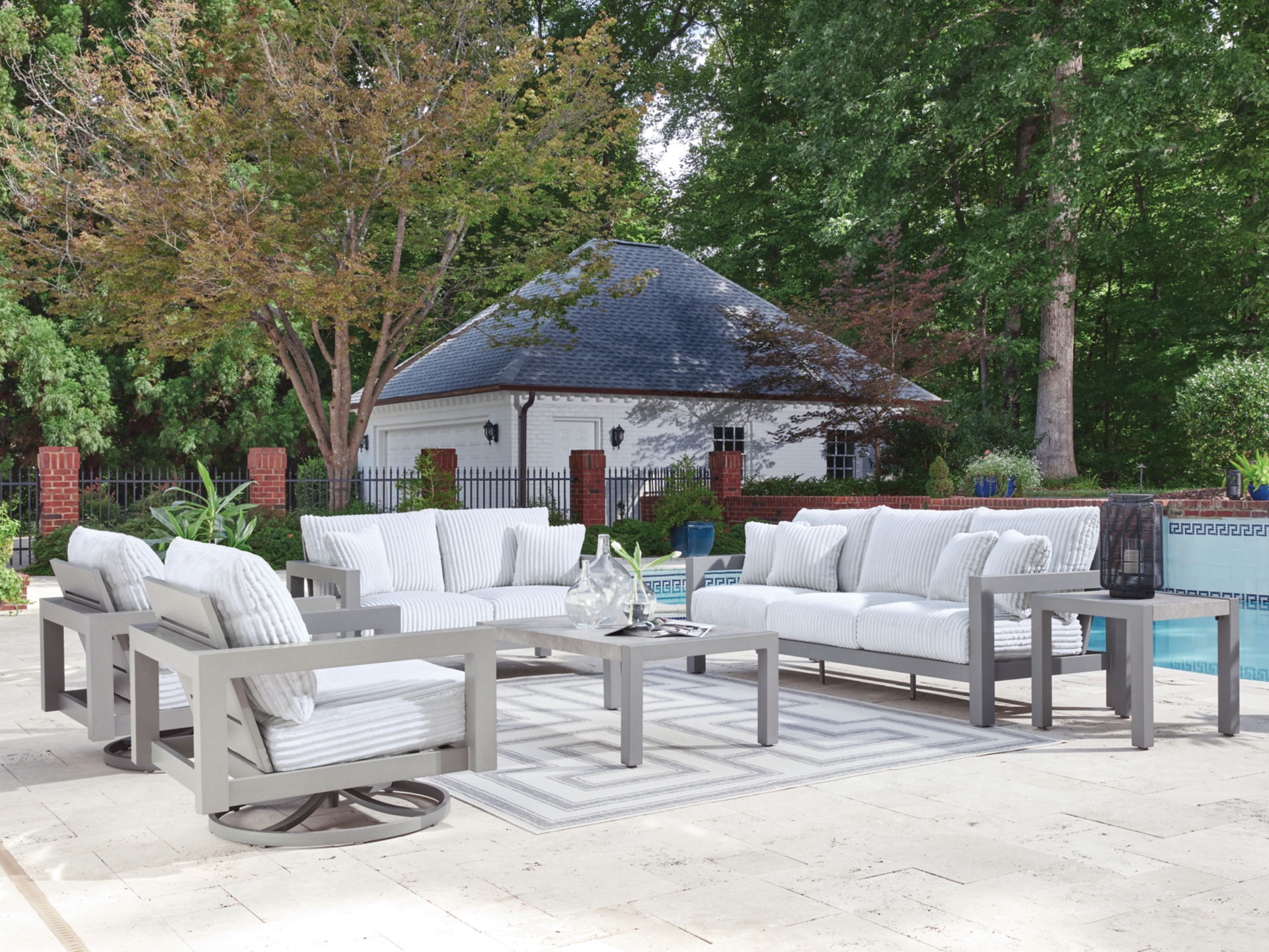 Zippered cushions and throw pillows covered in solution-dyed high-performance fabric