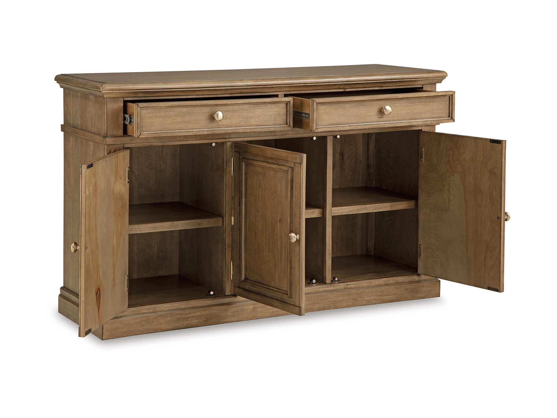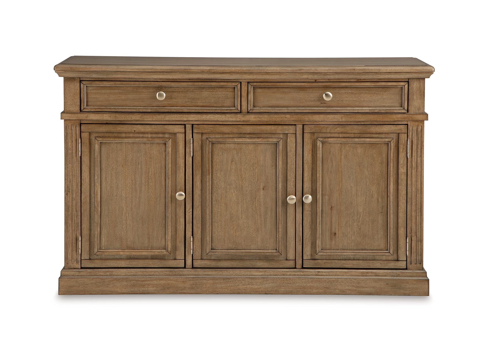 Take a traditional approach to dining room aesthetics. The Mylarken dining server ushers an upscale feel into your space, with meticulous details like fluted pilasters and elegant drawer moulding. A light wood tone brings warmth to the sculptural silhouette. Grand in both beauty and function, this transitional server is a masterclass in refinement.