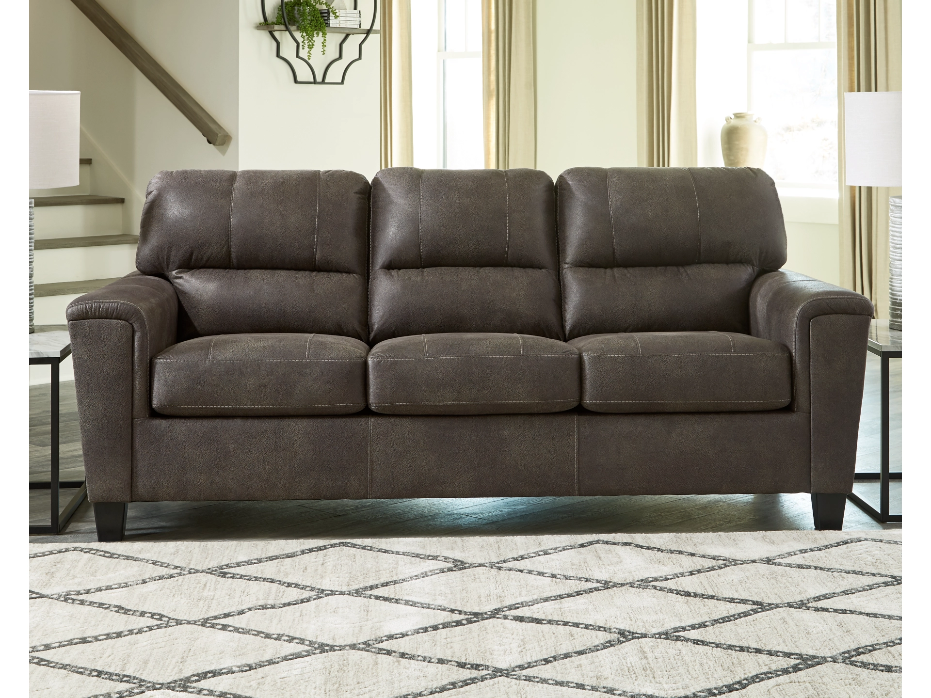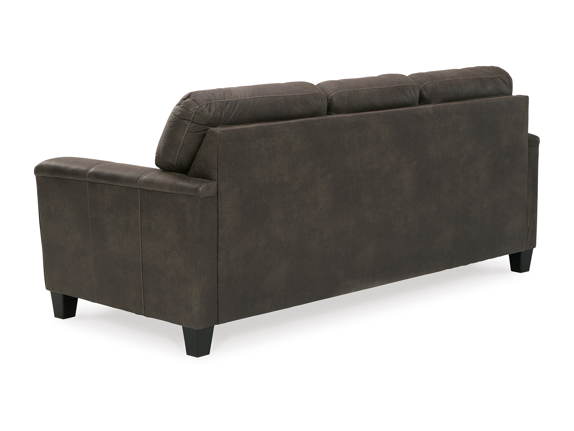 If you love the cool look of leather but long for the warm feel of fabric, you can take comfort in the Navi queen sofa sleeper. Wrapped in a fabulous faux leather with a weathered hue and hint of pebbly texture to resemble the real deal, this decidedly modern sofa proves less is more. Elements include angled side profiling and track armrests wrapped with a layer of pillowy softness for that little something extra. Prominent jumbo stitching and clean-lined divided back styling lend fashion-forward flair. Rest assured, the queen memory foam mattress comfortably accommodates overnight guests.