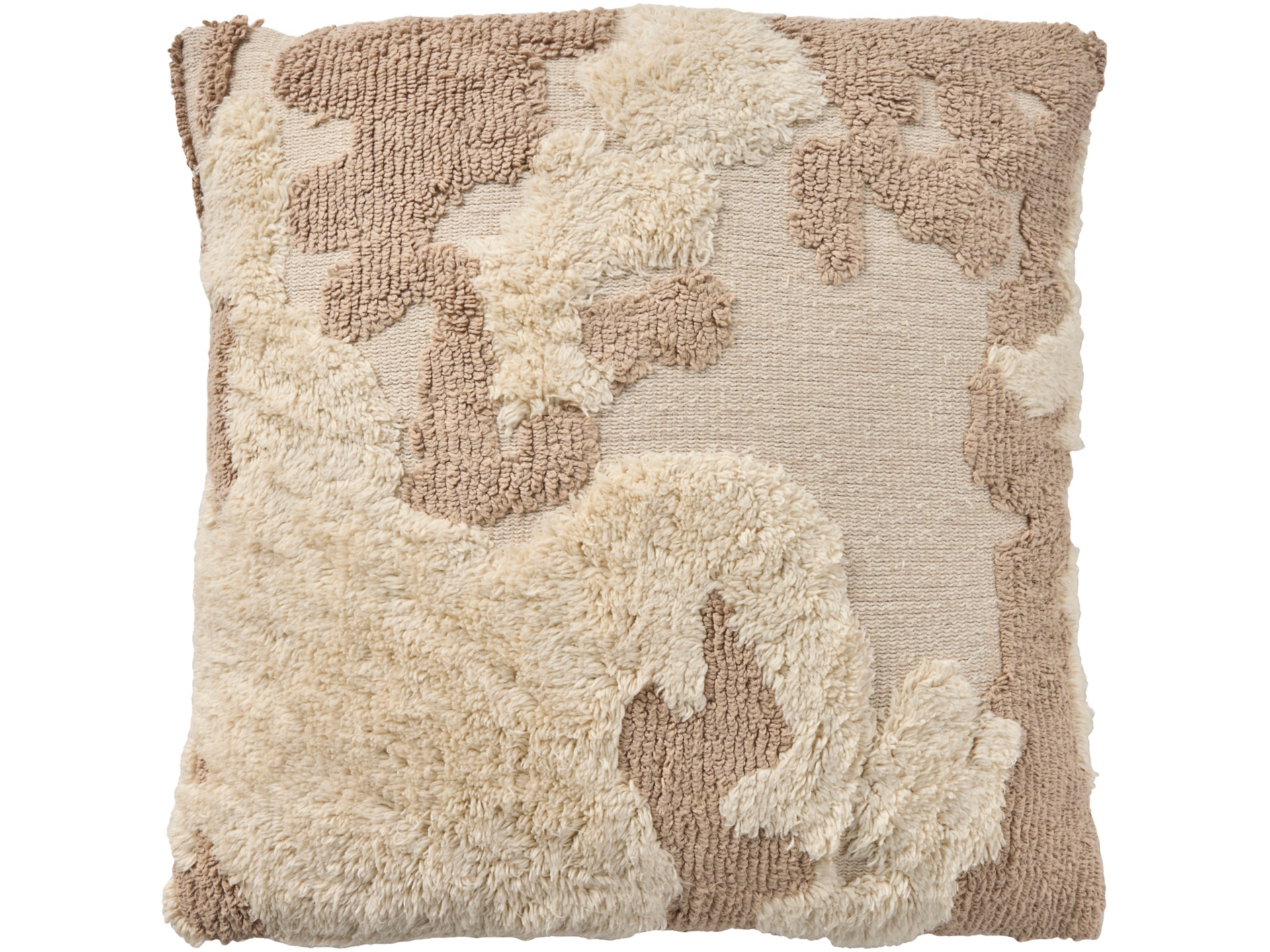 Textured throw pillow with a dimensional blend of tufted and loops yarns