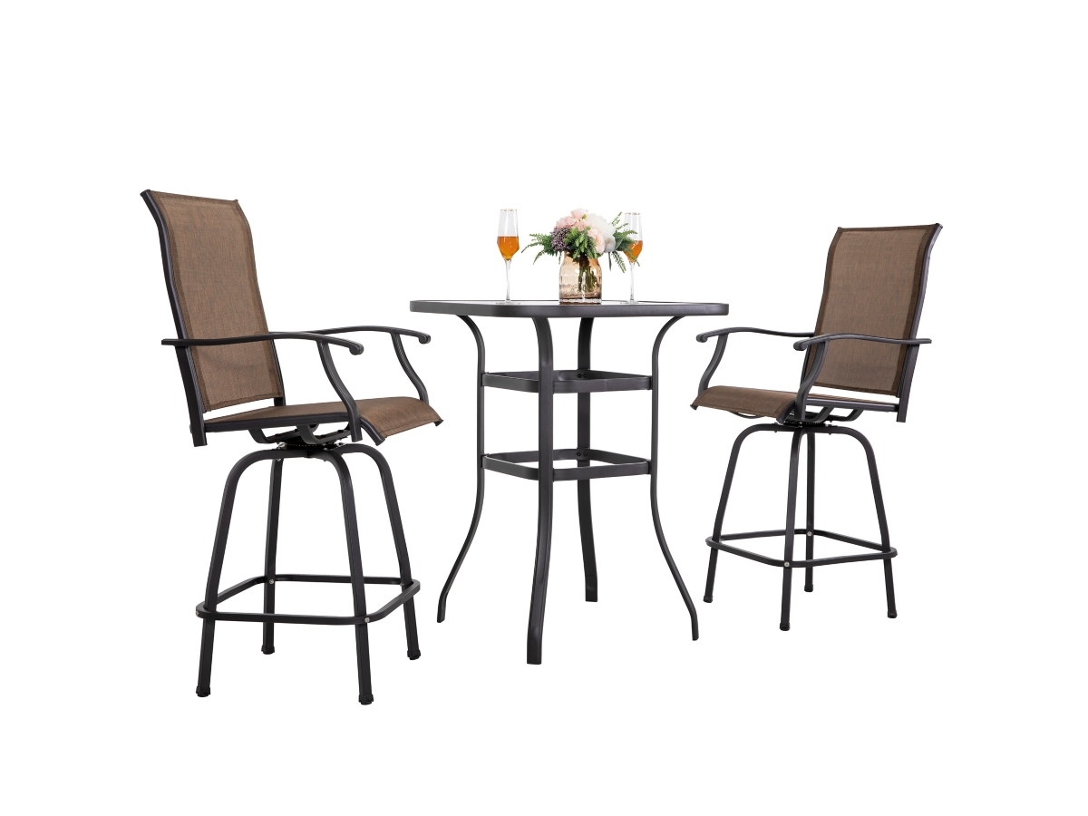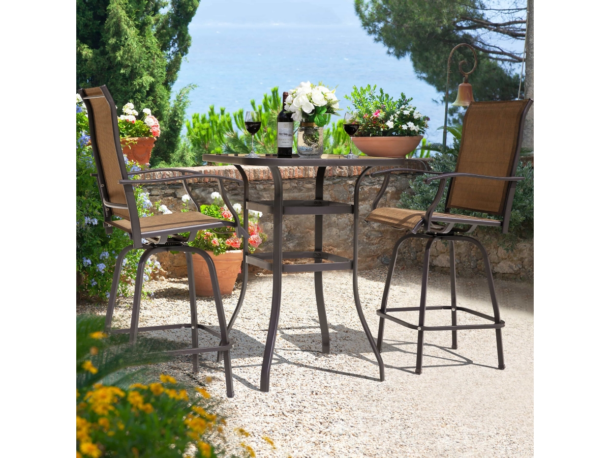 Every outdoor dining space needs a patio table, make it interesting with this three-piece outdoor patio bar set. The table’s svelte iron top can be the center for conversation as well as to hold the drinks for your BBQ. The table has attractive bowed legs and the welded frame adds durability and stability. The swivel bar chairs perfectly create the mood for great conversation and cafe style dining. This set is an ideal choice for outdoor amusement in the garden, on the porch or in the yard, this two-piece bistro set makes a lovely relaxing environment where you can catch up with friends or family over coffee or a glass of wine.