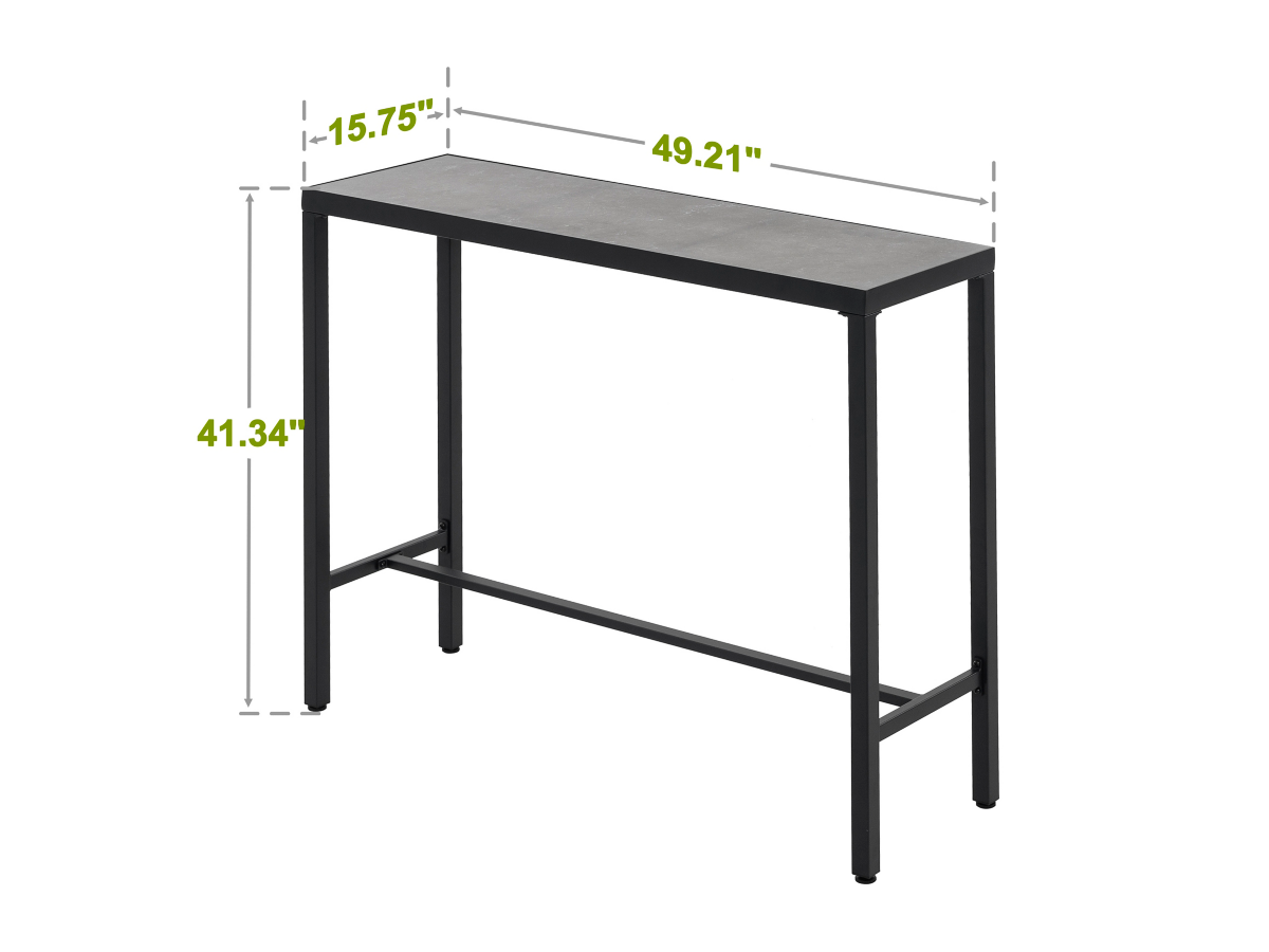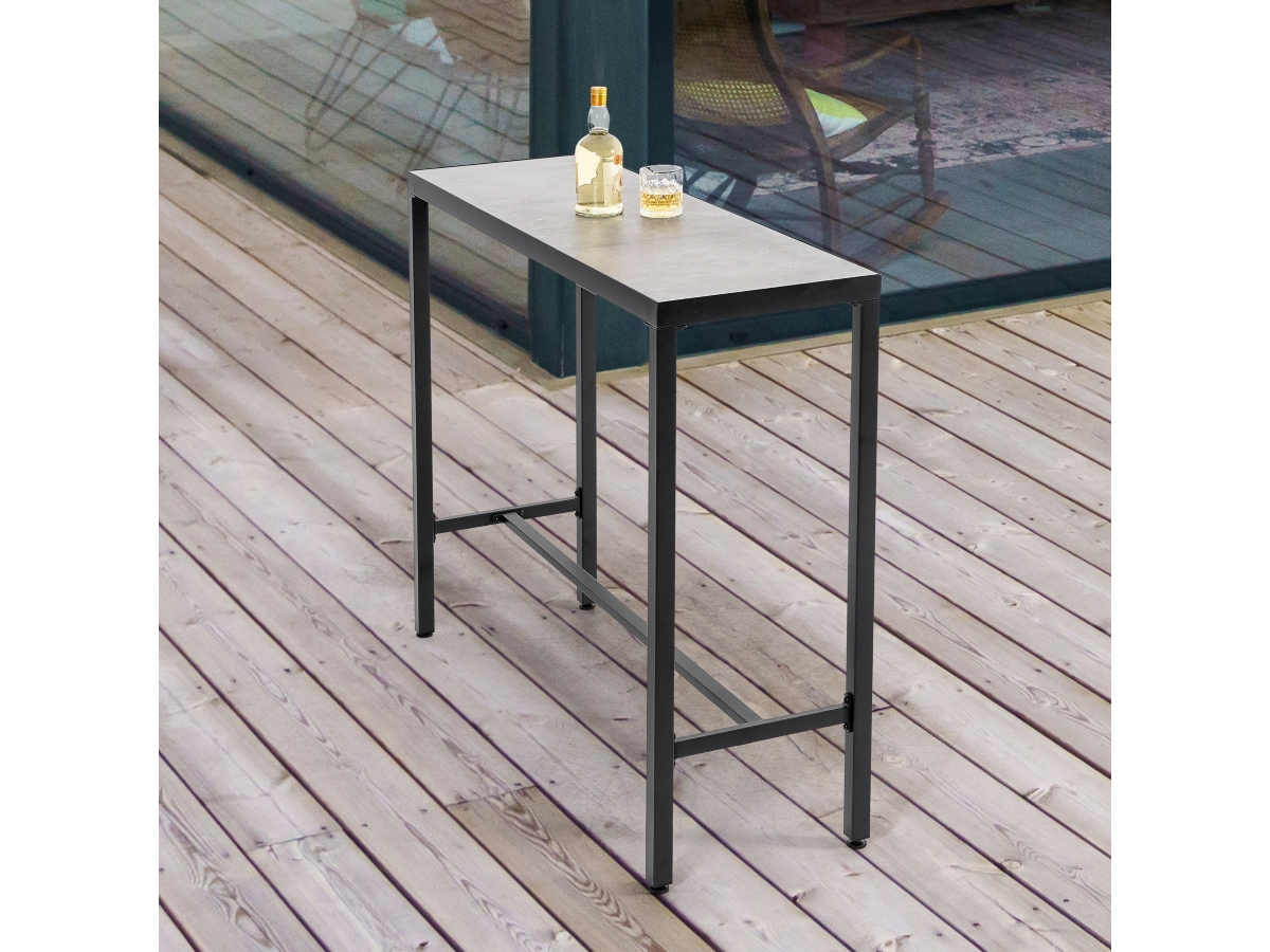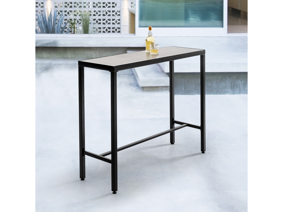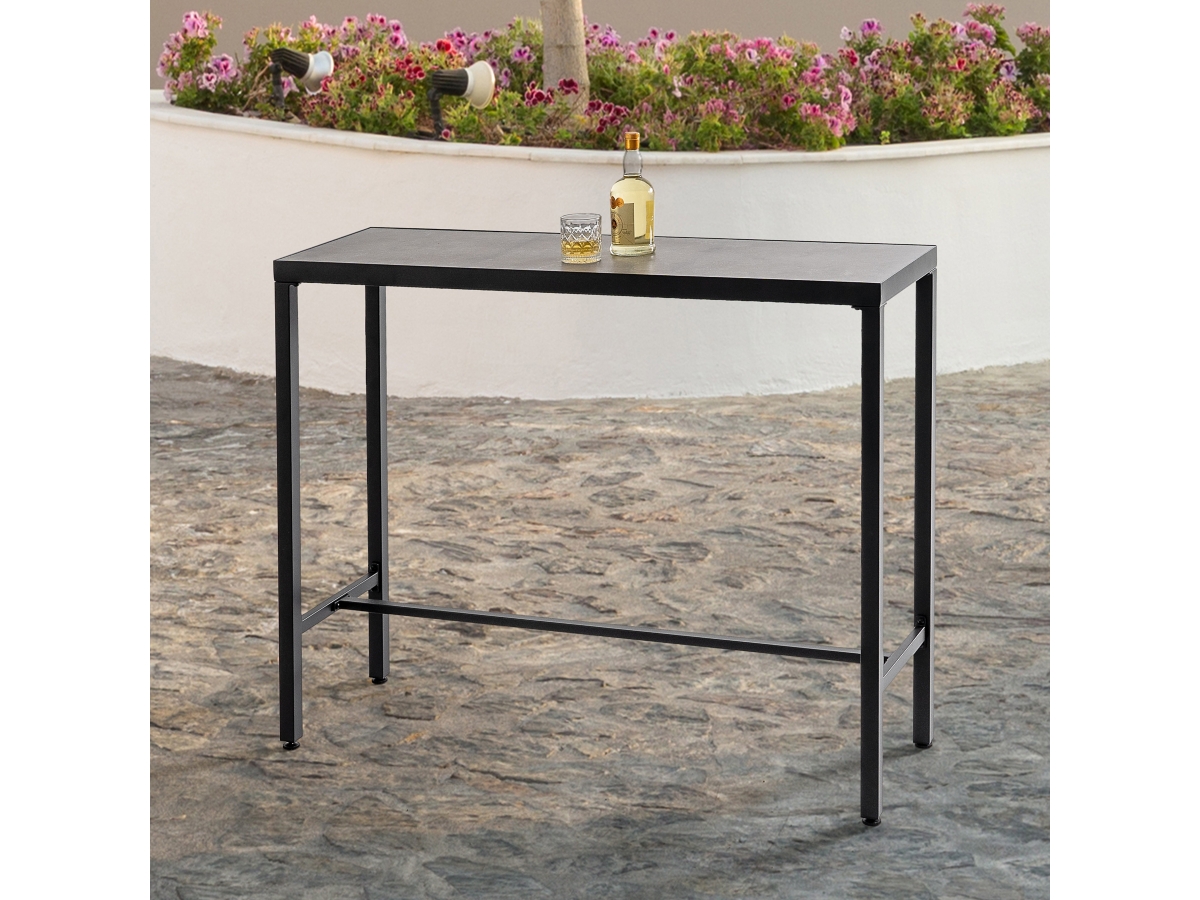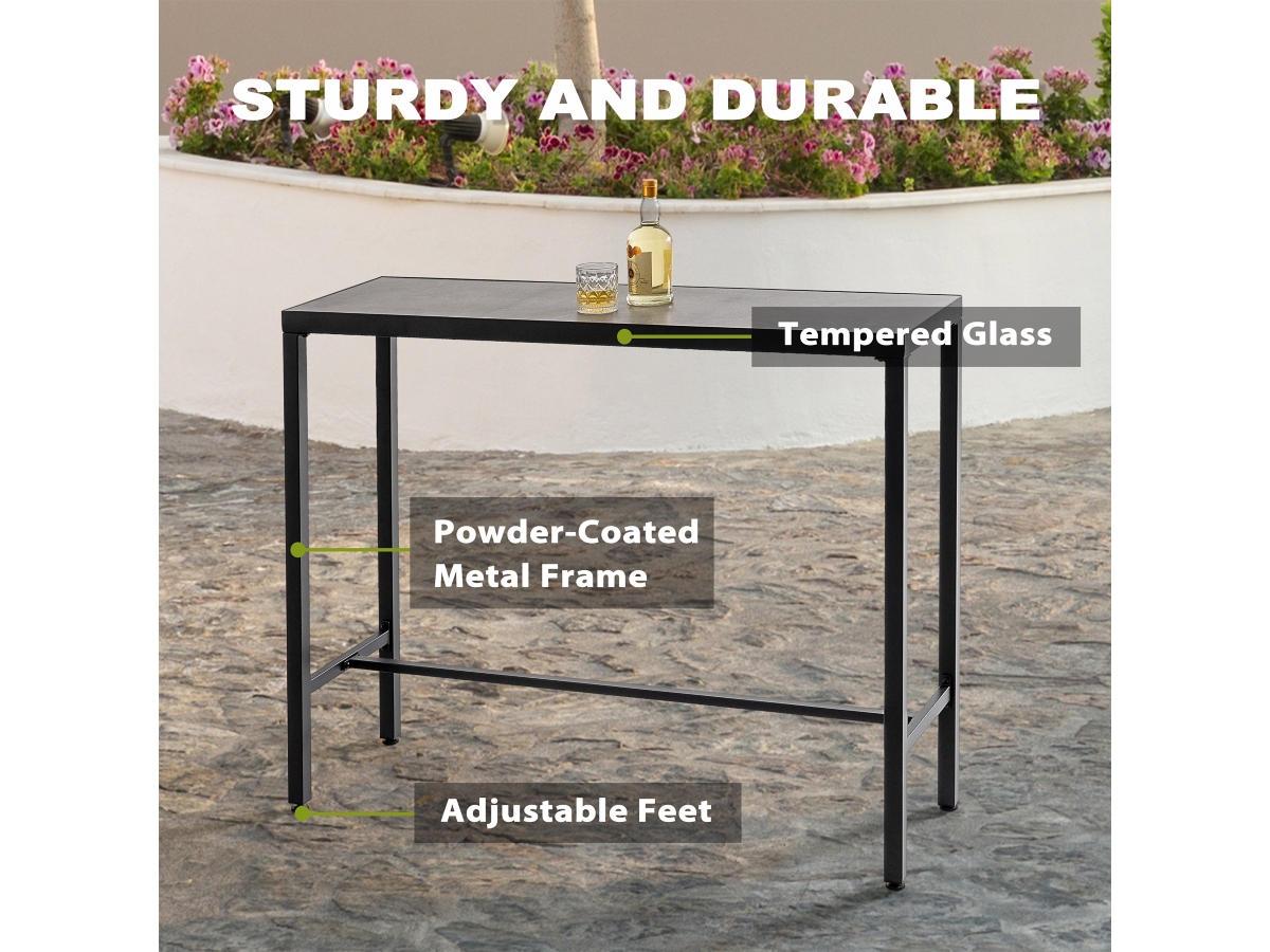 Boasting an impact-resistant 3D-print tempered glass tabletop finished in a timeless black coating, our Nuu Garden Outdoor Iron Rectangular Bar Table radiates elegance. Its adjustable feet offer stability on any terrain, while a comfortable footrest enhances relaxation. Crafted with sturdy iron legs and reinforced by horizontal bars, durability and stability are assured. Maintenance is effortless with easy tabletop cleaning. Comprehensive assembly instructions ensure a smooth setup. Elevate your outdoor space with this versatile and functional addition.