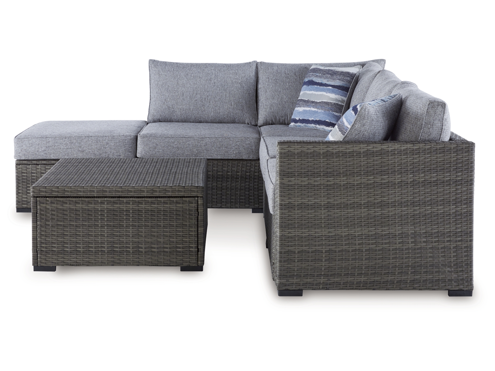 Includes modular loveseat sectional, ottoman and table