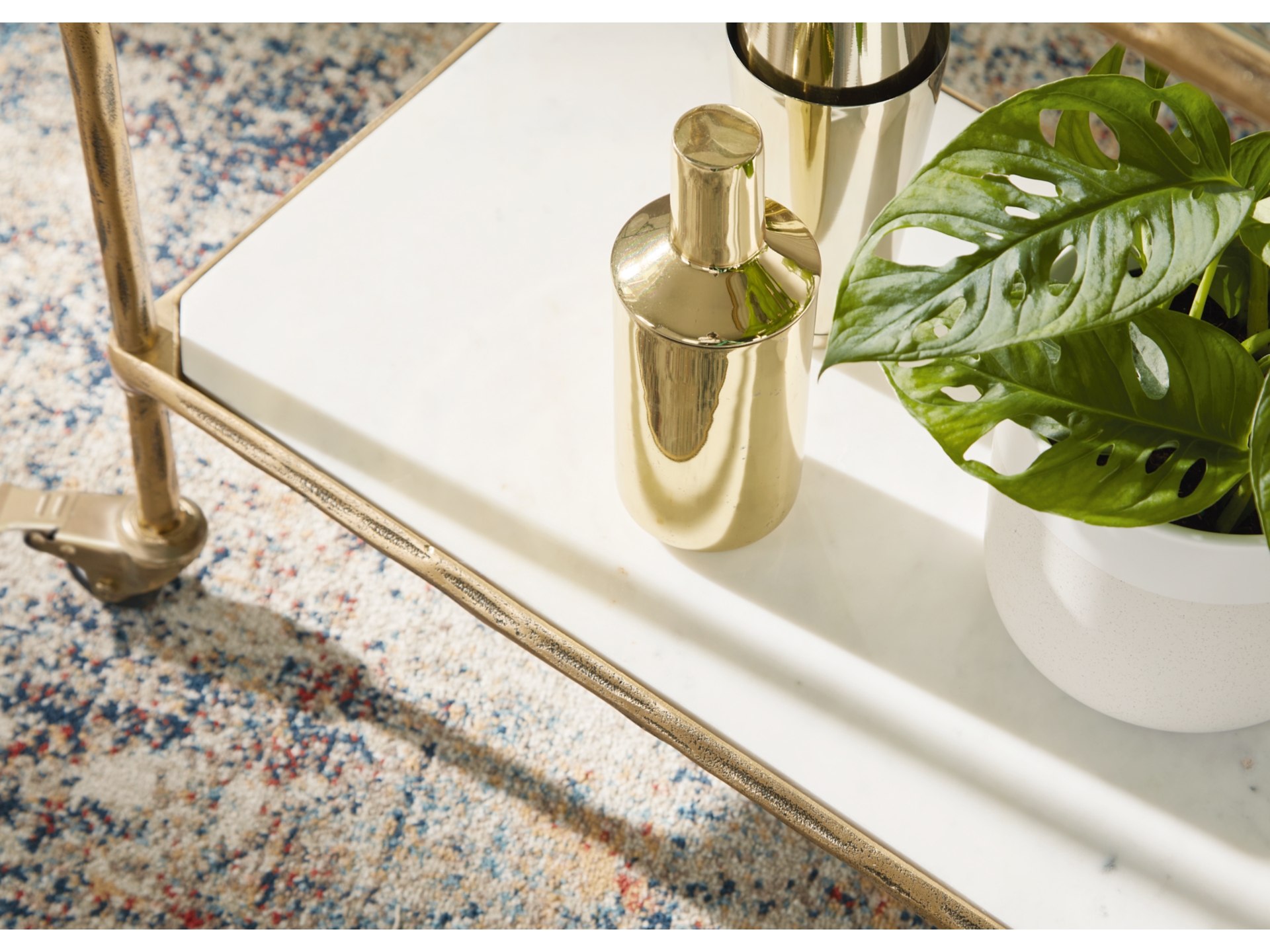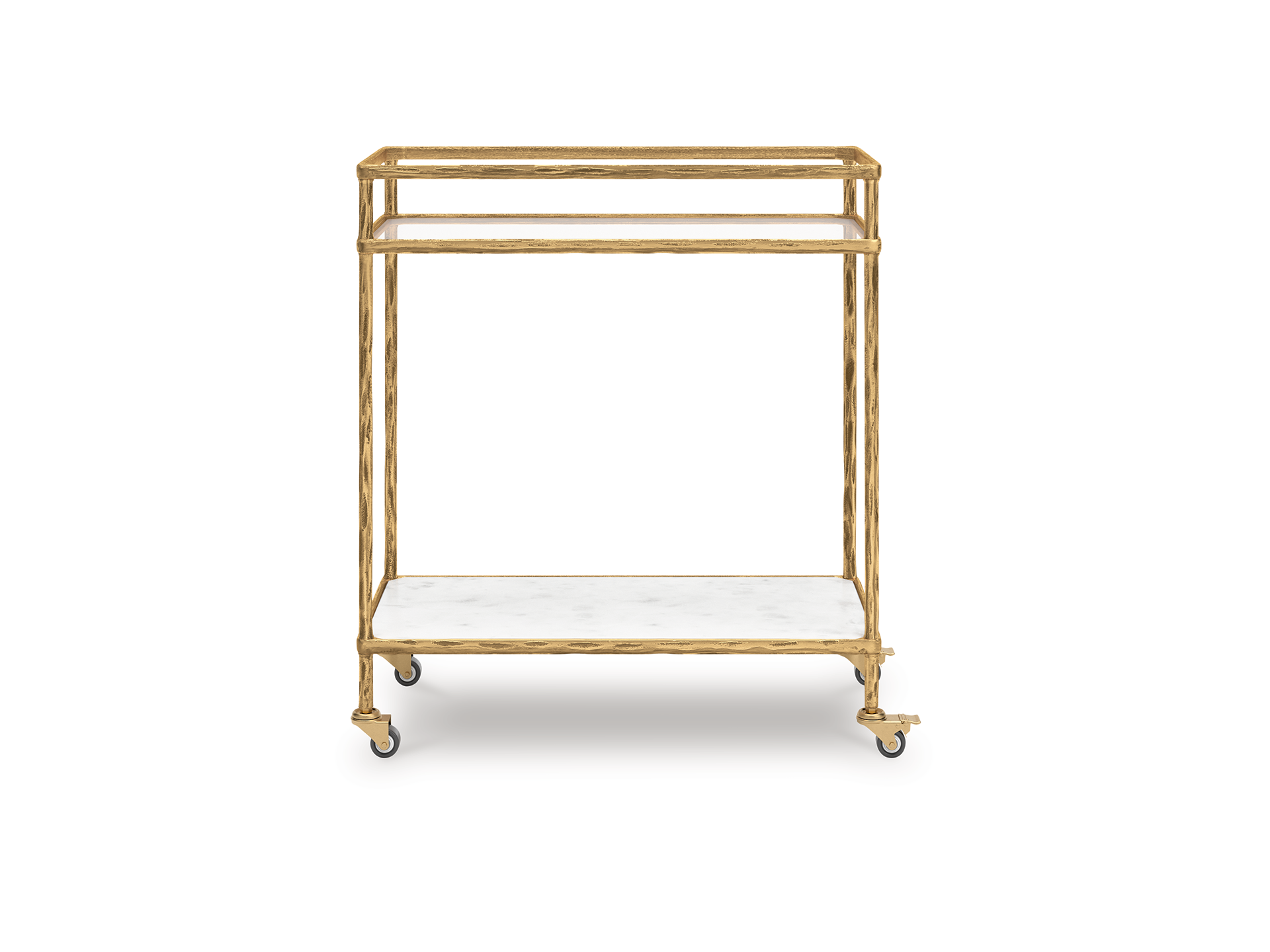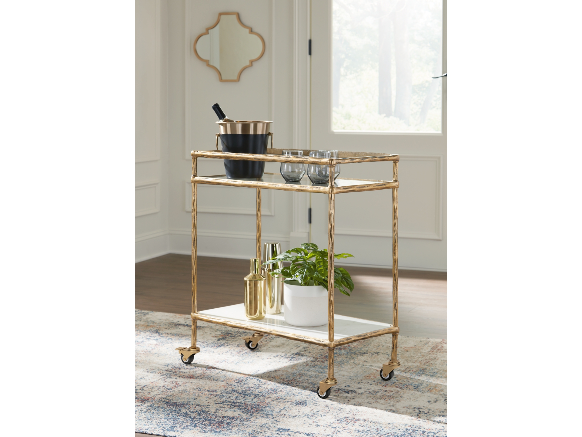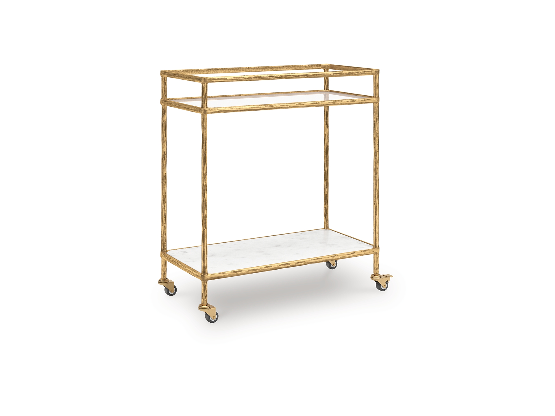 Store and serve in sleek style with the Plattfield bar cart. Its casually cool design combines an antiqued brass-tone frame with white marble and clear glass. Rails on the top shelf help bottles and shakers stay organized. And with its rolling casters, you can make your at-home mini bar mobile and bring the party where your guests gather. It can also act as a cute coffee station—perfect for storing syrups, mugs and other must-haves for your morning brew.