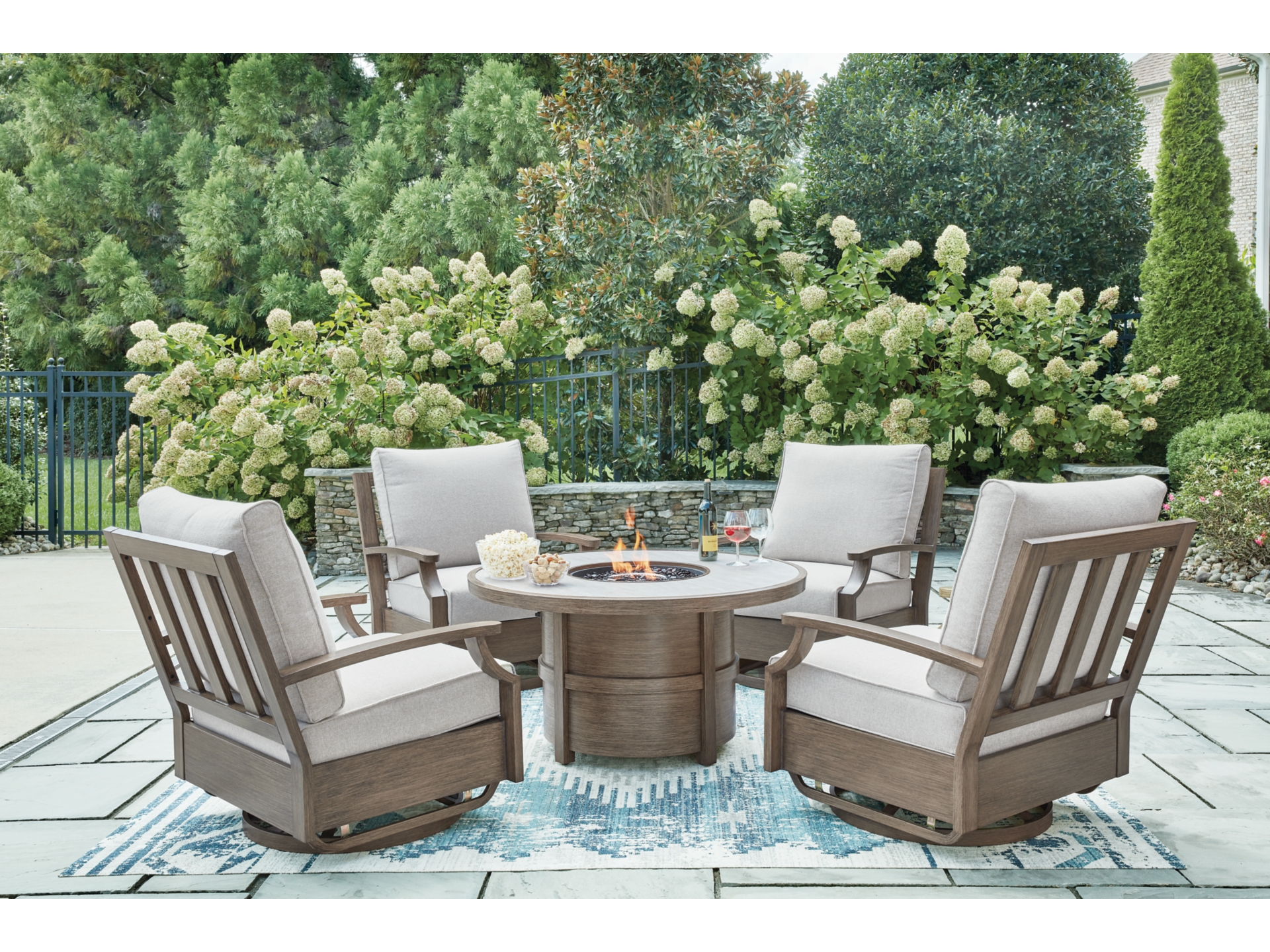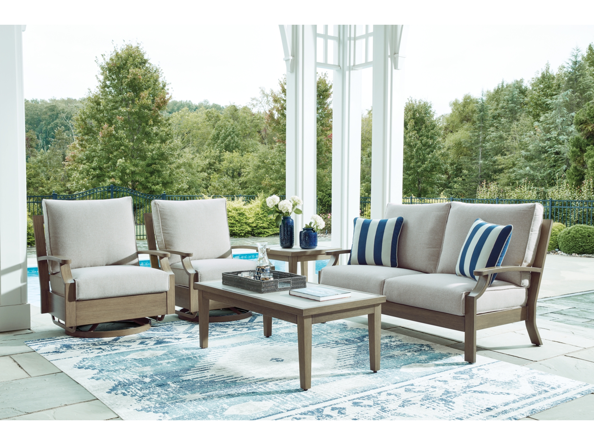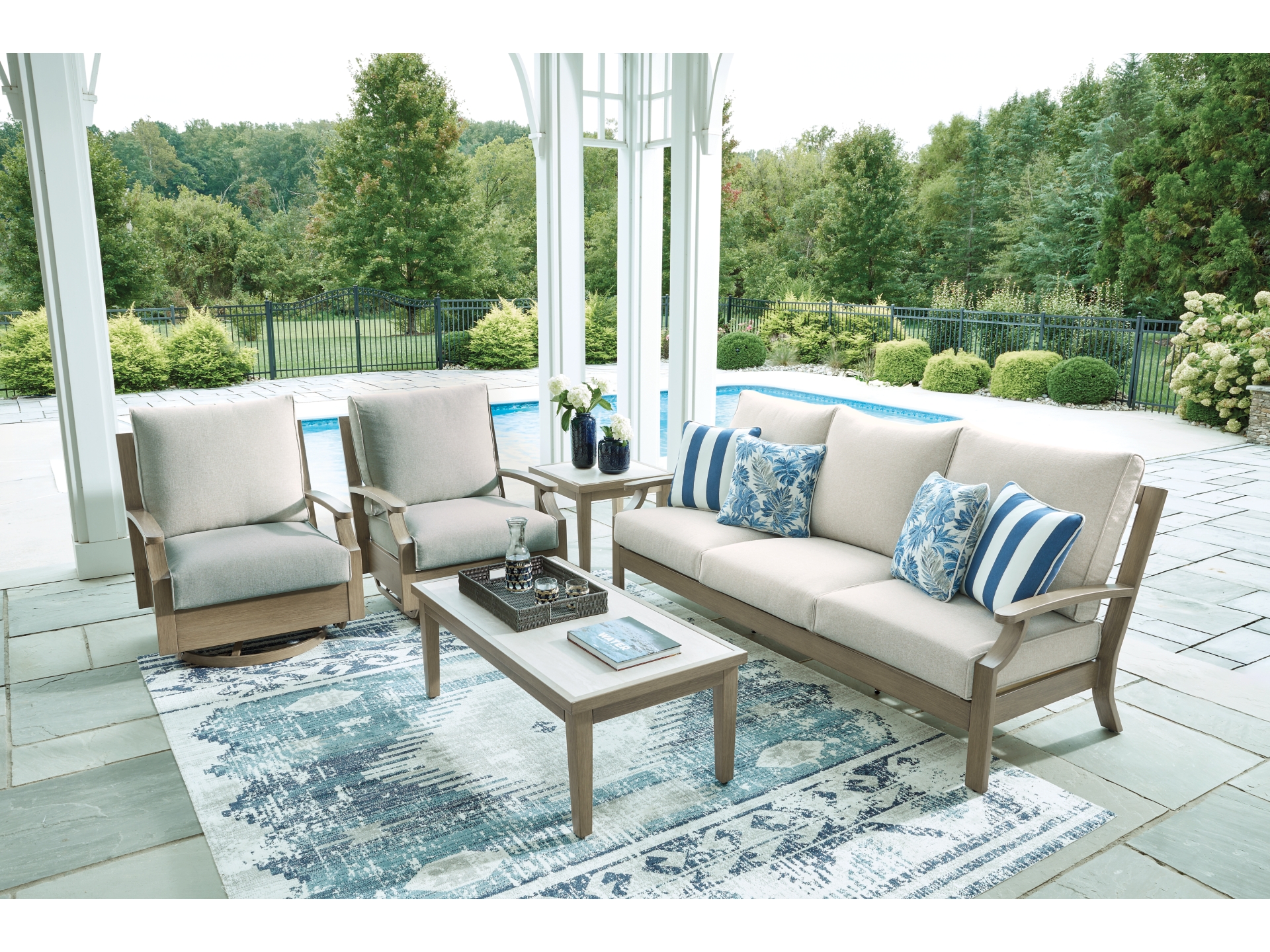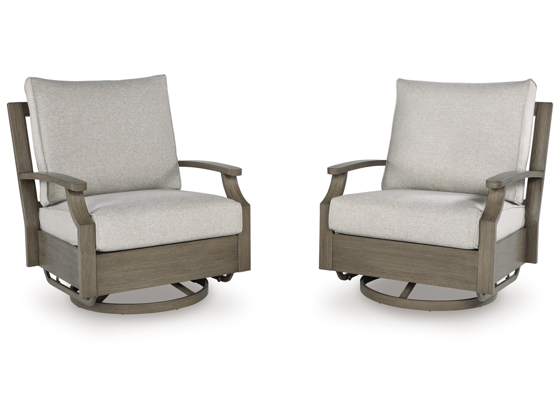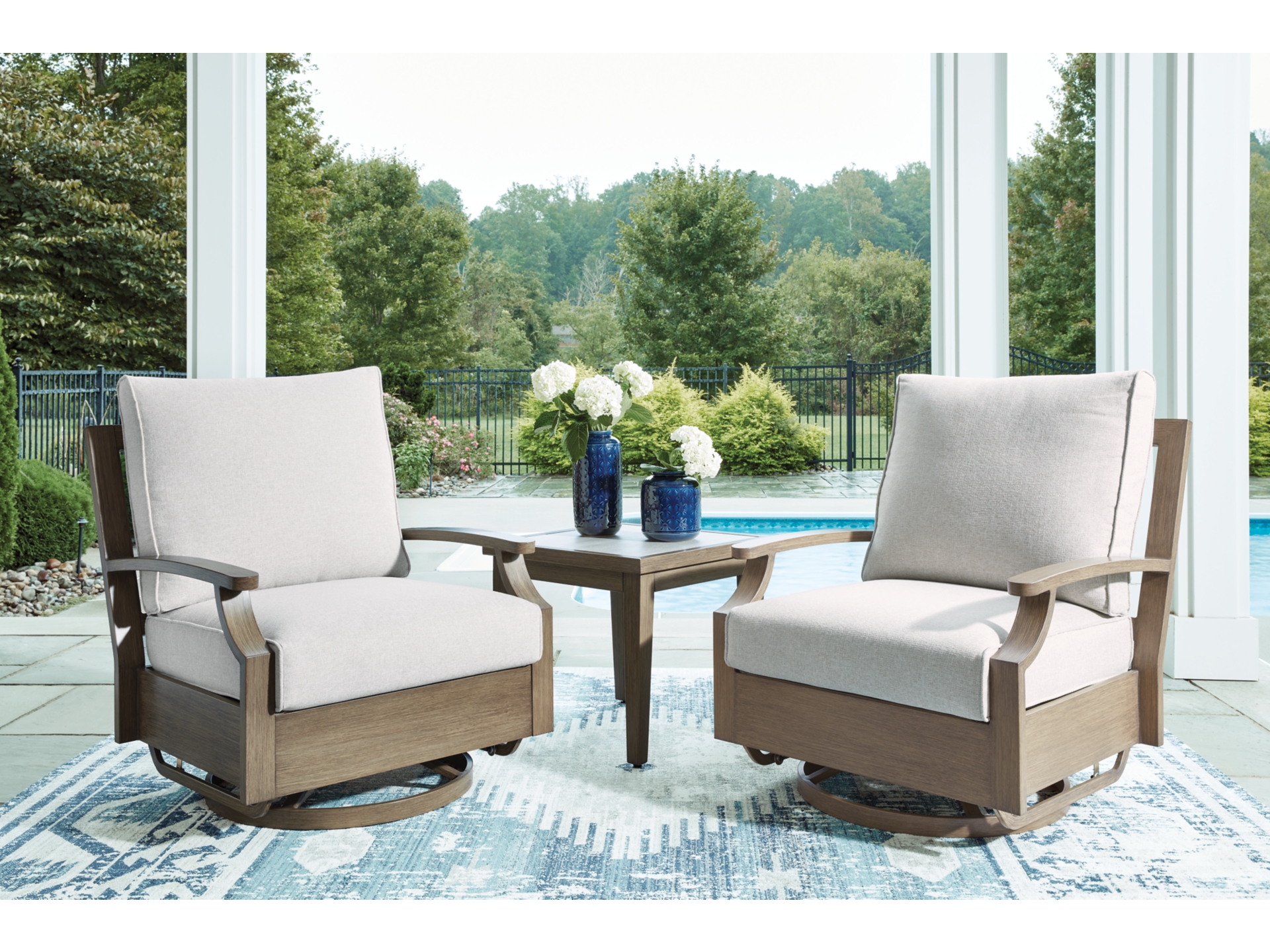 Experience the perfect combination of durability and style with the Rainier Ranch outdoor swivel glider chair. Enhanced by sumptuously soft cushions and throw pillows wrapped in high-performing, low-maintenance Nuvella+â„¢ fabric, it’s designed to provide you with years of enjoyment. This delightful addition to your outdoor space creates an oasis where comfort and beauty thrive.