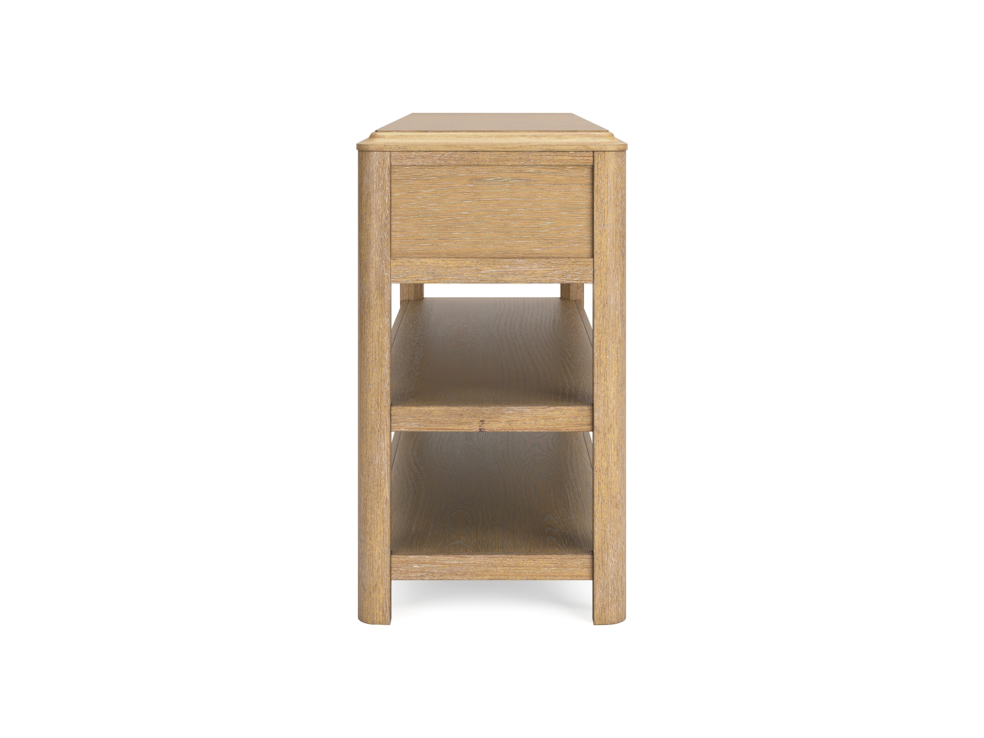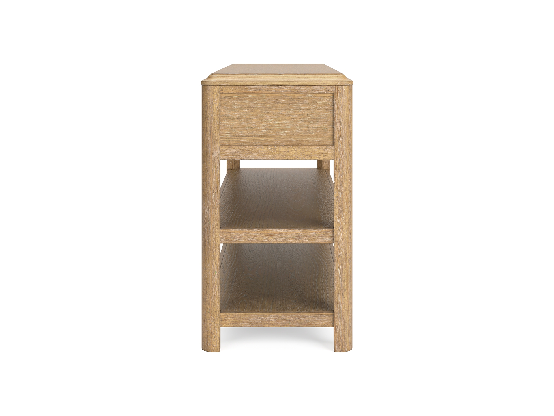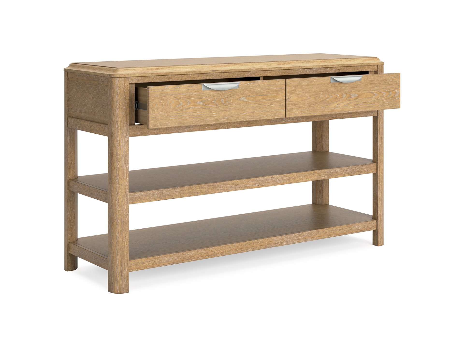 The Rencott dining server’s classic yet contemporary good looks are hard to deny. Softly shaped posts and a light oak finish with wire-brushed wood grain texture lend an organic appeal to your delicious dining space. The server’s drawers offer spacious storage for serving essentials, while its open shelves are ideal for fashionable display pieces.