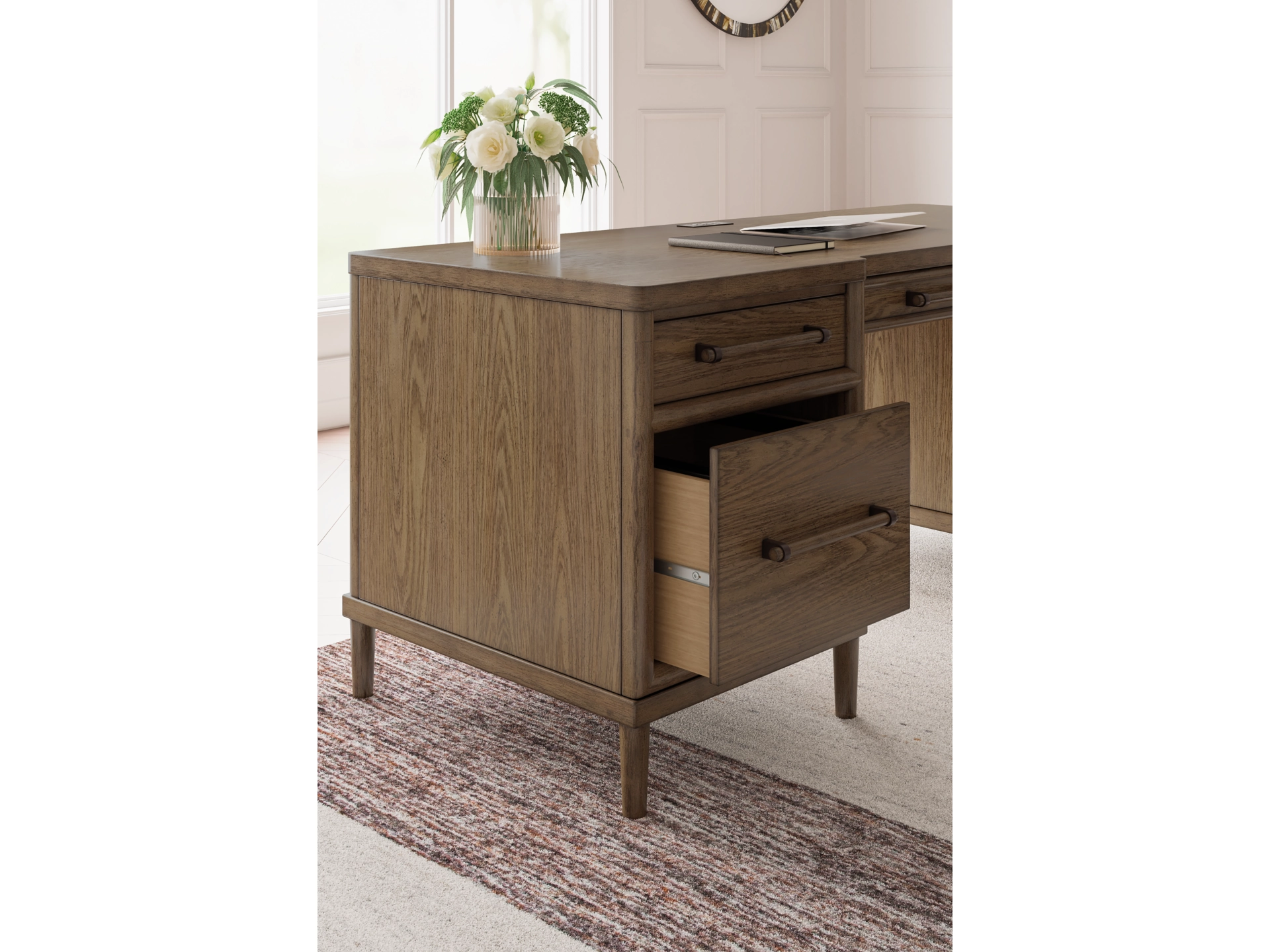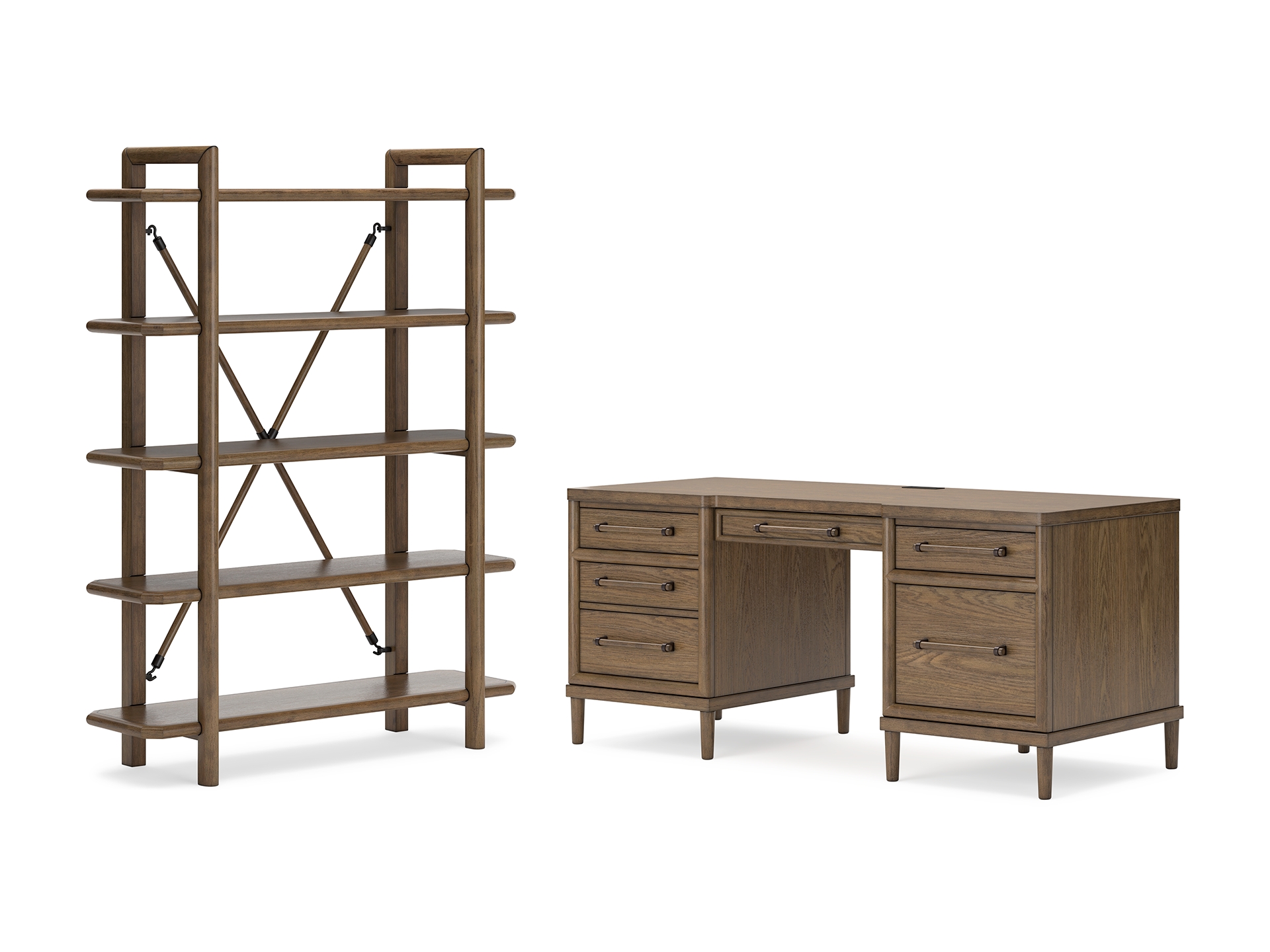 Give your mid-century modern decor that finishing touch with the Roanhowe home office desk and bookcase. Spacious drawers with unique wooden drawer pulls enhance the design with stunning style. This set takes minimalism to the max.
